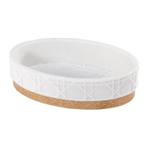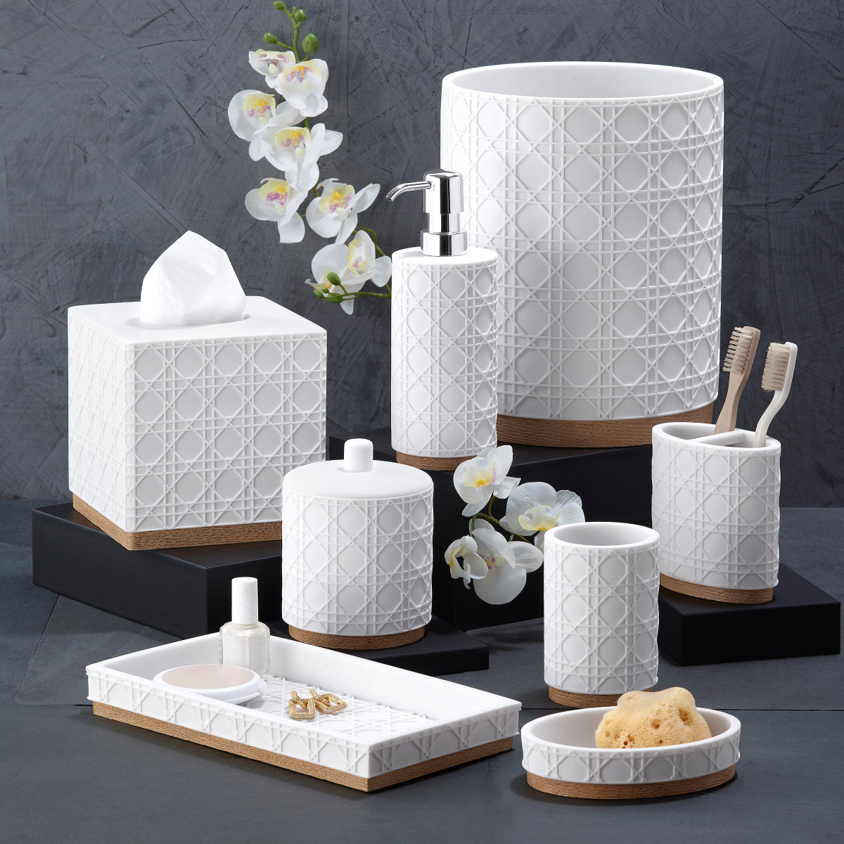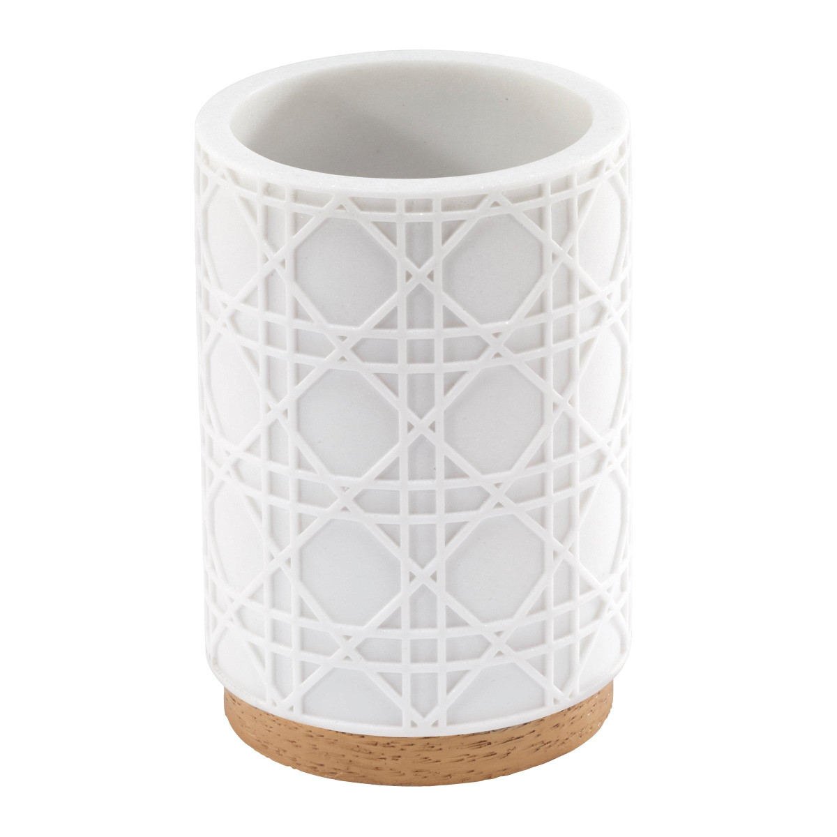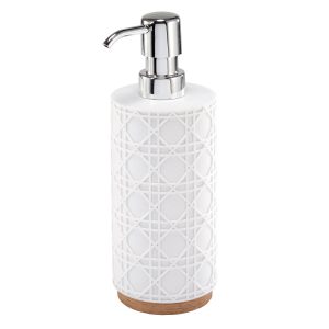 Elevate your bathroom decor with the Nicole Miller Lena 4-Piece Decorative Accessory Set. This chic collection features a raised white, large-scale caning design. Finished with a faux-wood base with life-like grain, it adds a touch of modern elegance to any room. Made of durable sand resin for easy care and a long life. The set includes a tumbler (3.00 x 3.00 x 4.30), toothbrush holder (4.20 x 2.20 x 4.30) soap dish (5.50 x 4.00 x 1.10), and a lotion dispenser (2.80 x 2.80 x 8.36).