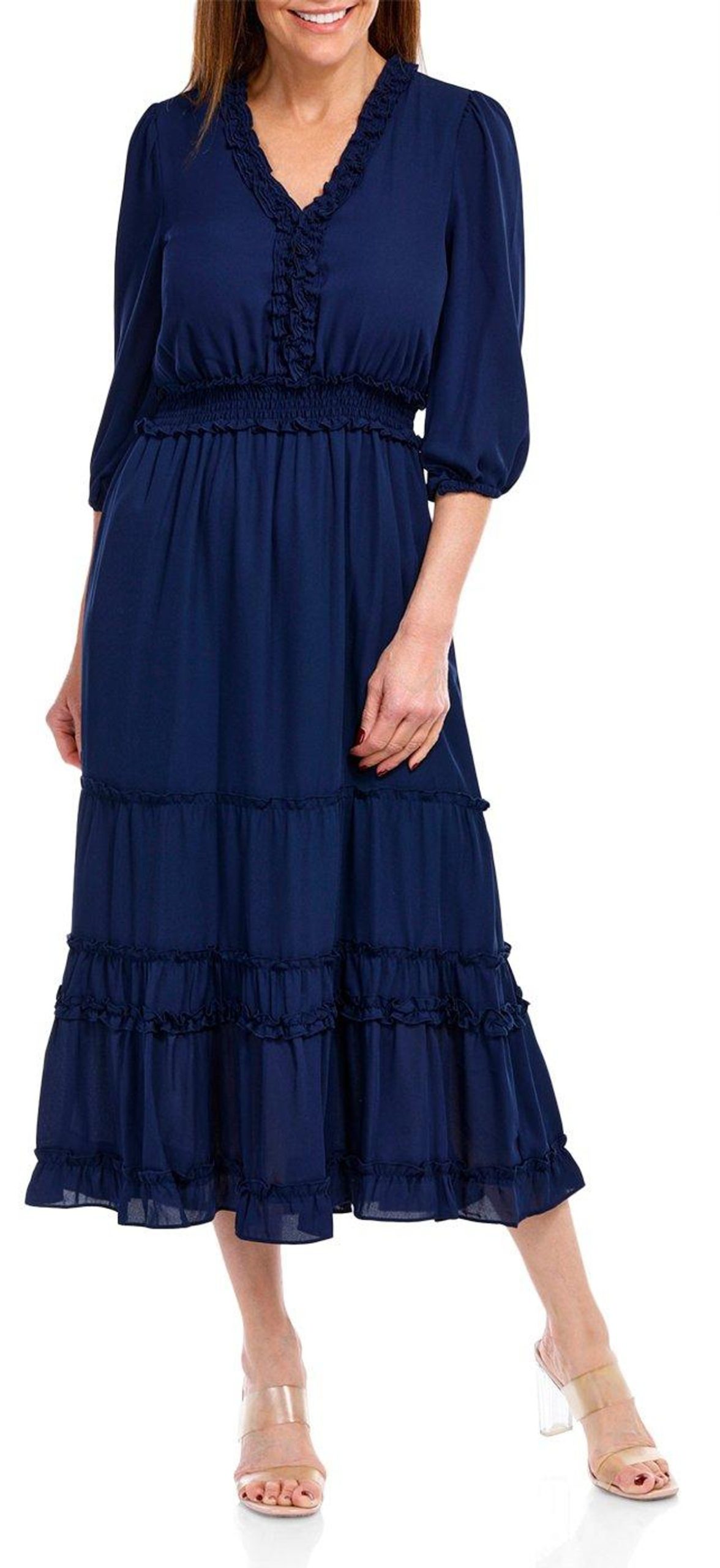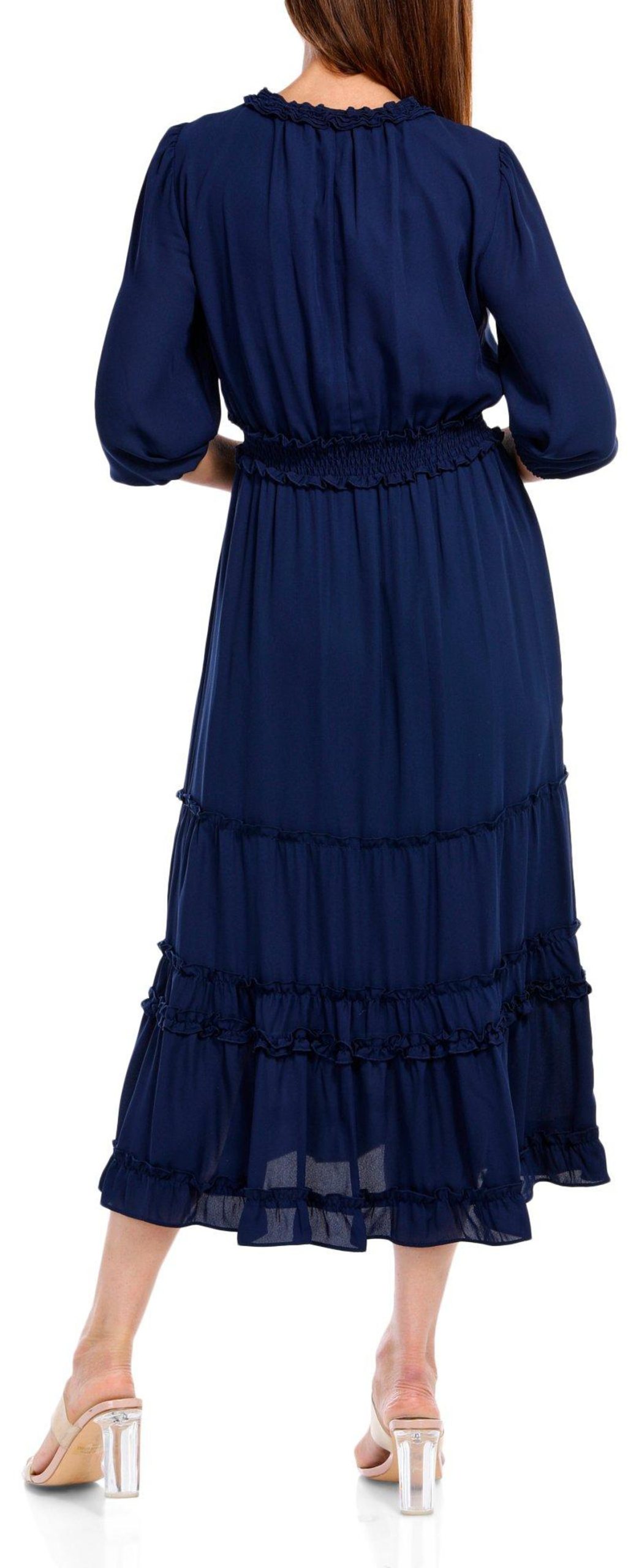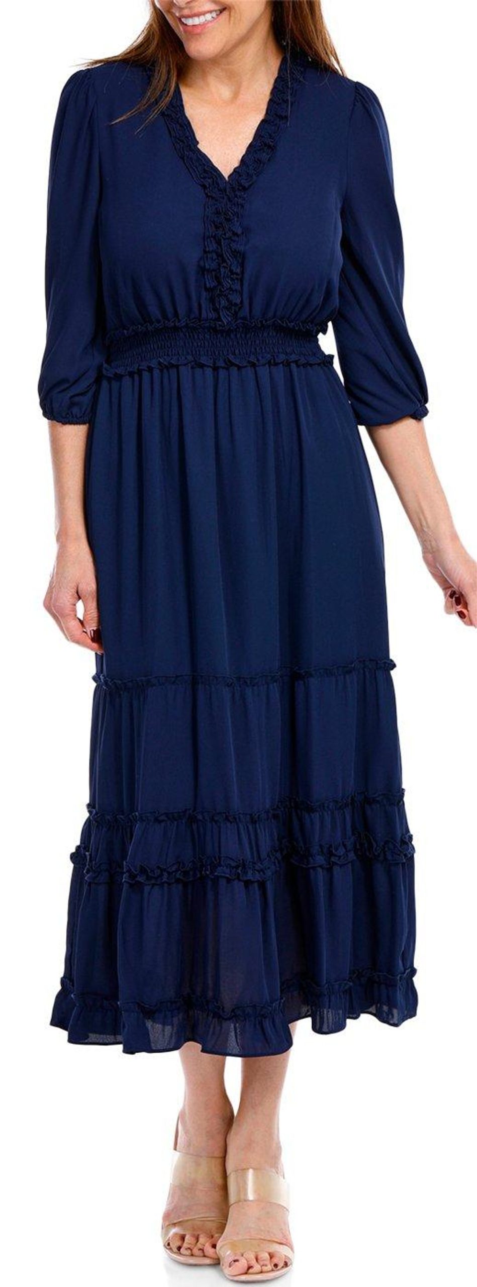 This women’s 3/4 sleeve chiffon dress, made from 100% polyester, combines elegance and comfort. The stylish solid color and ruffle detail on the collar add a touch of sophistication, while the 3/4 sleeves provide a chic look. The tiered skirt flows beautifully, making this dress perfect for any occasion, from casual outings to formal events. Embrace effortless style with this charming chiffon dress!