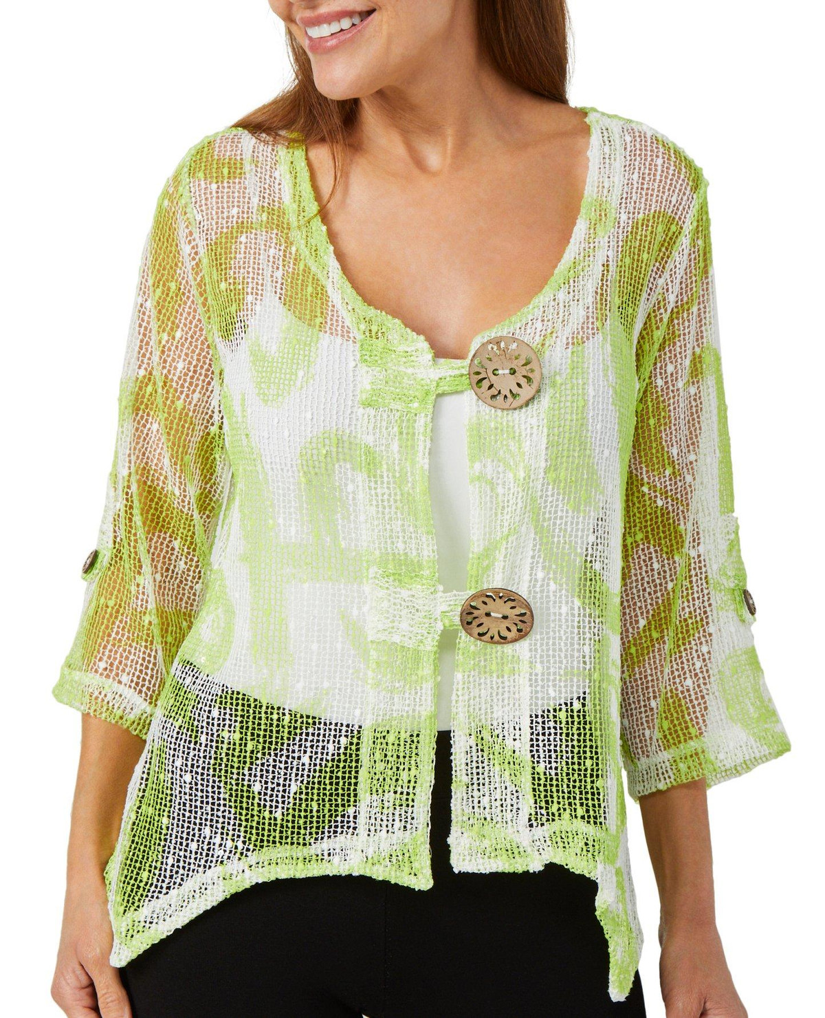 Introducing our Women’s 3/4 Sleeve Coconut Button Print Shrug, crafted from a blend of polyester and spandex for a comfortable and flexible fit. This stylish shrug features a vibrant multicolored knit design, a double button-down front, and elegant 3/4 sleeves, making it a versatile addition to your wardrobe. Perfect for layering over your favorite outfits!