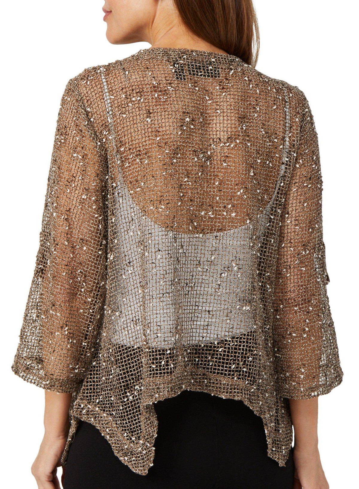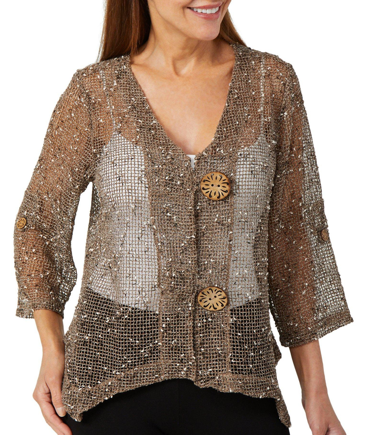 This 3/4 sleeve shrug adds a cozy, stylish layer to any outfit. Featuring an open knit design and oversized front buttons, it blends texture with charm for a relaxed yet polished look. Perfect for layering over dresses or tops, this shrug offers lightweight warmth and timeless appeal. Fabrication is 78% polyester and 22% cotton.