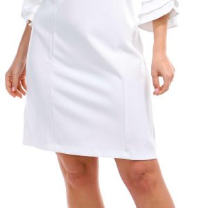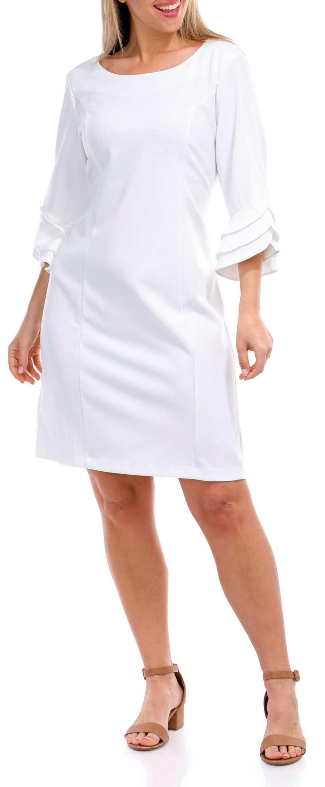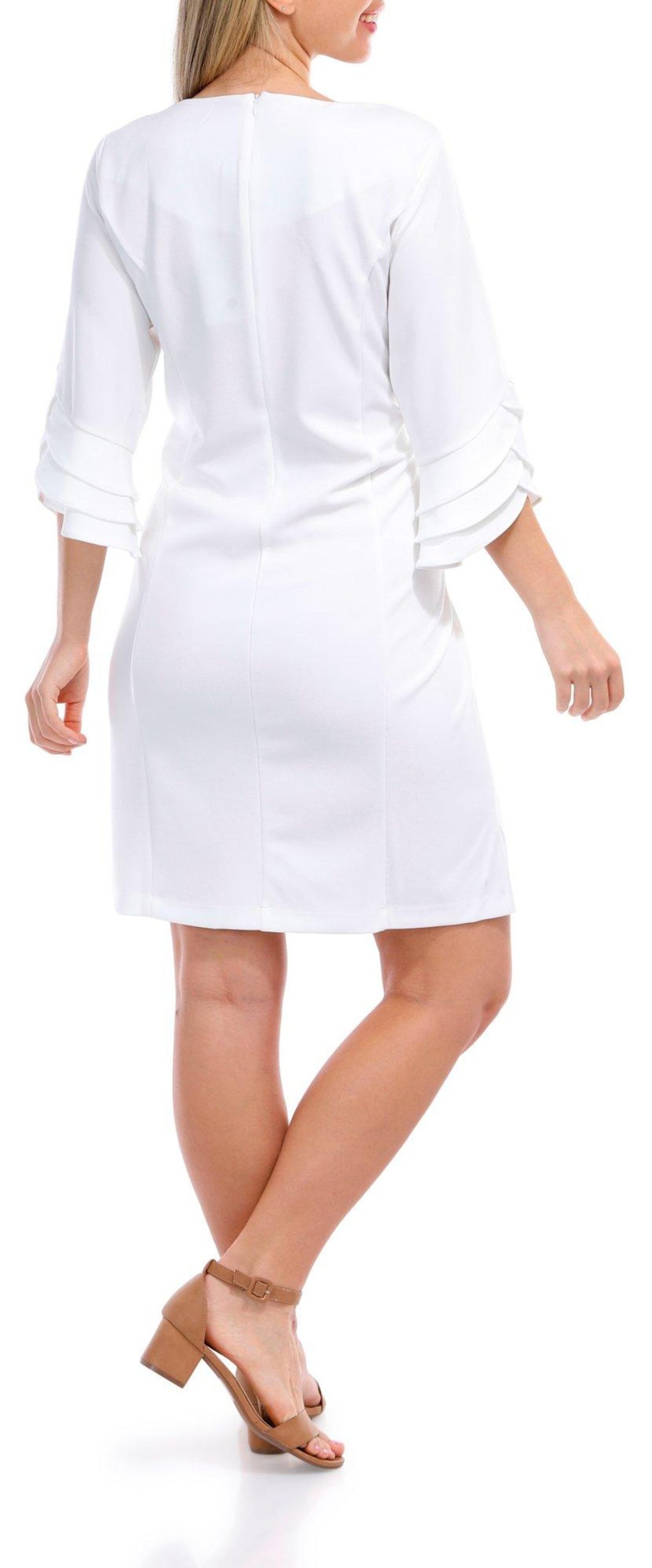Step into sophistication with this 3/4 Sleeve Tiered Sheath Dress, featuring elegant tiered sleeves and a sleek zipped back. The tiered sleeves add a touch of modern flair, while the sheath silhouette offers a flattering and streamlined fit. Perfect for both professional settings and semi-formal occasions, this dress ensures you look polished and stylish. Fabrication is 95% polyester, 5% spandex.