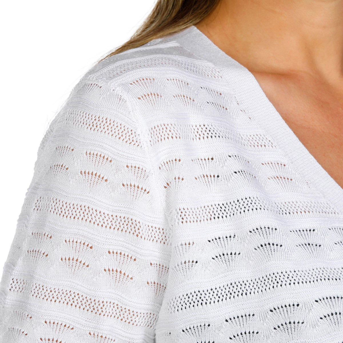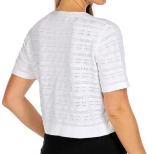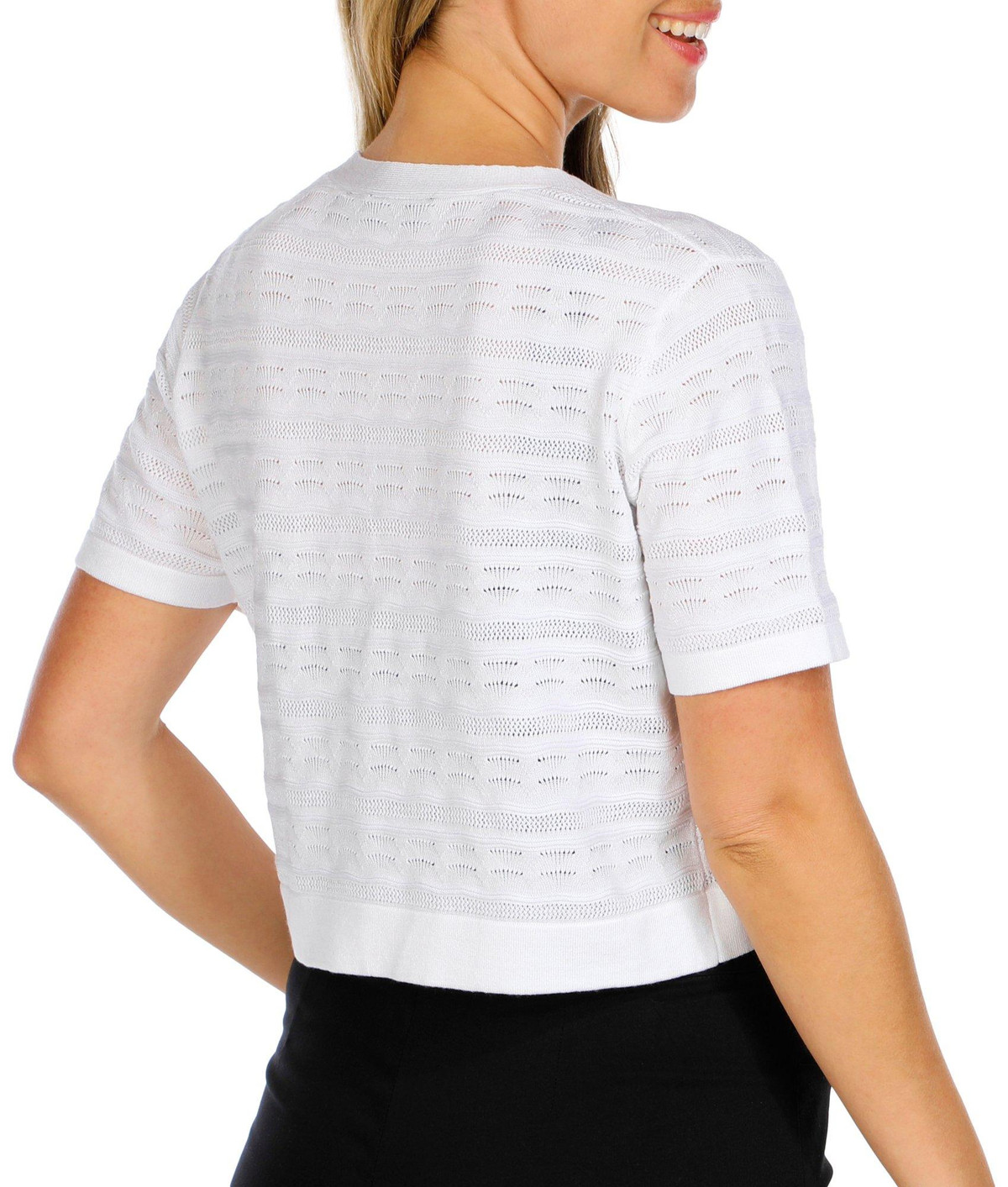 This short sleeve shrug adds a delicate layer of charm with its airy crochet fabric and open-front design. Lightweight and breathable, its perfect for layering over tanks, dresses, or tees. The relaxed fit and intricate texture make it a stylish go to for warm days or breezy evenings. Fabrication is 78% rayon, 22% polyester.