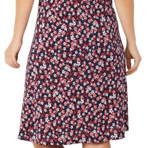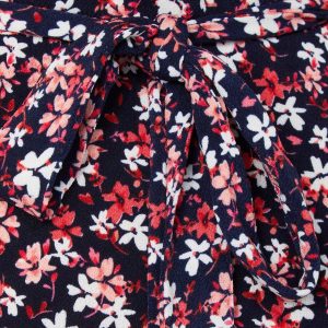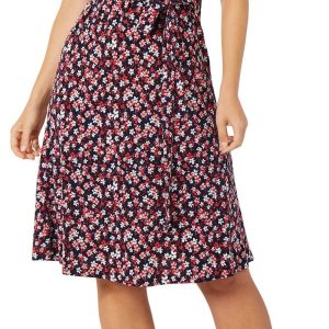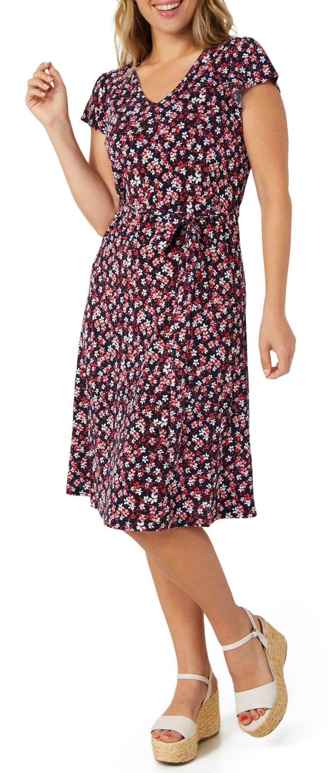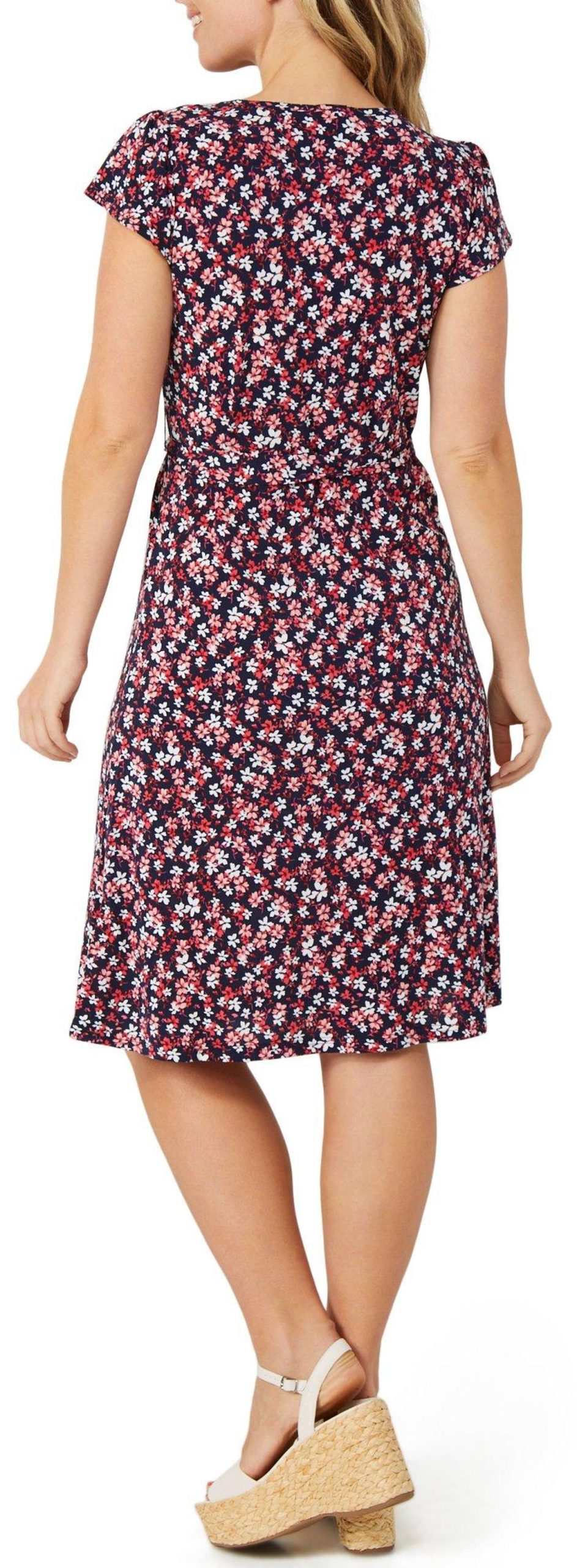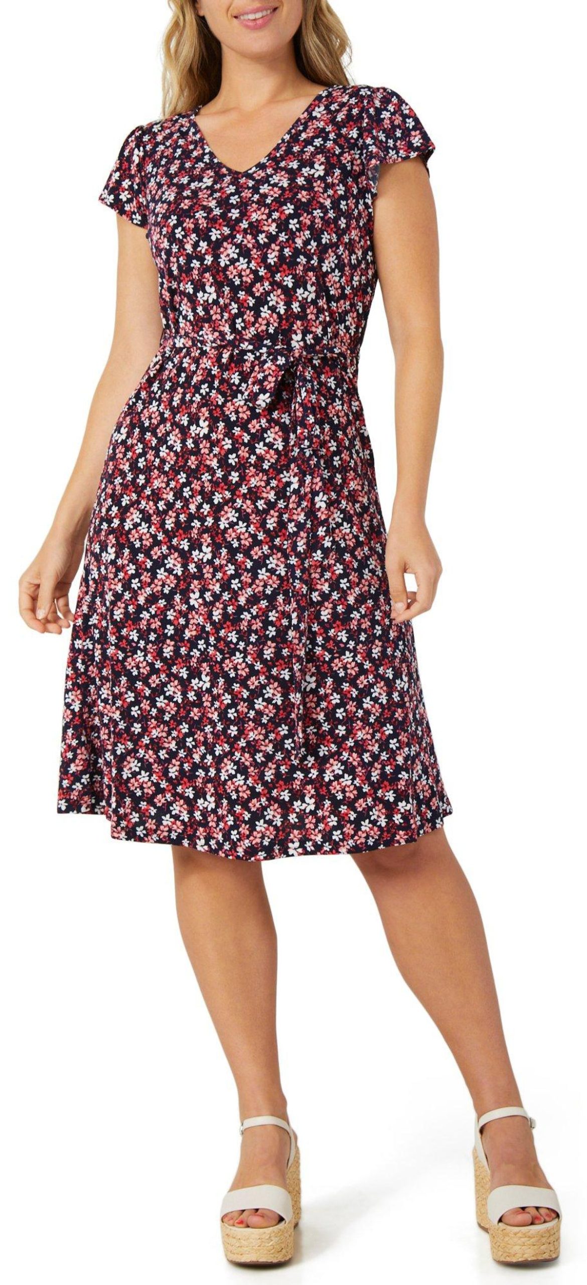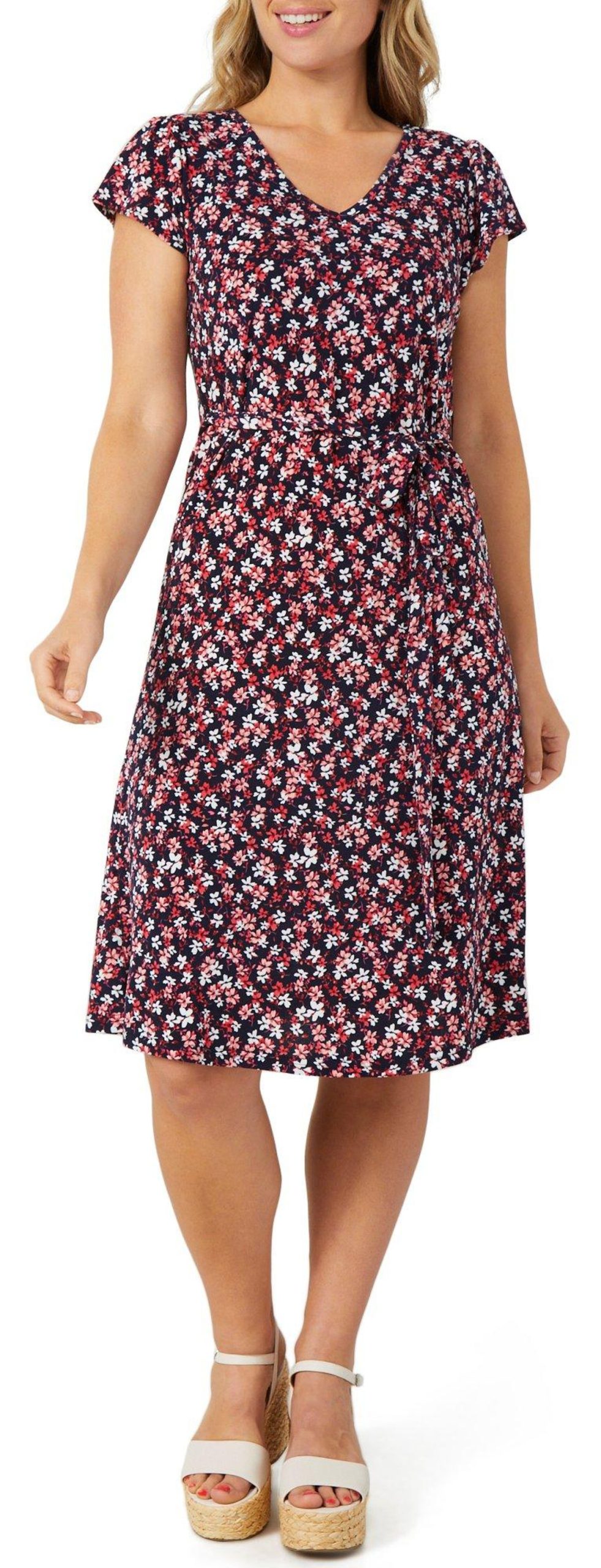 This womens short sleeve floral dress is made from a soft blend of polyester and spandex. It features a vibrant floral print, a flattering v-neckline and a waist tie that adds shape and style for a polished everyday look.