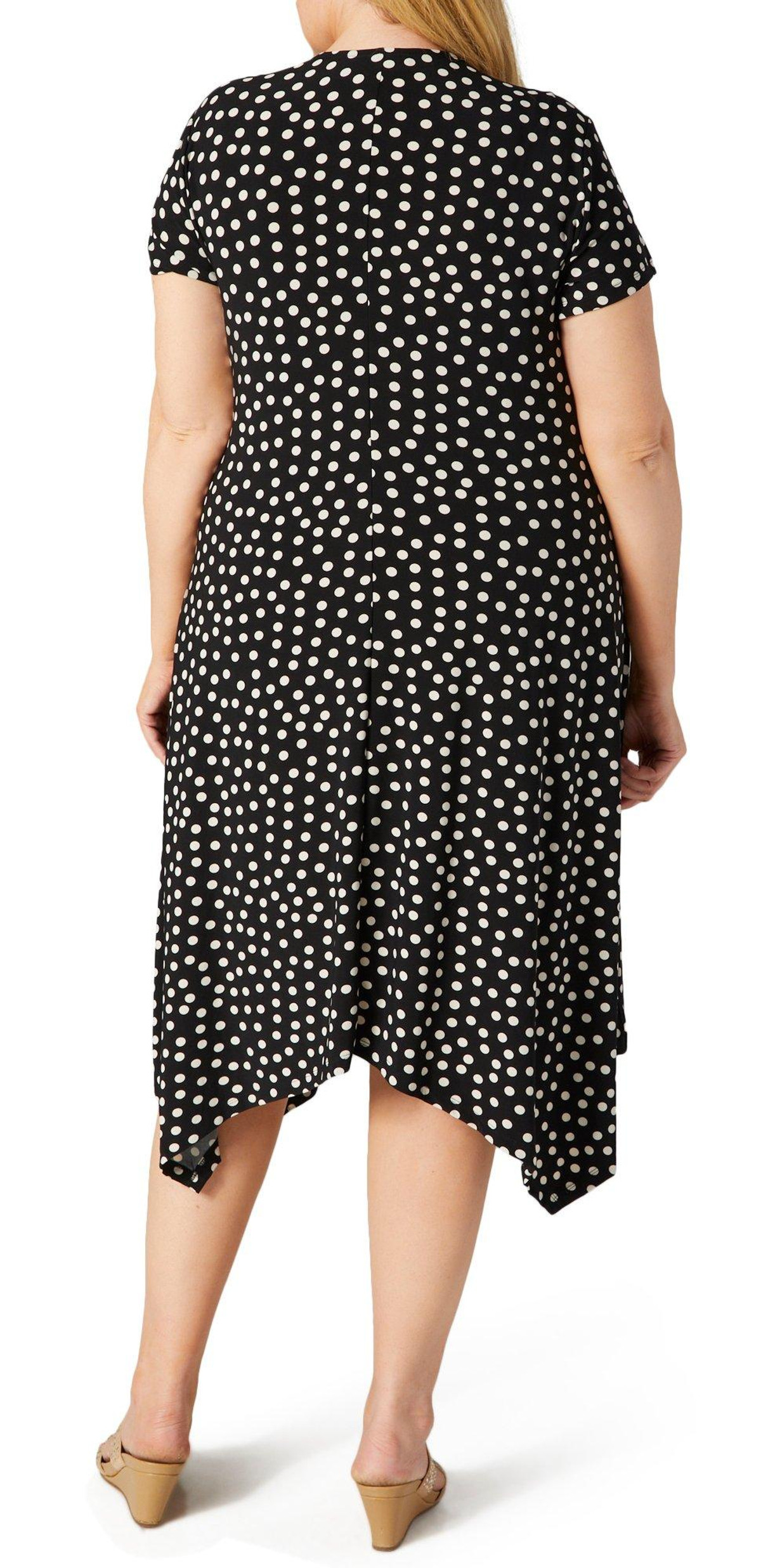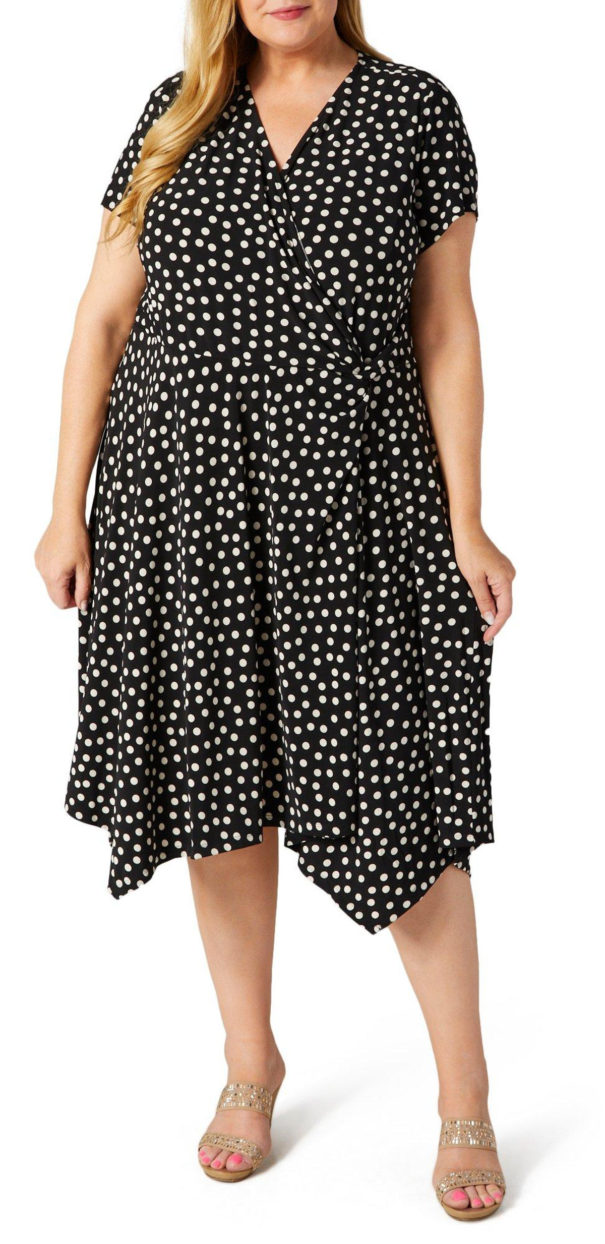 Step into timeless elegance with this Short Sleeve Midi Dress. Featuring a flattering wrap style front, this dress effortlessly accentuates your silhouette. The playful polka dot print adds a touch of vintage charm, making it perfect for any occasion. Crafted from soft, breathable fabric, it ensures comfort and style all day long. Fabrication is 95% polyester, 5% spandex.