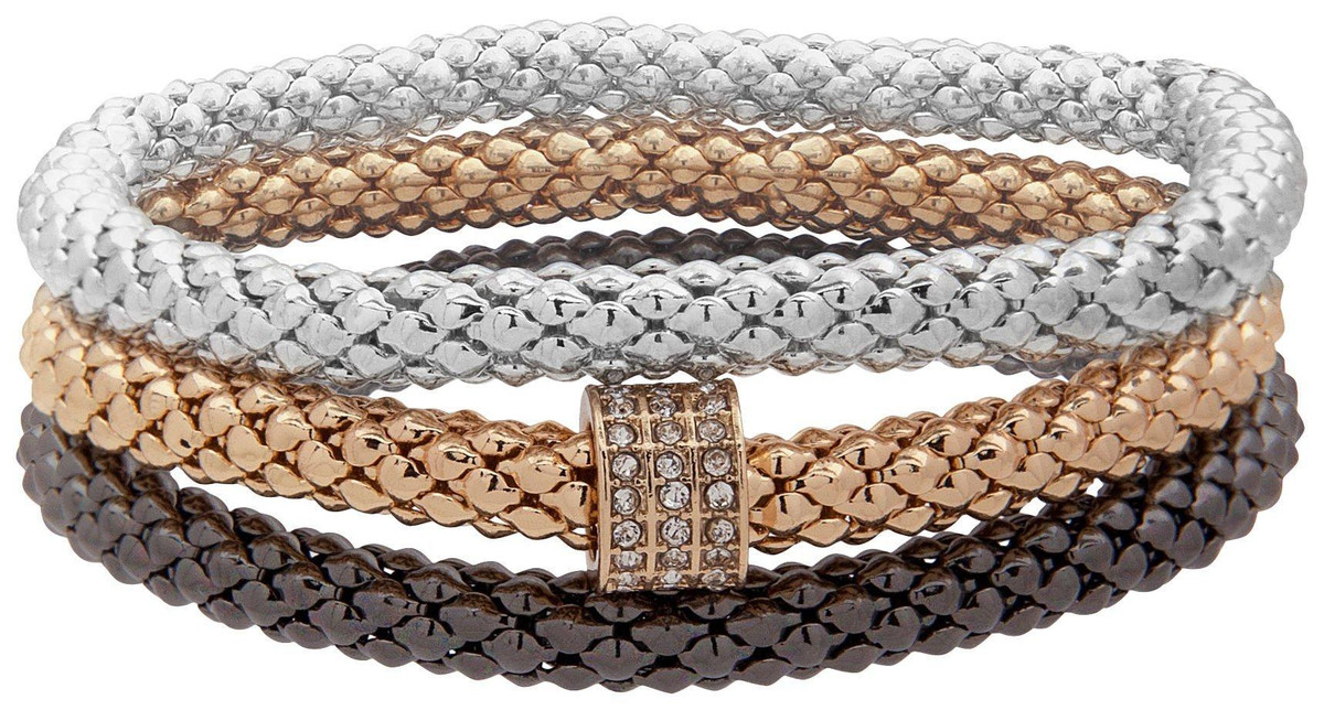 A stylish stretch bracelet set by Nine West, this bracelet set features a gold tone, silver tone, and hematite tone in a mesh chain design. Bracelet is approximately 7” in circumference.
