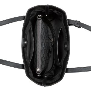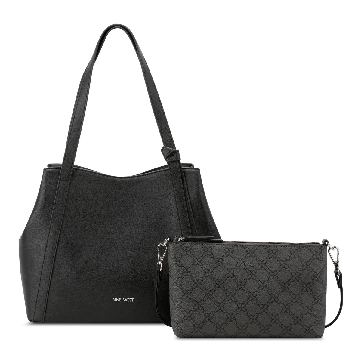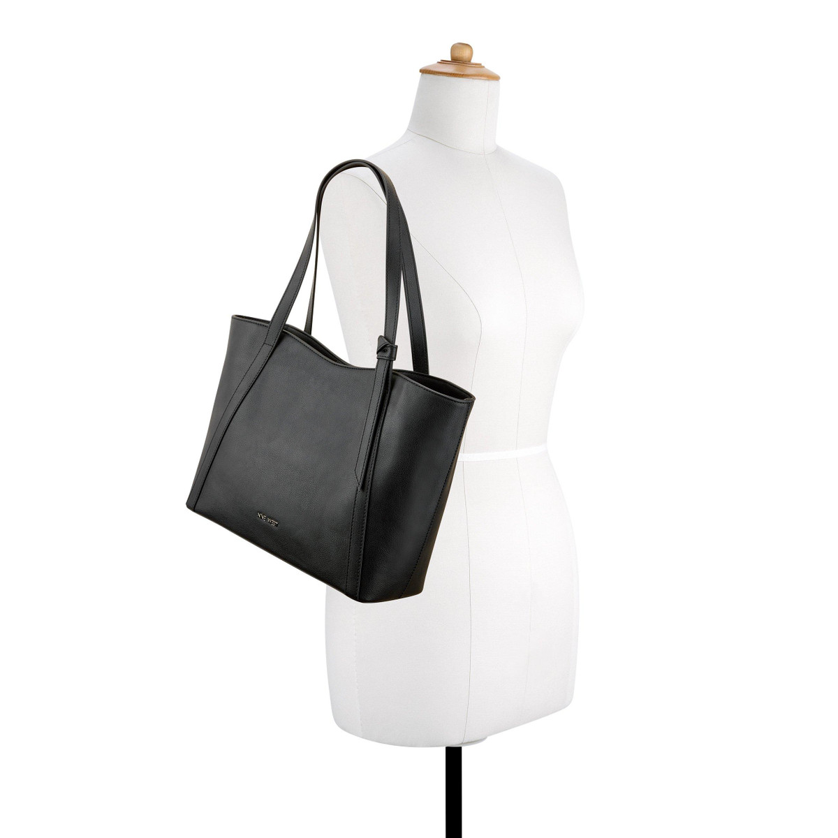 The Nine West Ruthie tote with pouch is a stylish and practical handbag designed to complement your everyday wardrobe. Crafted from durable synthetic leather, this tote features a spacious interior to accommodate your essentials, along with a detachable pouch for added organization. Measures: 12.5 in. W x 10 in. H x 5 in. D. Handle drop: 10 in.