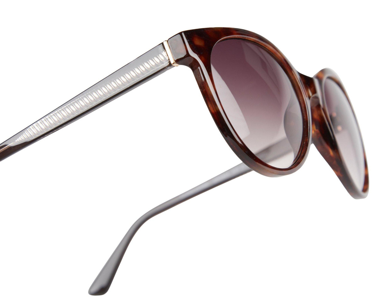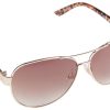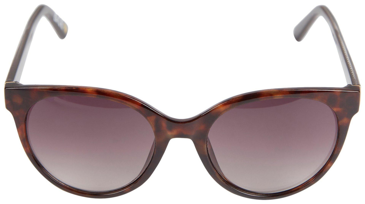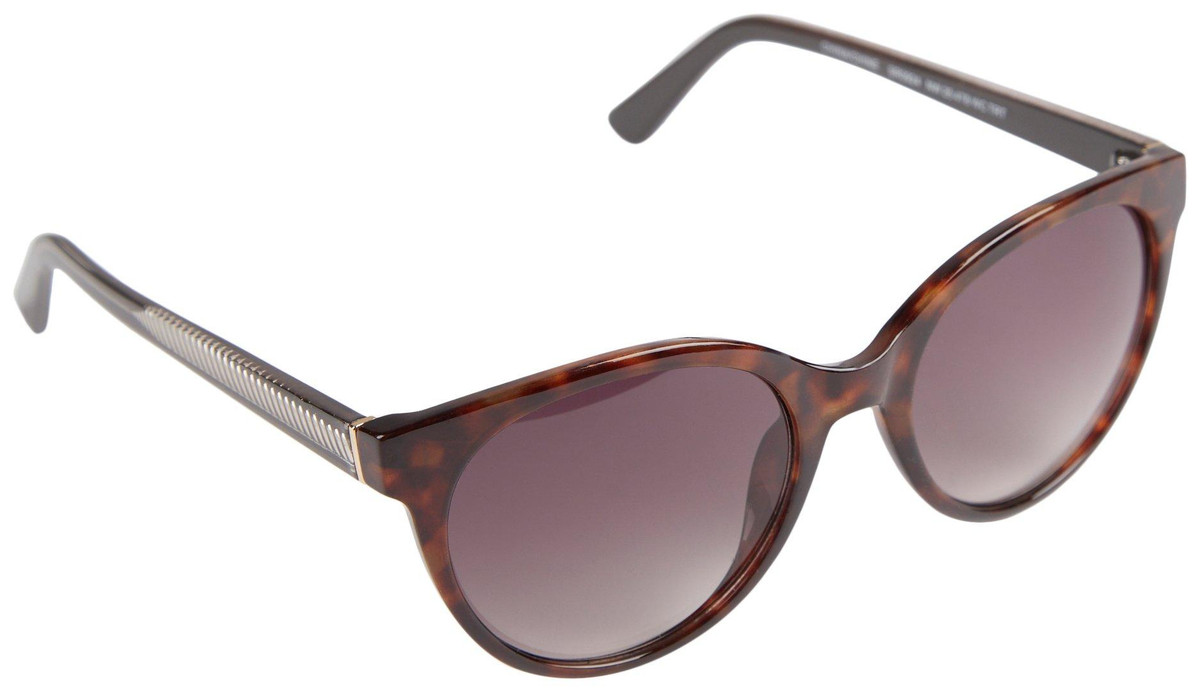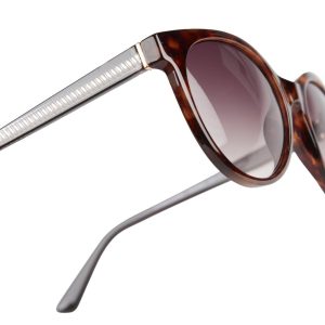 These Womens Sunglasses feature a solid color design on a plastic fabrication, a round lens shape, narrow metal stems, 100% UV sun protection, and fade tinted lenses.