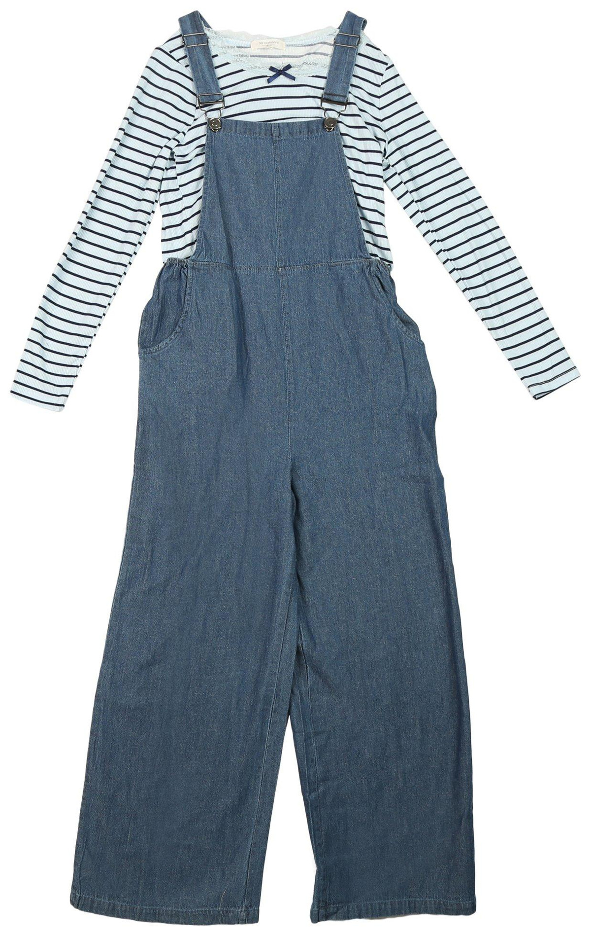 Get ready for any occasion in this cute 2-piece set! It includes a pair of stylish denim overalls and a striped long sleeve shirt, adorned with lace details.