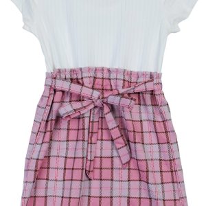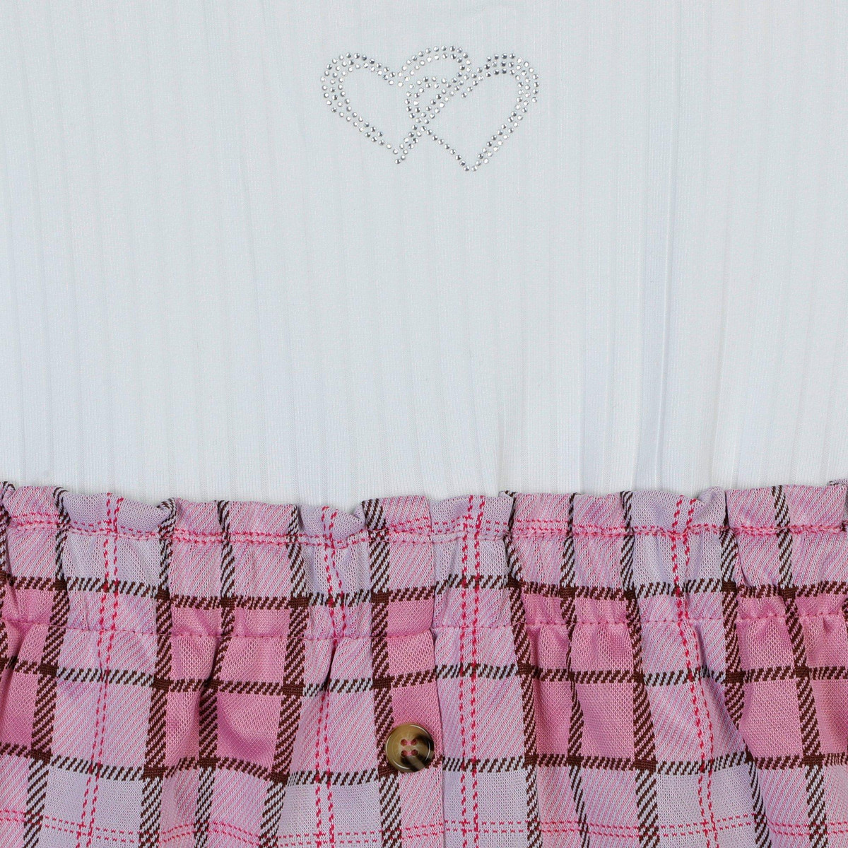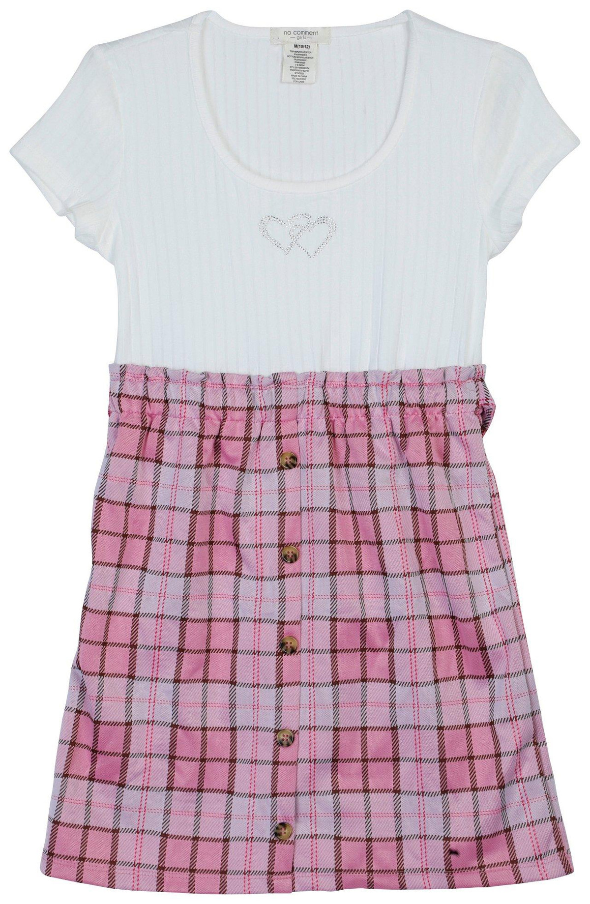 Get ready for any occasion in this colorful and stylish layered dress! It features a ribbed upper with rhinestone heart details, and a plaid skirt-style attached bottom with decorative button details. Fabrication is 92% polyester and 8% spandex.