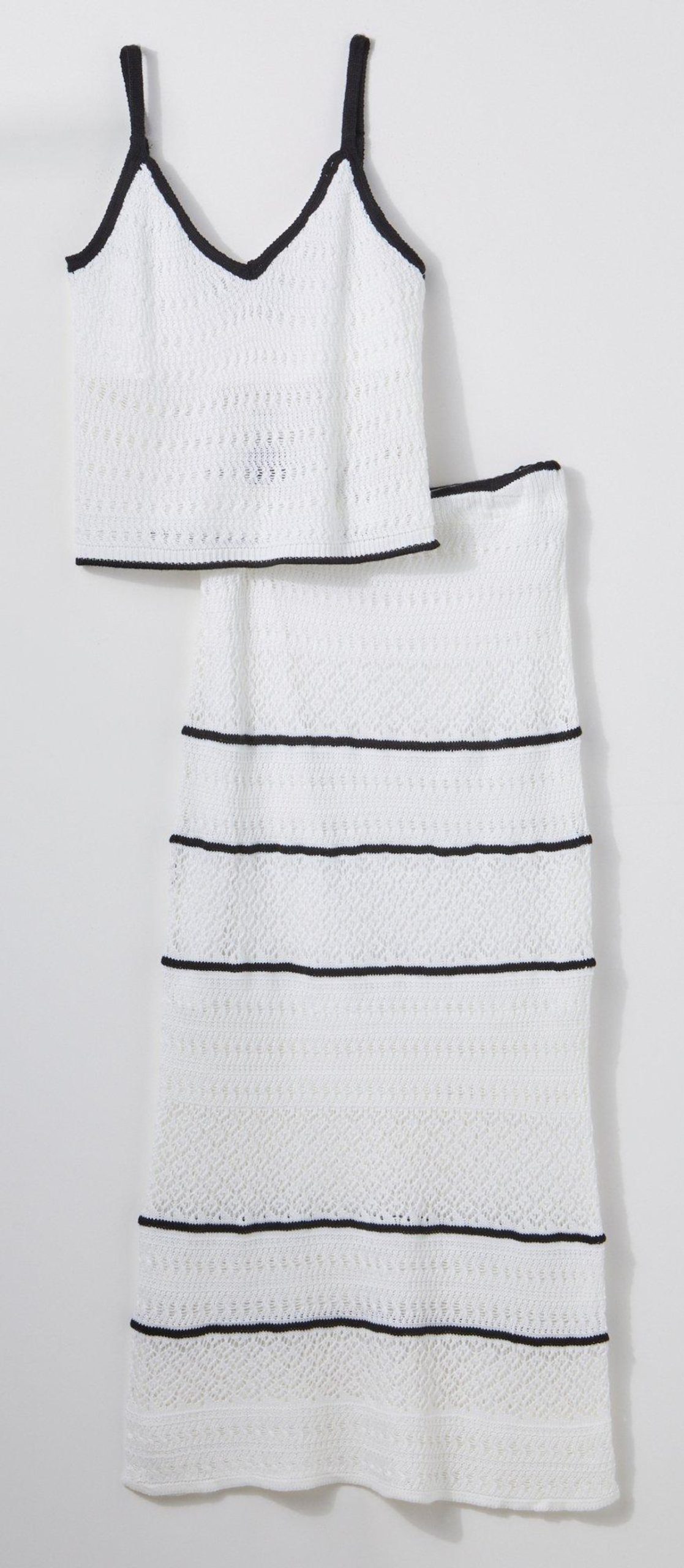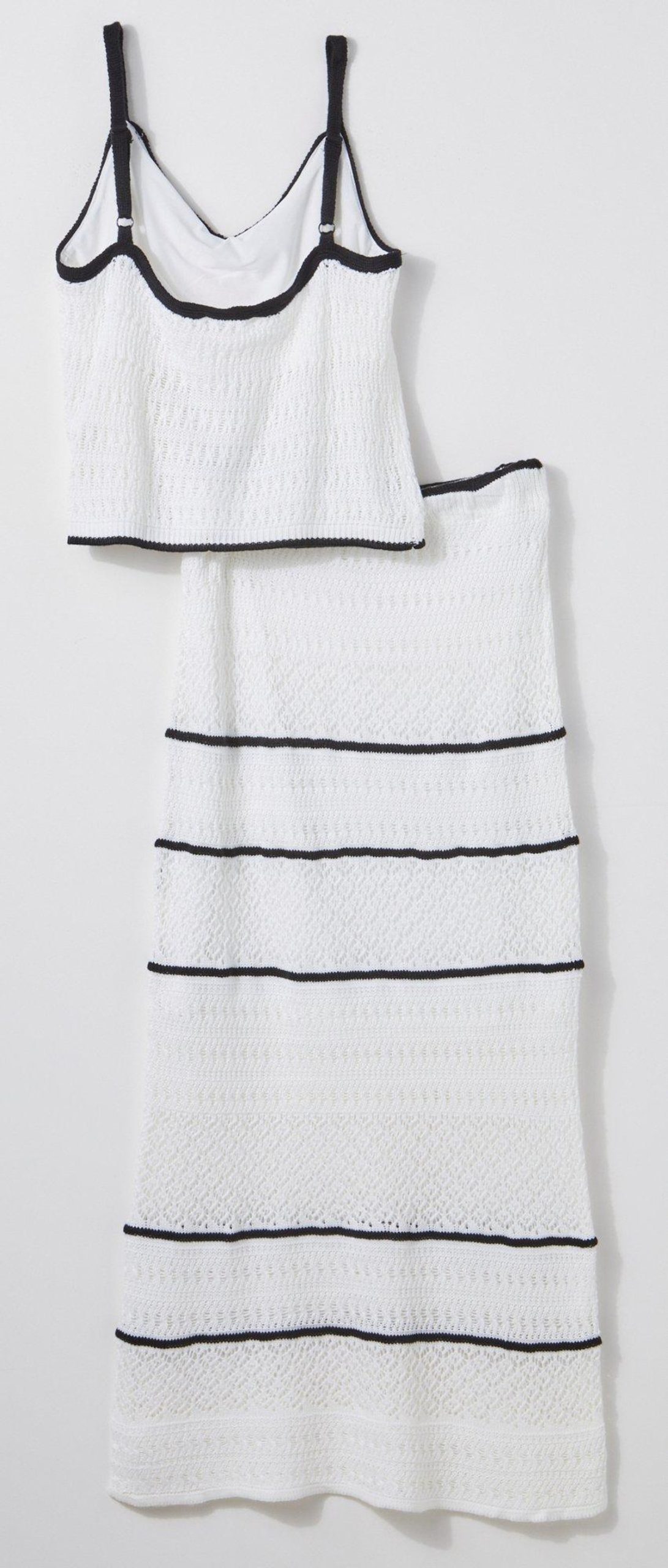 Crafted from 100% acrylic with a 100% polyester lining, this coordinated duo brings texture, movement, and charm to every step. The crochet stripe design adds a playful touch while the maxi length creates a graceful flow that feels both relaxed and refined. Whether you are strolling through a weekend market or dressing up for a sunset dinner, this set captures the spirit of carefree elegance and moments made to feel beautiful.