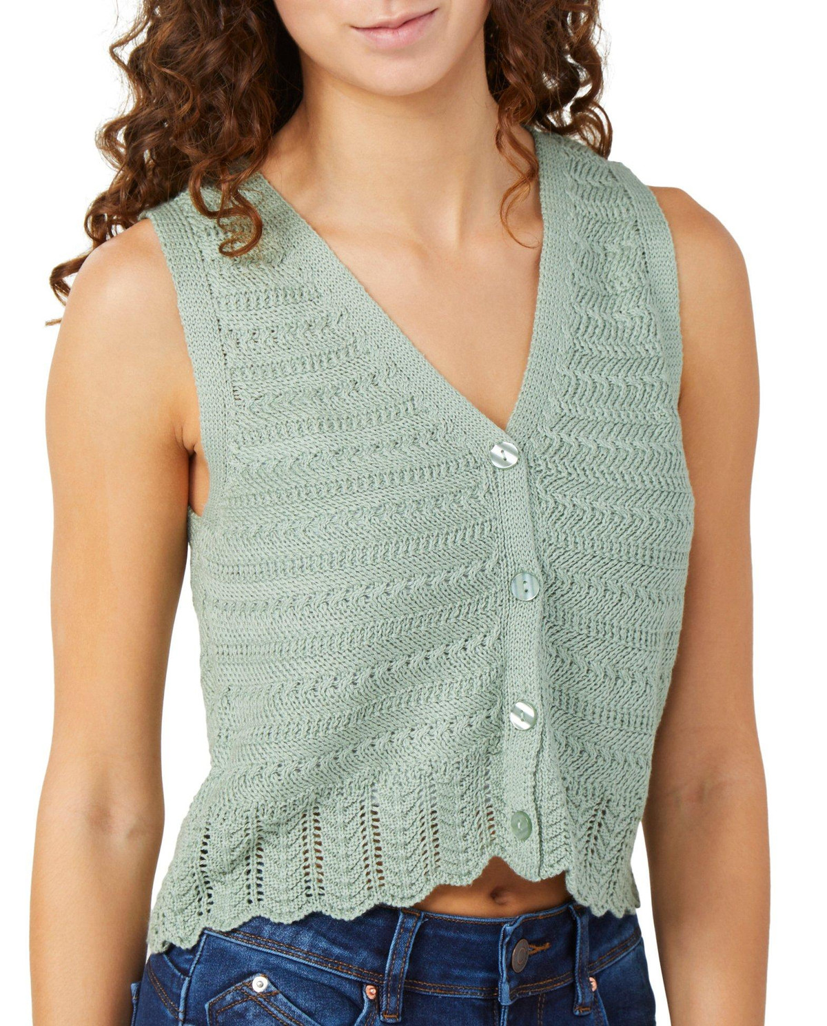 Add texture and charm to your look with the Juniors Crochet Button Down Vest. Featuring a solid crochet body, v-neckline, button-down front, and a delicate scalloped hem, its a stylish layer with vintage-inspired flair. Fabrication 55% cotton, 45% acrylicc