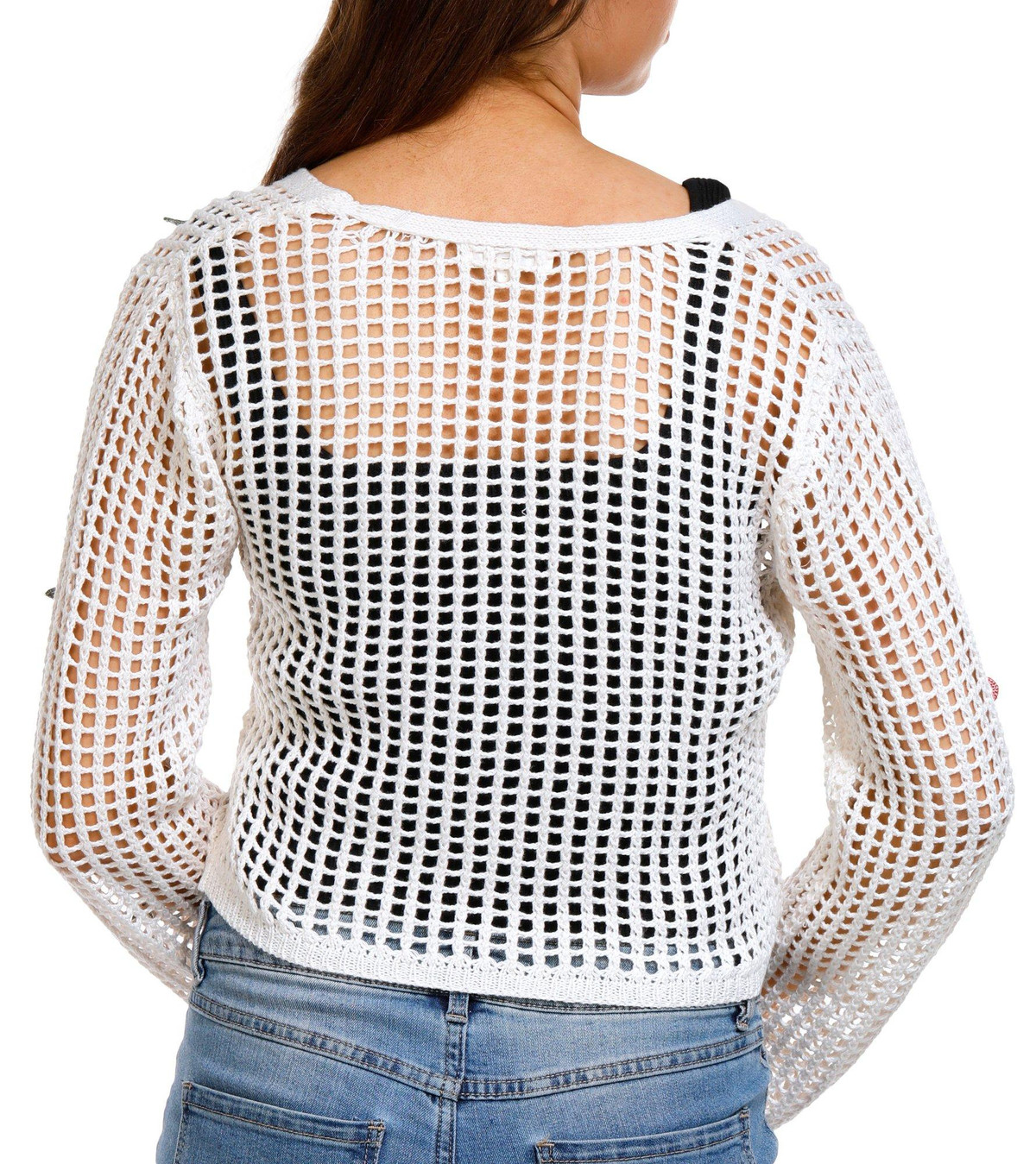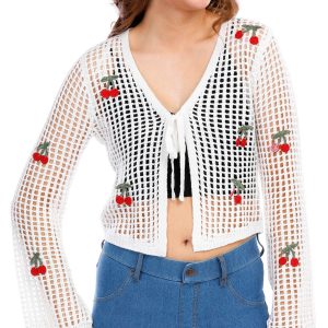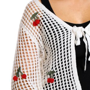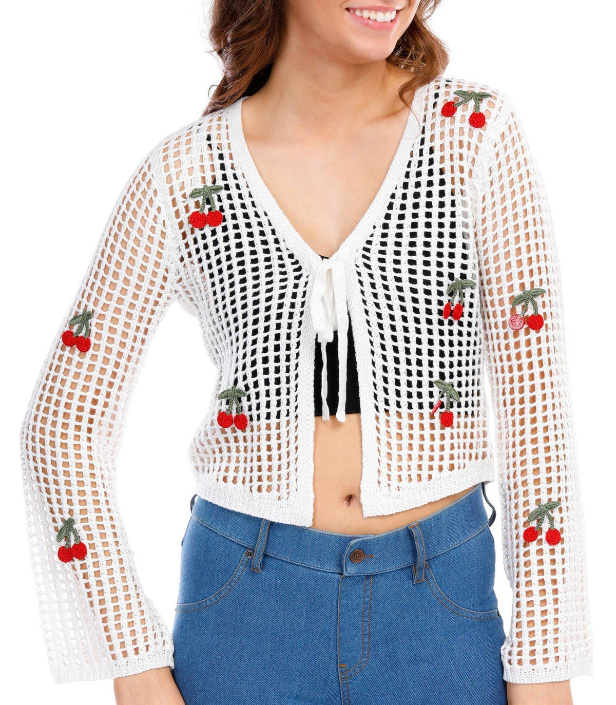 Introducing the Juniors Crochet Cherry Tie Front Cardigan, made from 100% acrylic for a soft and comfortable feel. This adorable cardigan features a tie front closure and an open crochet body, perfect for layering. The long sleeves and knit cherry embellishments add a playful touch, while the 18-inch length provides a flattering fit. Ideal for adding a fun, whimsical element to your wardrobe, this cardigan is a must-have for any fashion-forward junior.