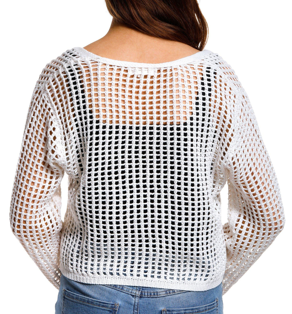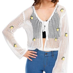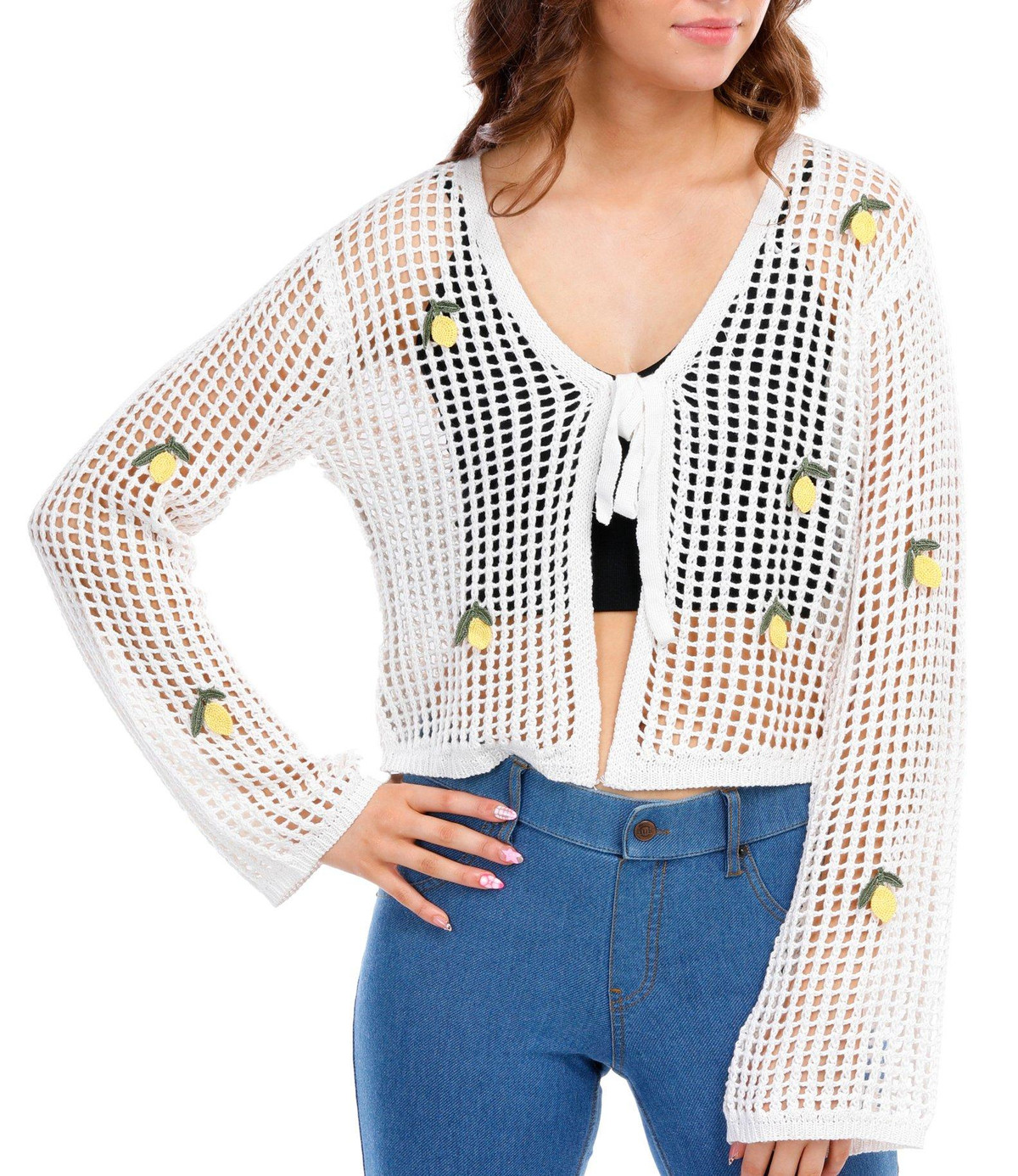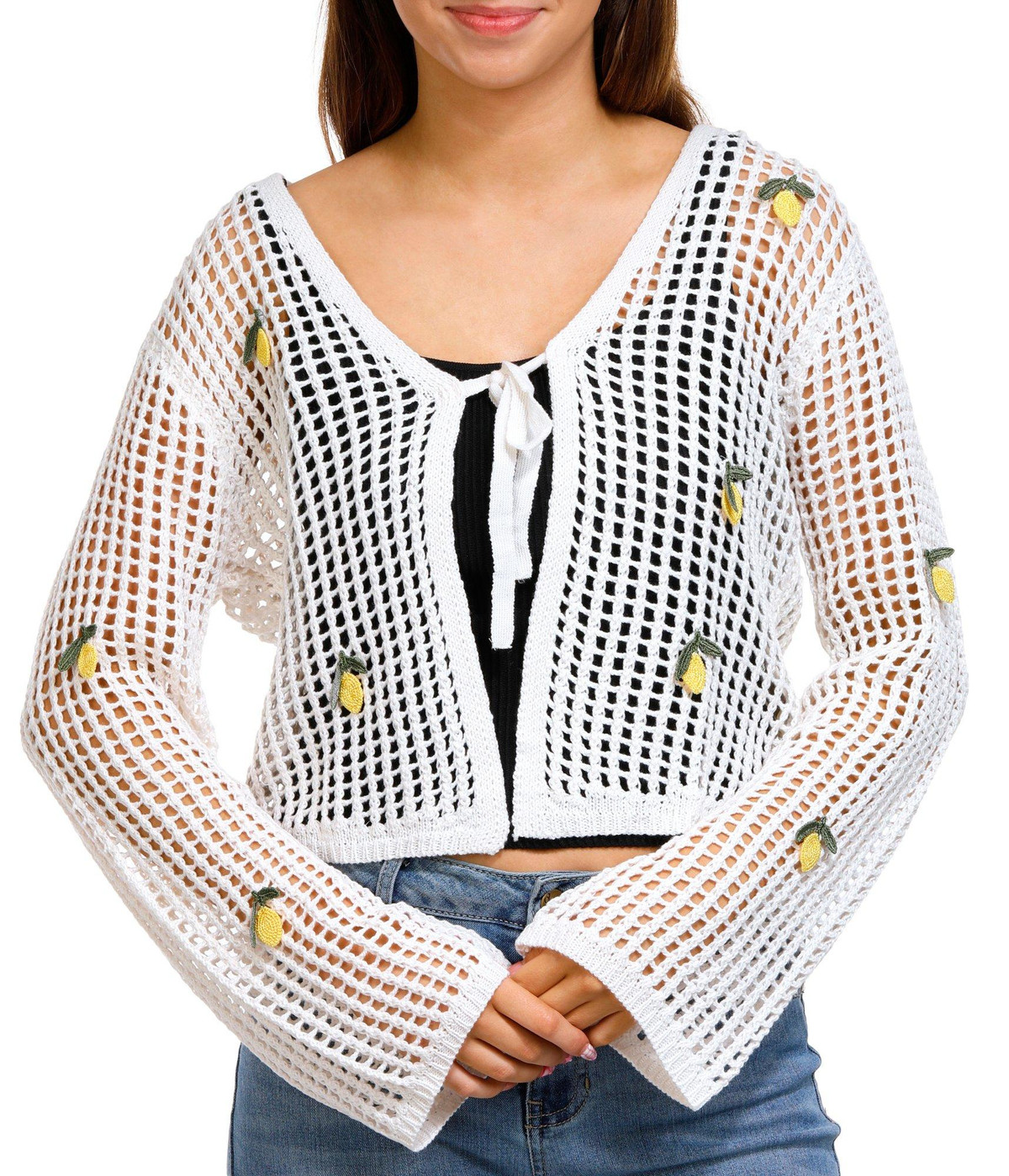 Introducing the Juniors Crochet Lemon Tie Front Cardigan, made from 100% acrylic for a soft and comfortable feel. This adorable cardigan features a tie front closure and an open crochet body, perfect for layering. The long sleeves and knit lemon embellishments add a playful touch, while the 18-inch length provides a flattering fit. Ideal for adding a fun, whimsical element to your wardrobe, this cardigan is a must-have for any fashion-forward junior.