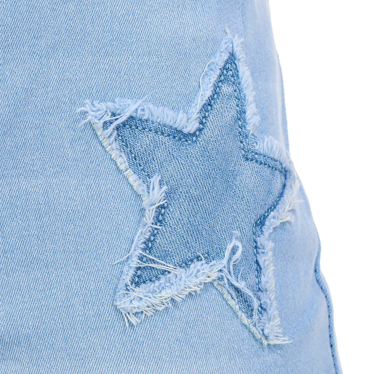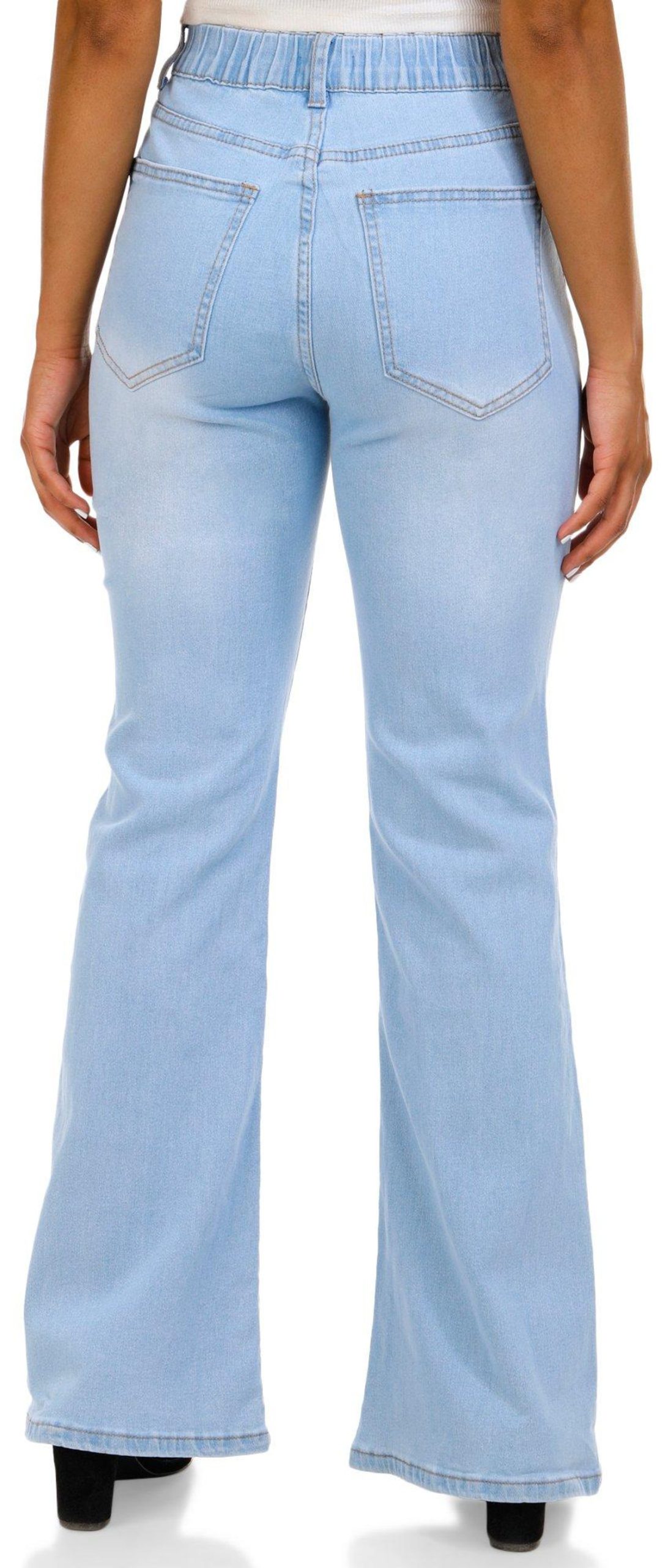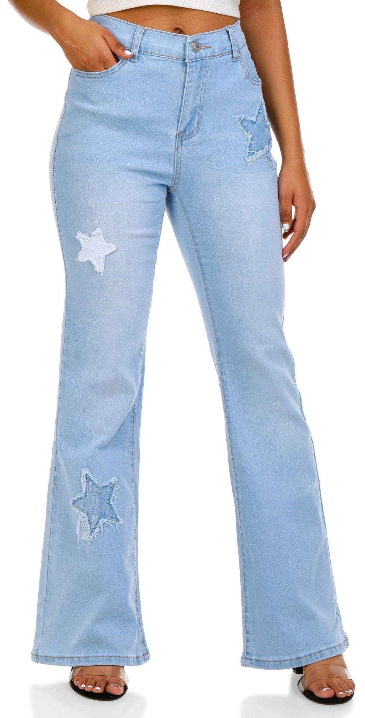 Step out in style with our Juniors Distressed Star Flare Jeans. Made from a blend of cotton, spandex, and polyester, these jeans offer both comfort and flexibility. The distressed star-shaped pattern adds a unique touch, while the button zip fly closure and elastic waistband ensure a secure fit. With a classic 5-pocket cut and a trendy flare leg fit, these jeans are perfect for any fashion-forward wardrobe. Ideal for making a bold statement, they are a must-have for any trendsetter.
