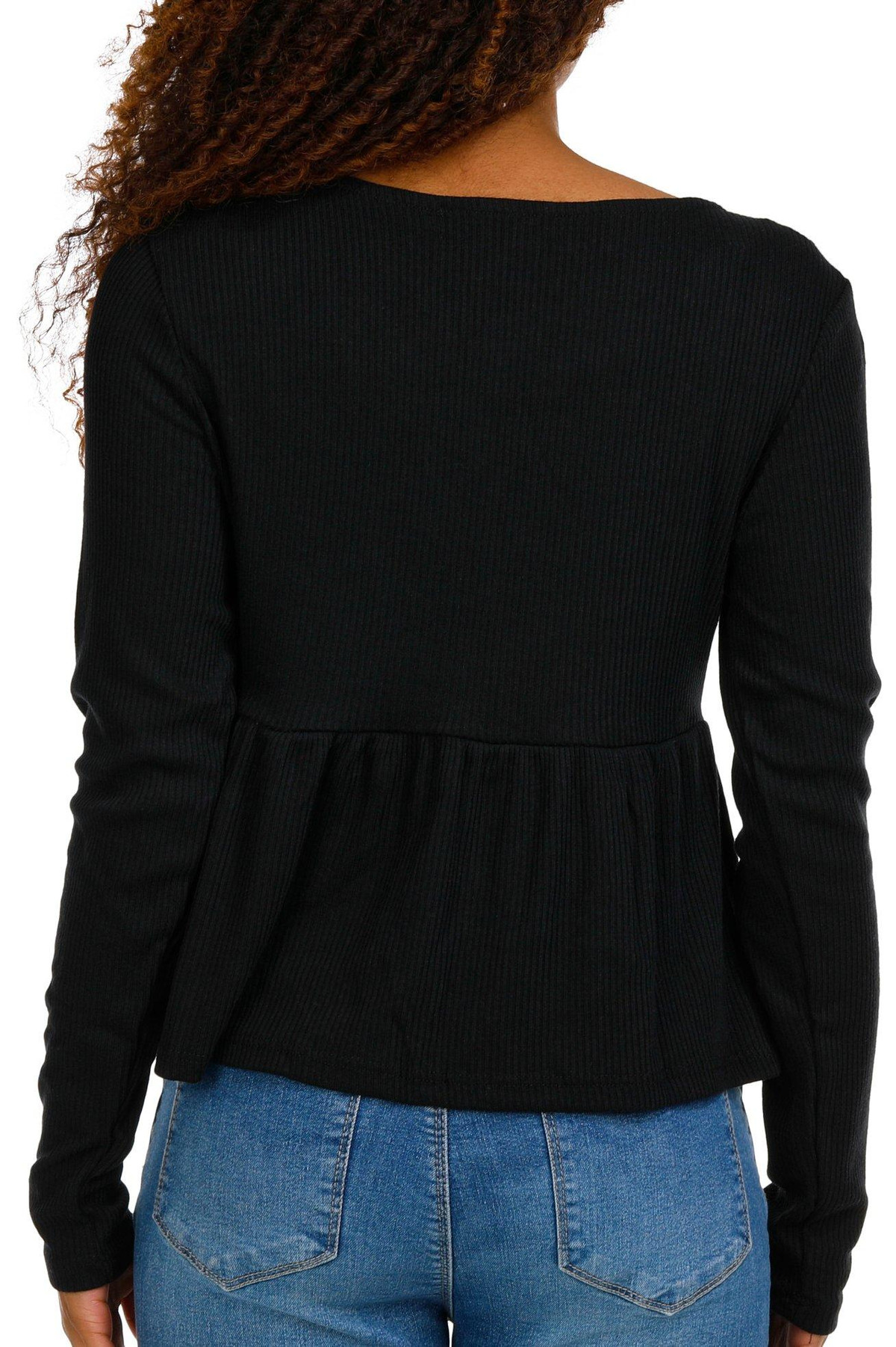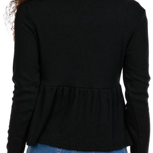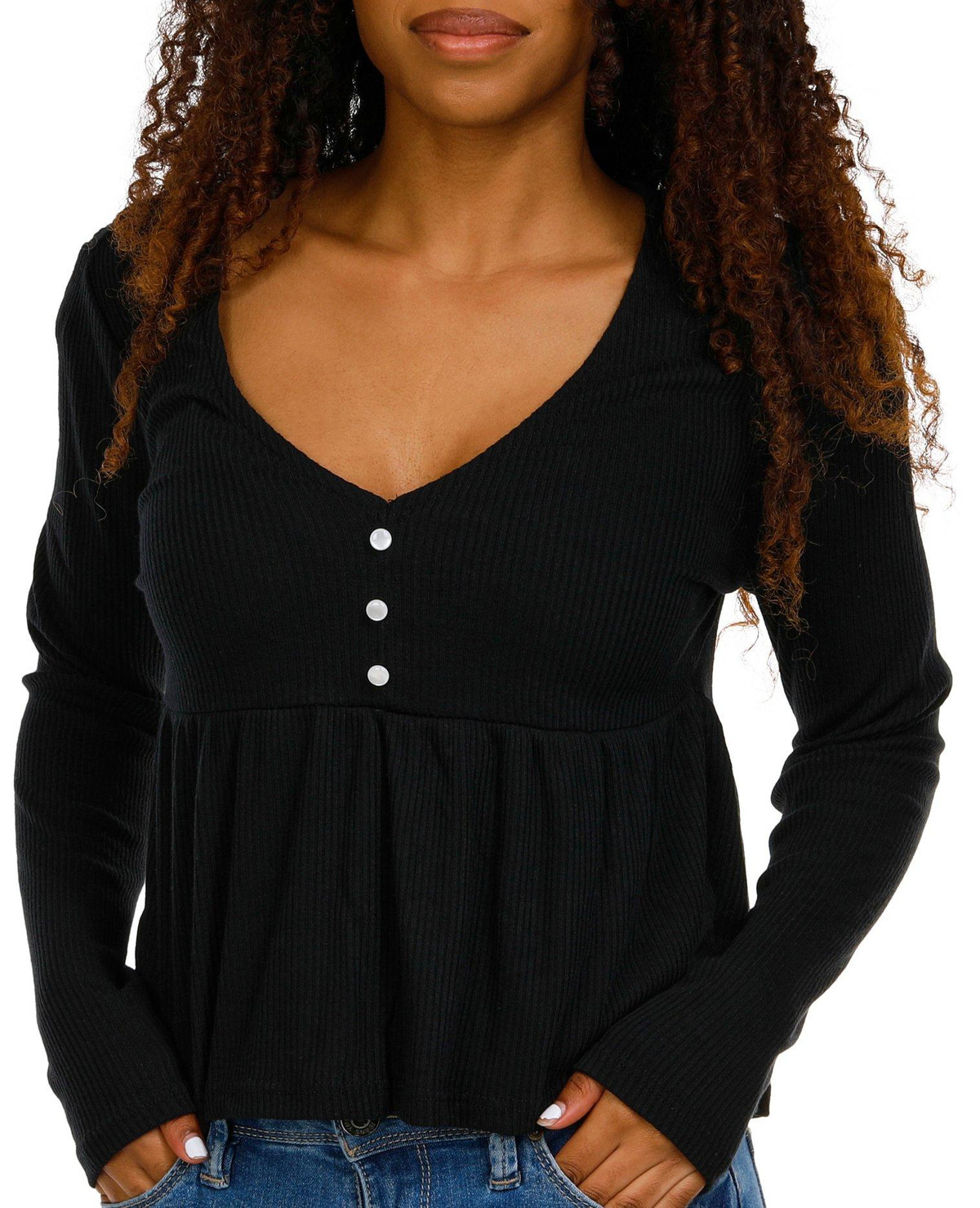 The Juniors Long Sleeve Peplum Top is a chic and versatile piece perfect for any occasion. Crafted from a blend of polyester, rayon, and spandex, it offers a comfortable and flattering fit. This top features a stylish solid color, long sleeves, and a triple button-down detail on the front. The scoop neckline and ribbed detailing add a touch of elegance, making it a must-have for your wardrobe.