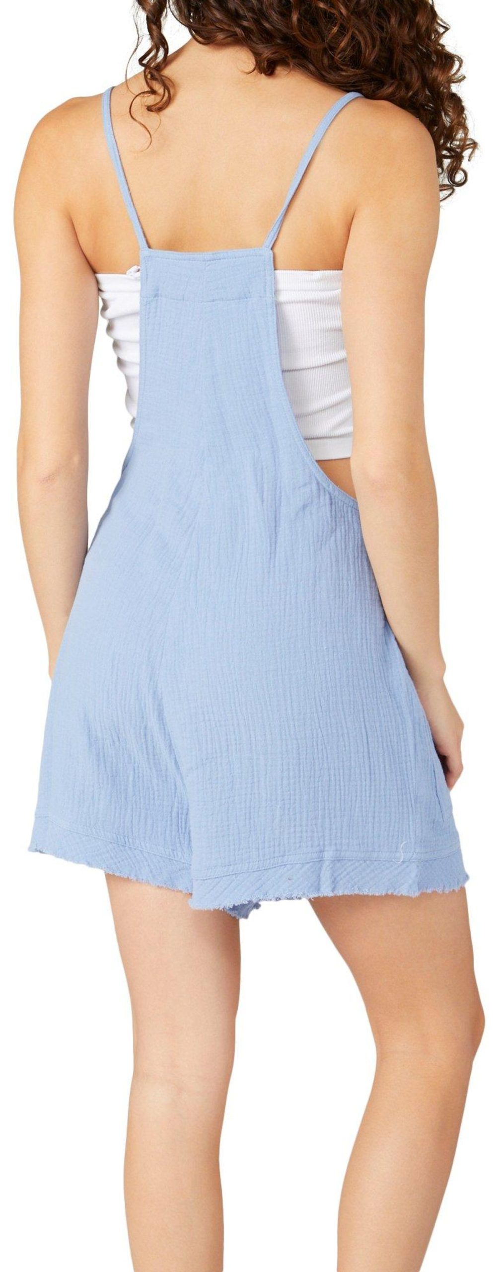 This overall romper is perfect for any outing. It features soft woven fabric, adjustable straps, two side pockets, and frayed hems. Inseam is 2.5 in. fabrication is 100% cotton.