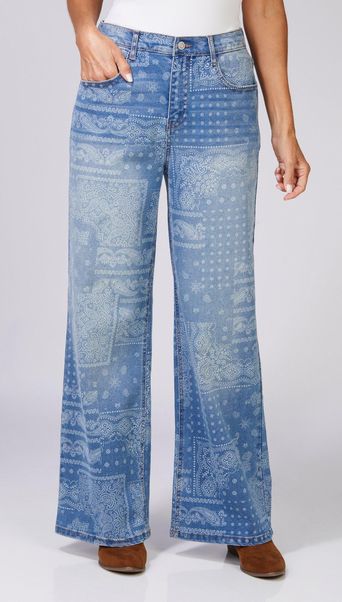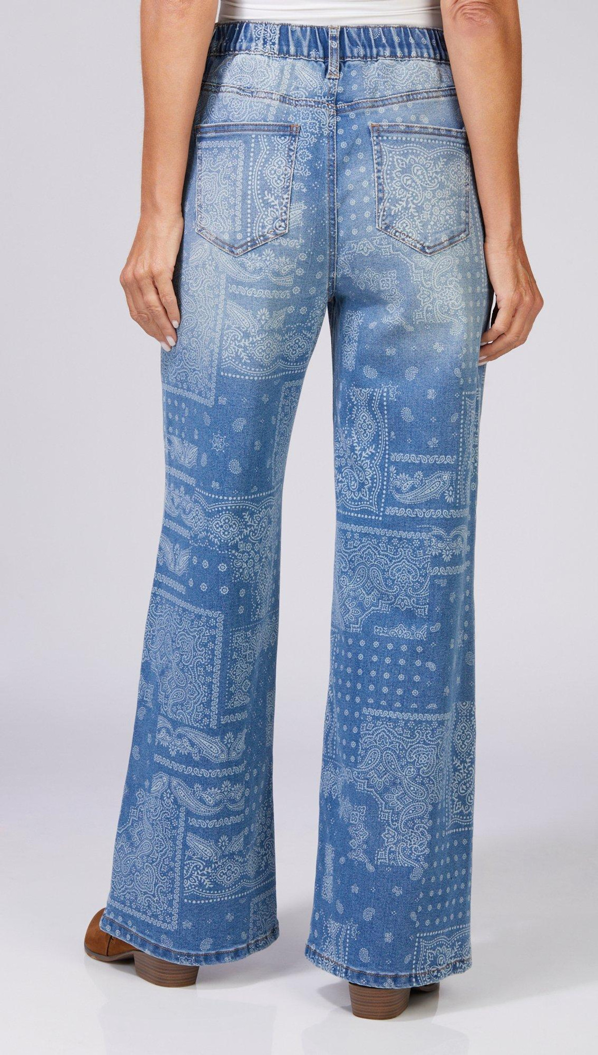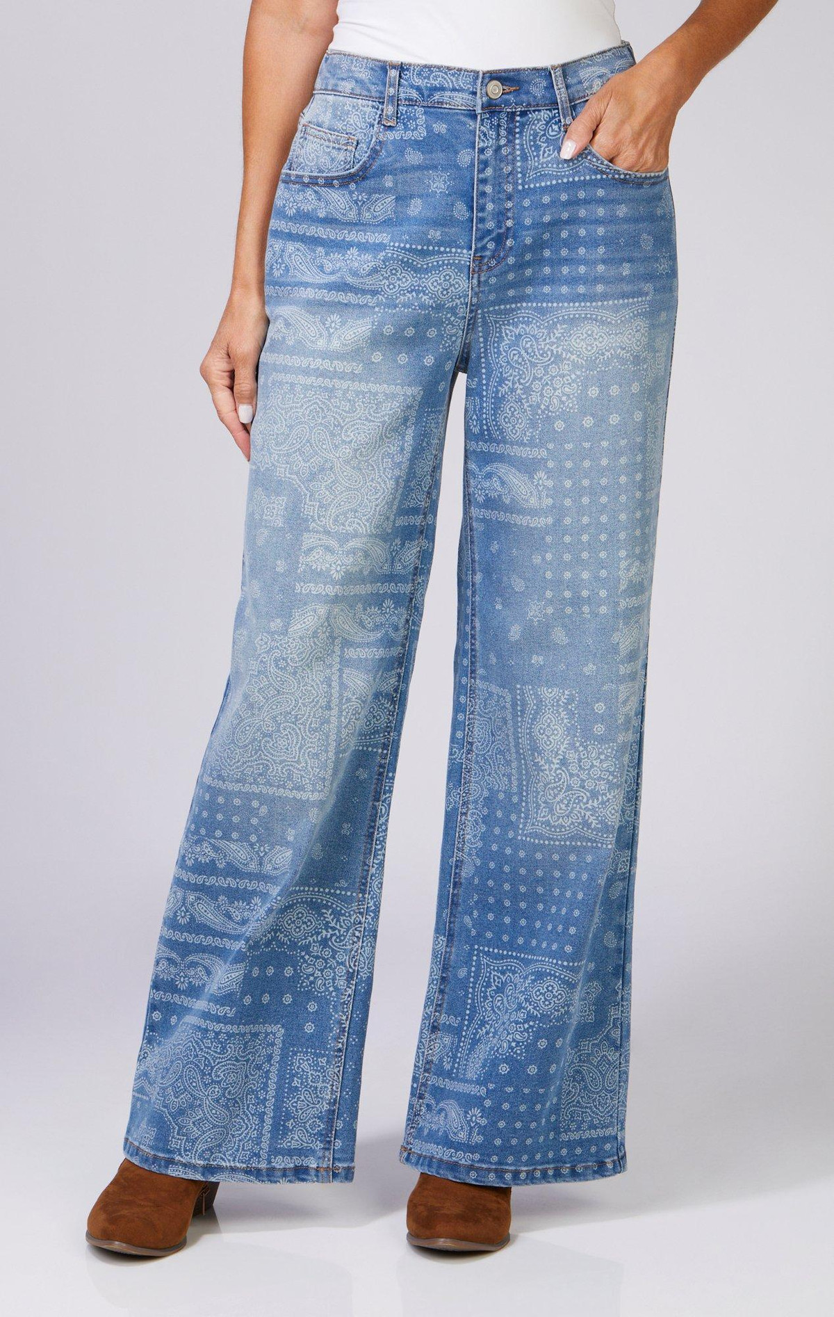 Add a bold twist to your denim collection with these Juniors Western Wide Leg Jeans. Featuring a western bandana print, mid rise fit, and wide leg silhouette, they offer standout style with everyday comfort. The back elastic waistband and five pocket cut complete the look with ease. Fabrication 69% cotton, 28% polyester, 2% spandex, 1% rayon
