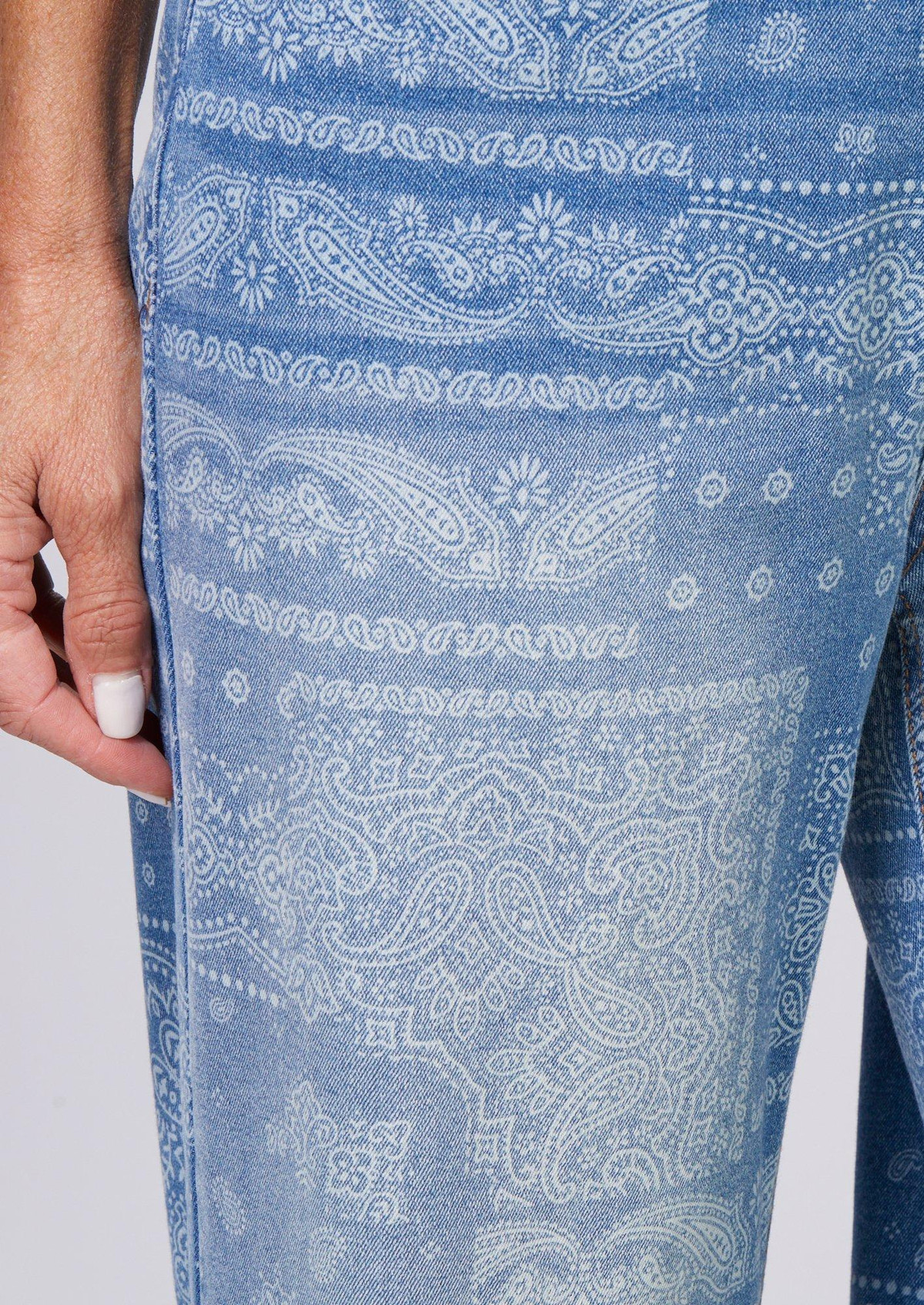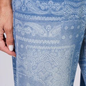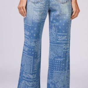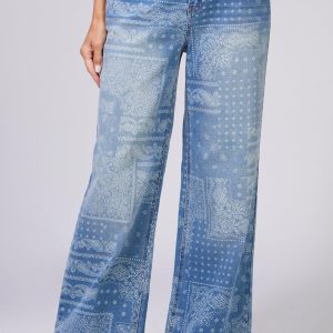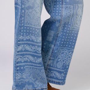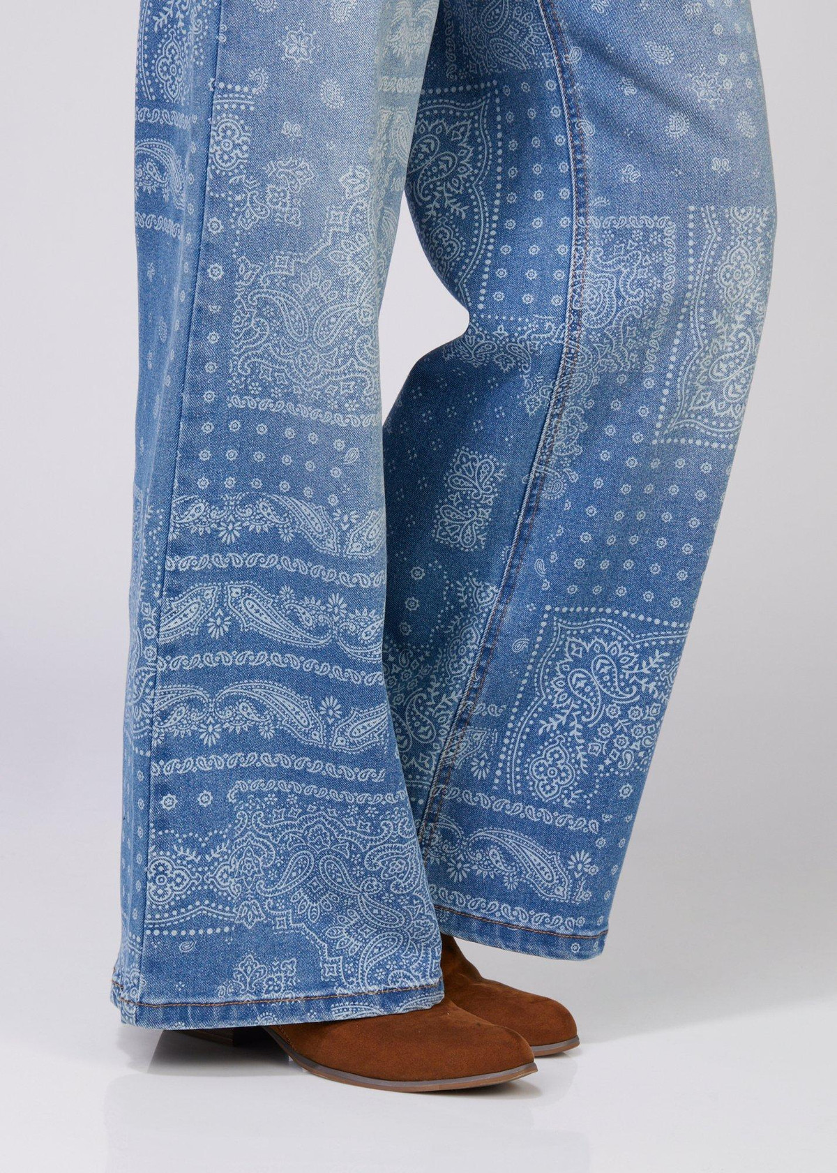 Add a bold twist to your denim collection with these Juniors Western Wide Leg Jeans. Featuring a western bandana print, mid rise fit, and wide leg silhouette, they offer standout style with everyday comfort. The back elastic waistband and five pocket cut complete the look with ease. Fabrication 69% cotton, 28% polyester, 2% spandex, 1% rayon