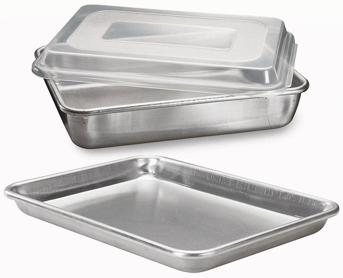 Nordic Ware 3 Piece Baking Set contains a 9” x 13” Natural Cake Pan, a 9” x 13” Natural Quarter Sheet Pan and an interchangeable storage lid. Hand wash is recommended for this set of formed aluminum baking pans.
