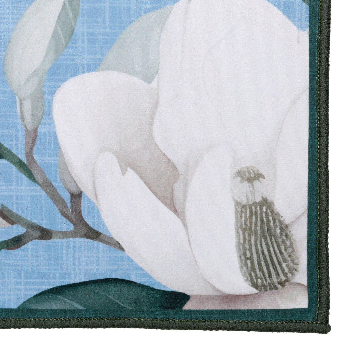 Add a touch of nature to your home with this 27 by 45 indoor accent rug in beautiful blue and green, highlighted by delicate white flowers. Made from 100 percent polyester, it feels soft underfoot and is machine washable for easy care. Perfect for brightening bedrooms, entryways, or living spaces.