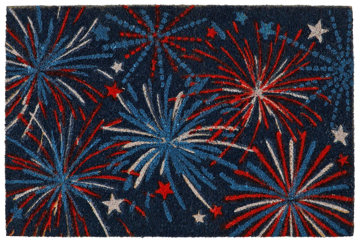 Welcome guests with a touch of patriotic charm with this Americana doormat featuring fireworks and stars in classic red, white, and blue colors. Durable and stylish, its perfect for adding a festive, all-American flair to your entrywayrain or shine. Easy to clean, just shake, sweep, vacuum, or hose off. Functional, decorative, and made for sunny days ahead! Fabrication is 100% Coir w/ 100% Vinyl backing. Measures approximately 28 in x 18 in.