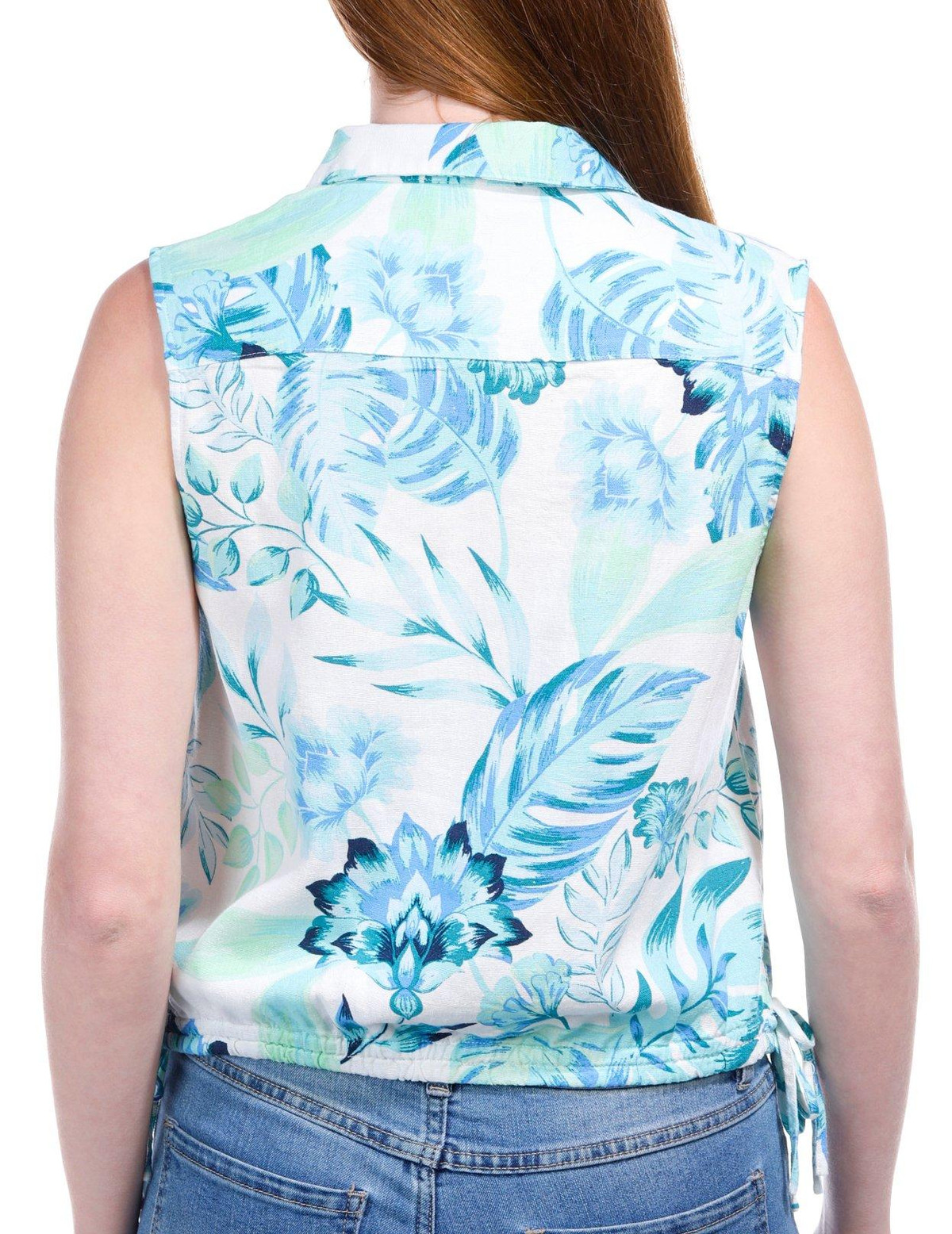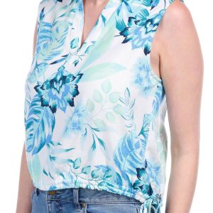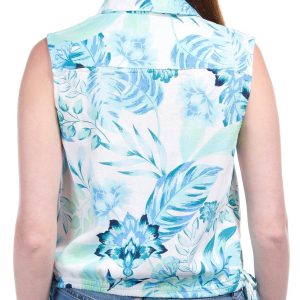 Add a touch of charm with this Sleeveless Side Tie Floral Top. Crafted from a breathable linen and viscose blend, it features a vibrant floral print, collared neckline, side ties, and a flattering banded bottom.