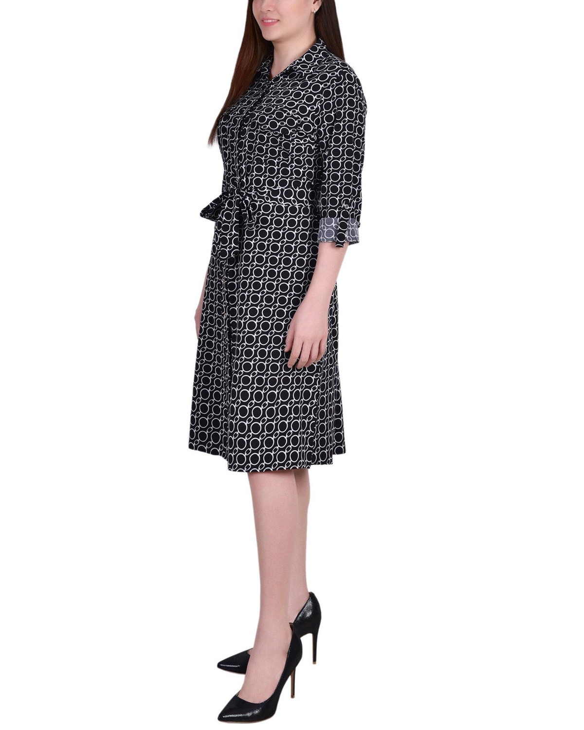 You’ll always be in style with this classic shirt-dress from NY Collection with its full button front and self belt.