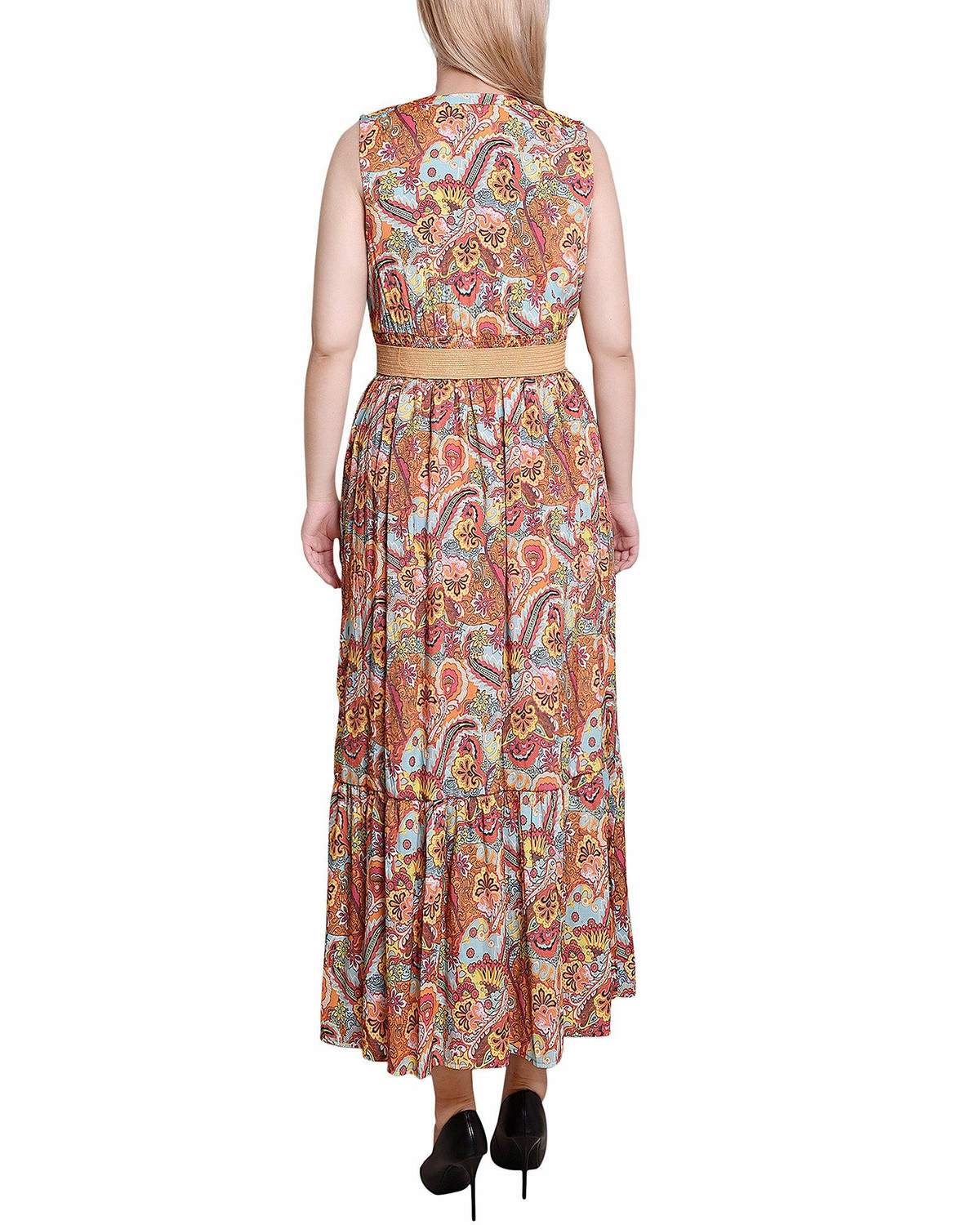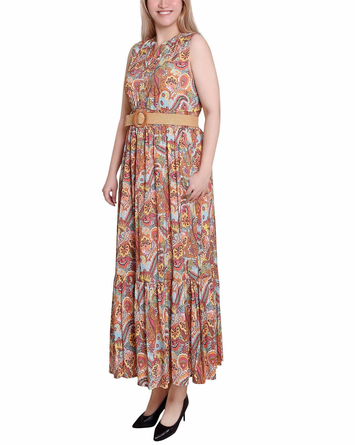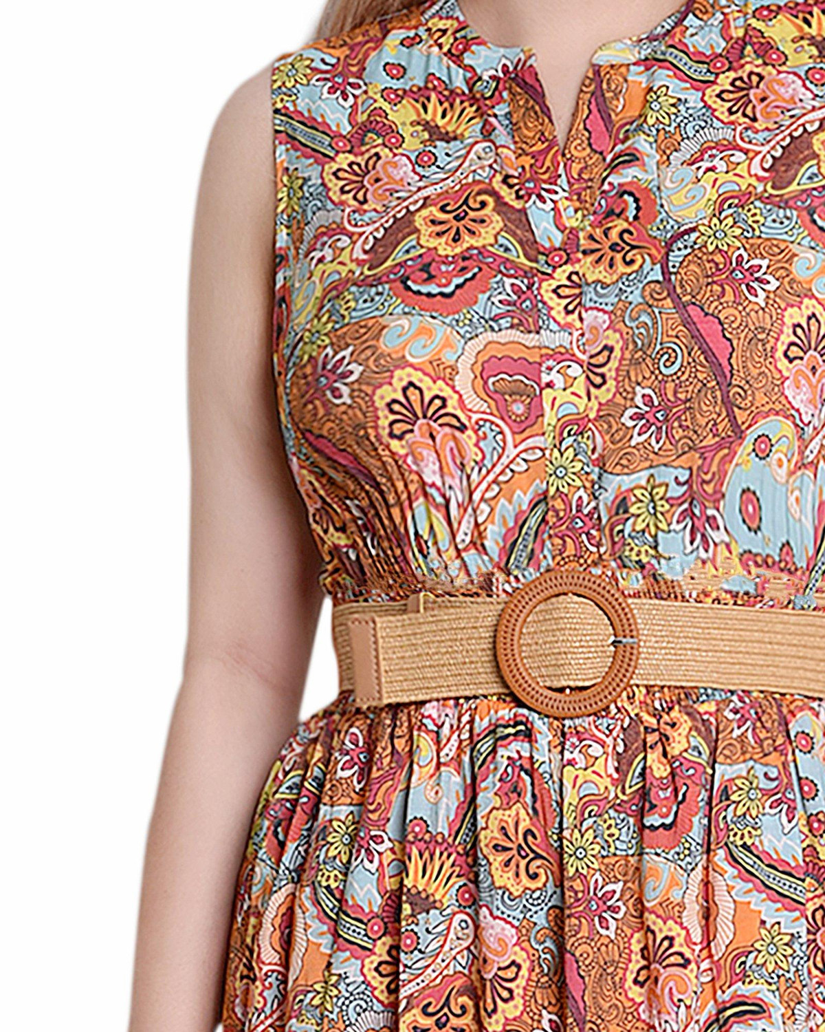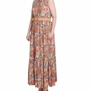 Elevate your style with this sophisticated midi dress, featuring a tiered design and a belted waist for a flattering silhouette. The sleeveless cut and notch neck adds a modern touch, while the floral paisley design in colorful crinkle rayon blend fabric brings vibrant elegance. Perfect for both work and special events, this dress effortlessly combines comfort and sophistication, making it a versatile addition to your wardrobe. Length 50 in. Fabrication 62% rayon, 38% polyester.