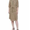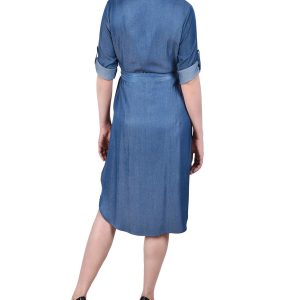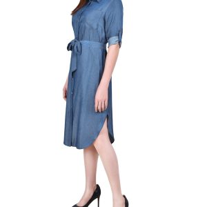 This Roll Tab Sleeve Denim Dress with full button front with a self belt and below the knee length.