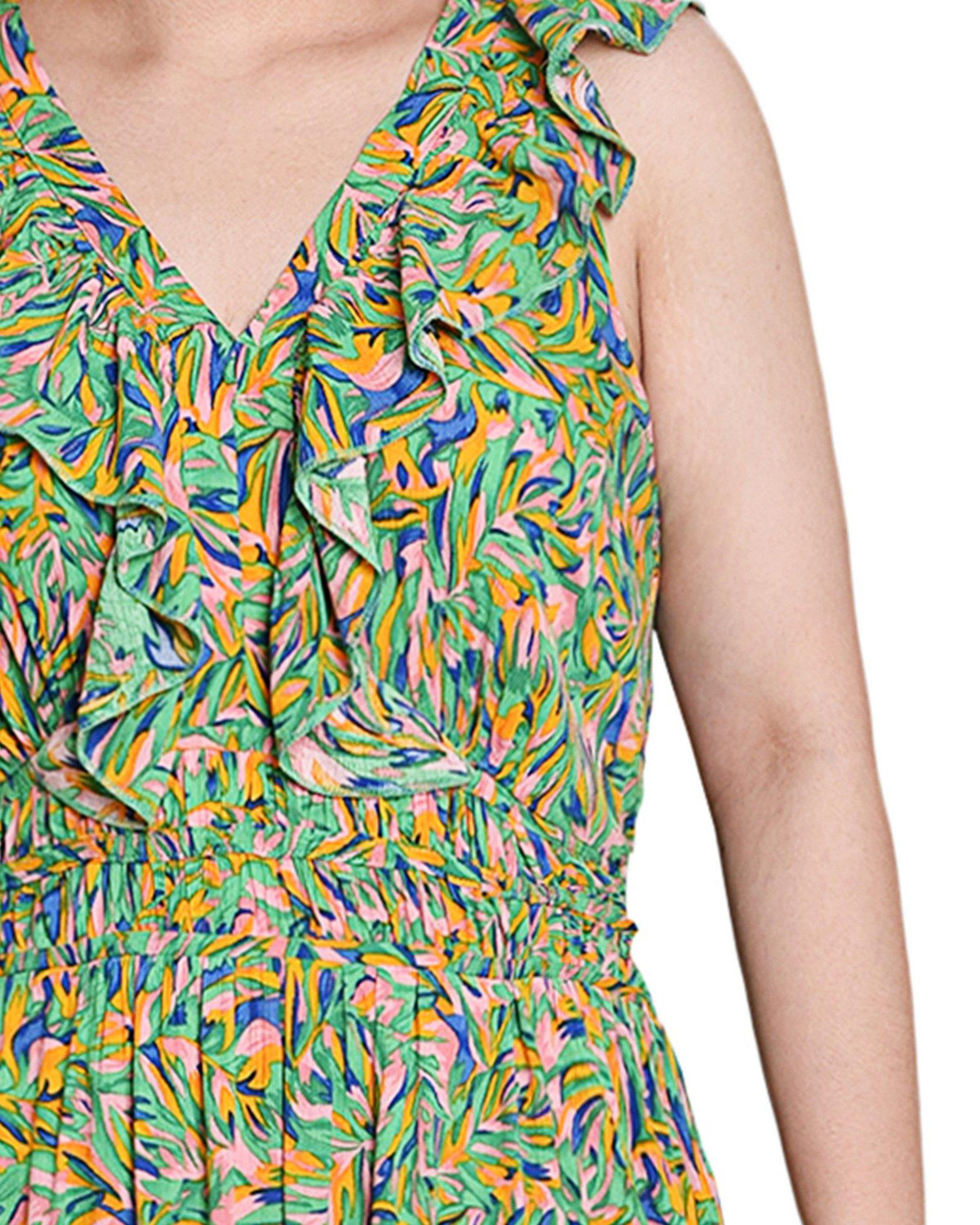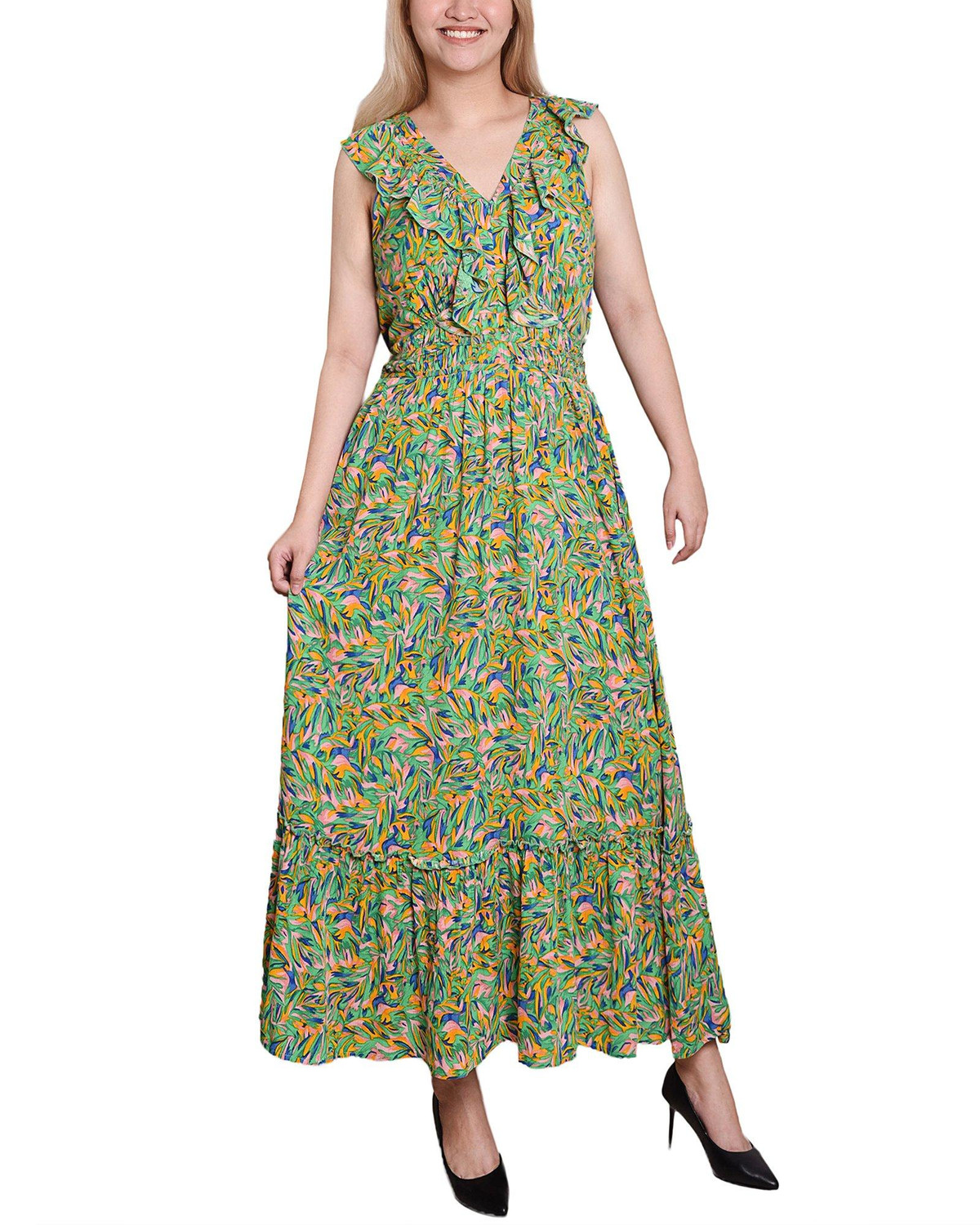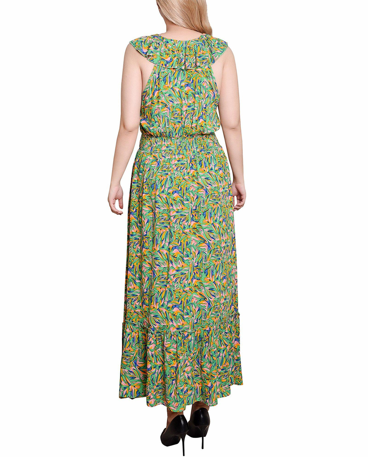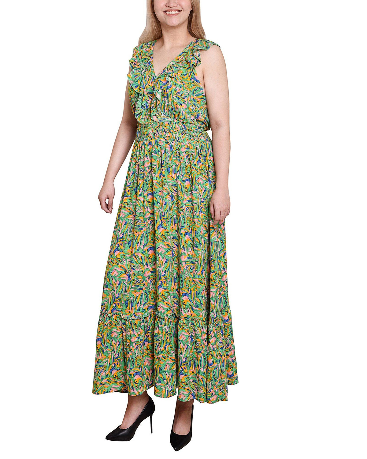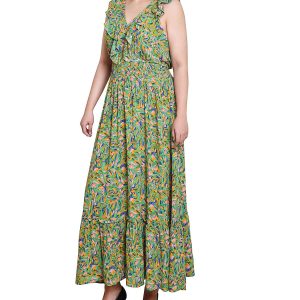 Elevate your wardrobe with this stunning chiffon maxi dress. It features a deep v-neckline with delicate ruffle details, a smocked waist that accentuates your figure, and a tiered hem for a playful touch. Perfect for a fun, flirty, and fashion-forward look, this versatile dress is ideal for both work and casual outings with friends and family. Embrace effortless elegance and make a statement wherever you go! Length 51 in. Fabrication 100% rayon.