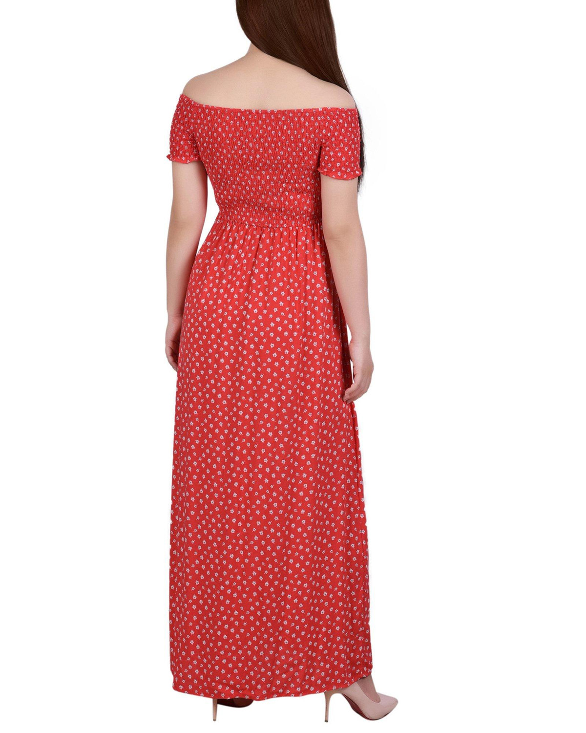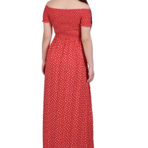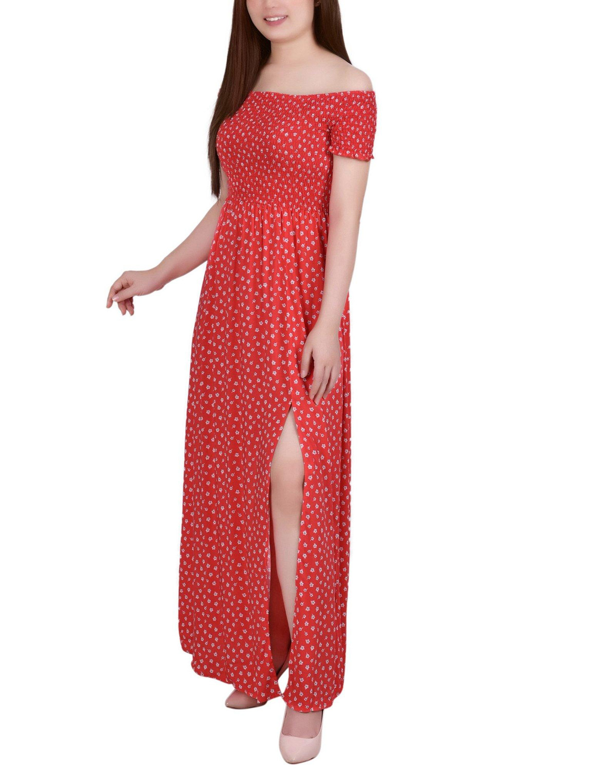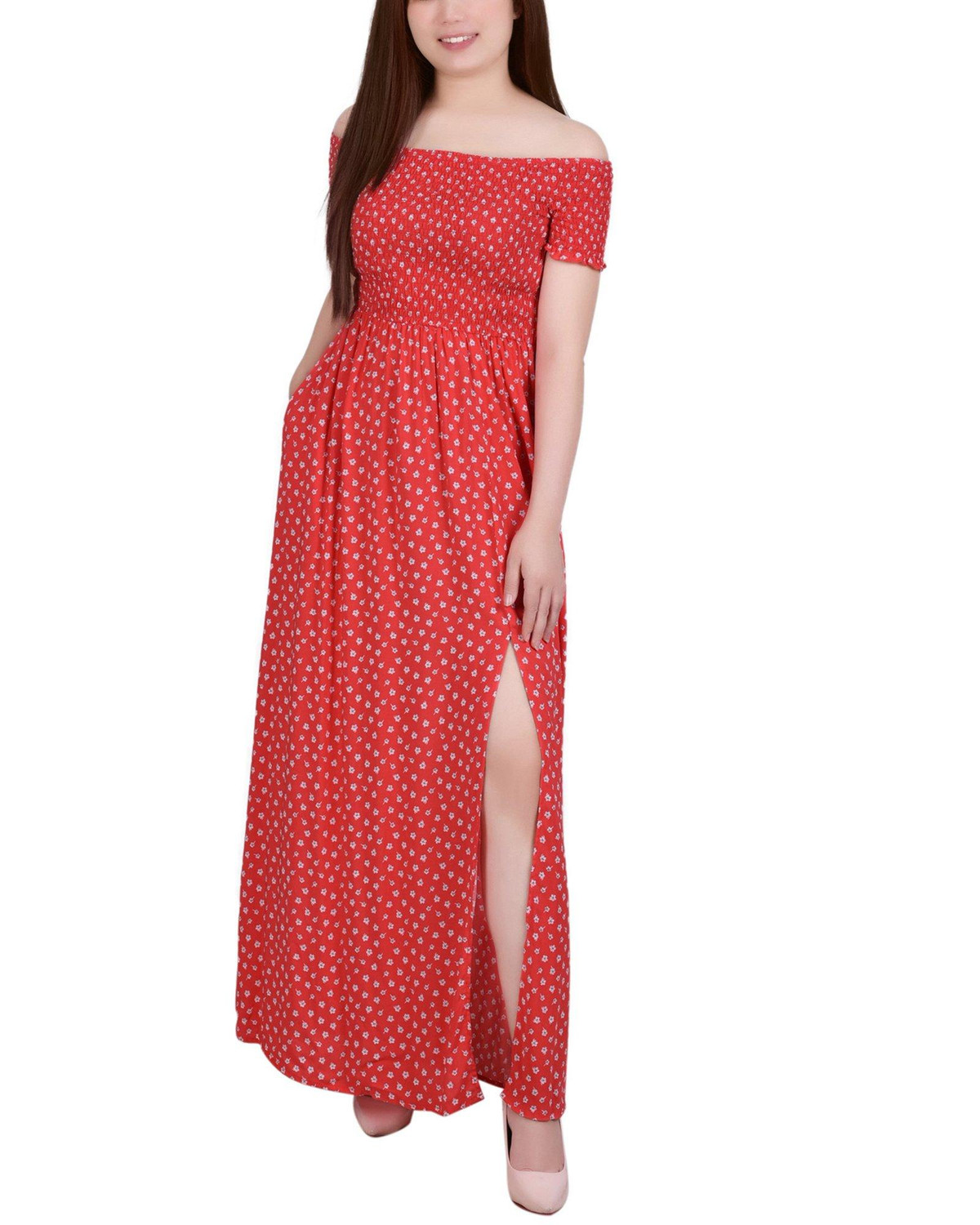 Embrace elegance with this sophisticated maxi dress, perfect for both day and evening wear. The off-shoulder design and smocked bodice create a flattering, feminine silhouette, while the short sleeves and side slit add a touch of allure. Adorned with a delicate floral design, this dress combines style and comfort, making it an ideal choice for any occasion. Dress length approximatley 42 in. Fabrication 100% rayon.