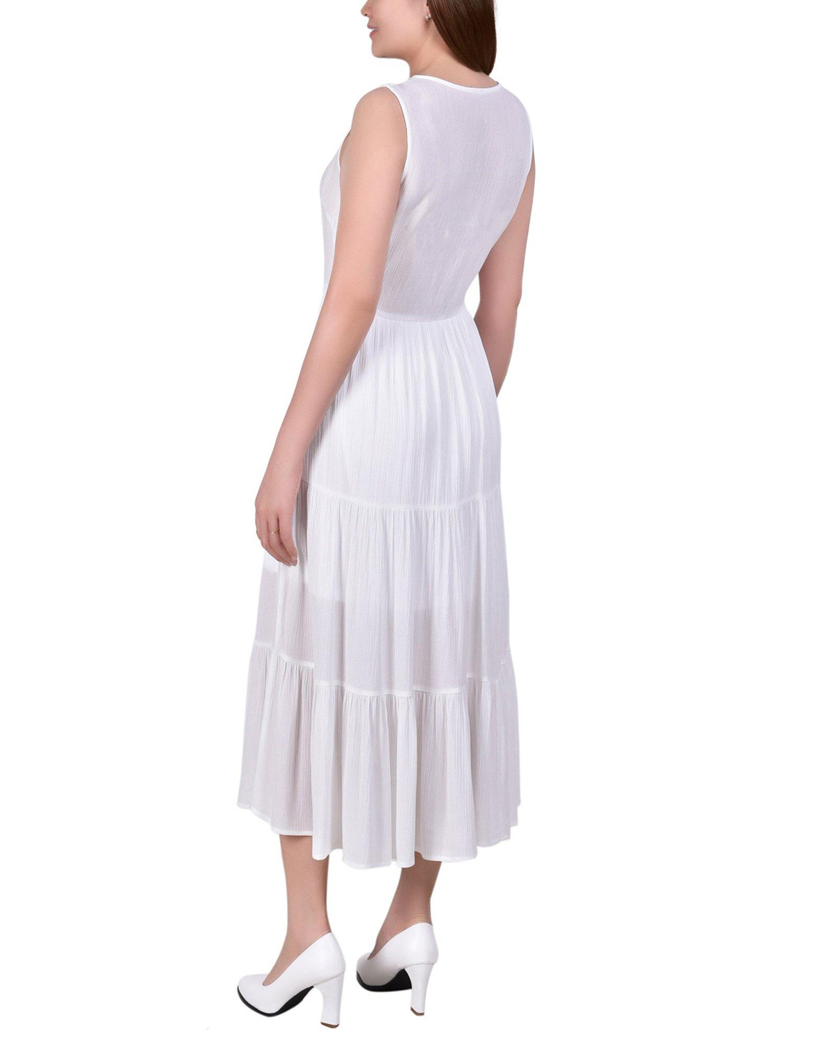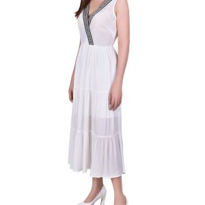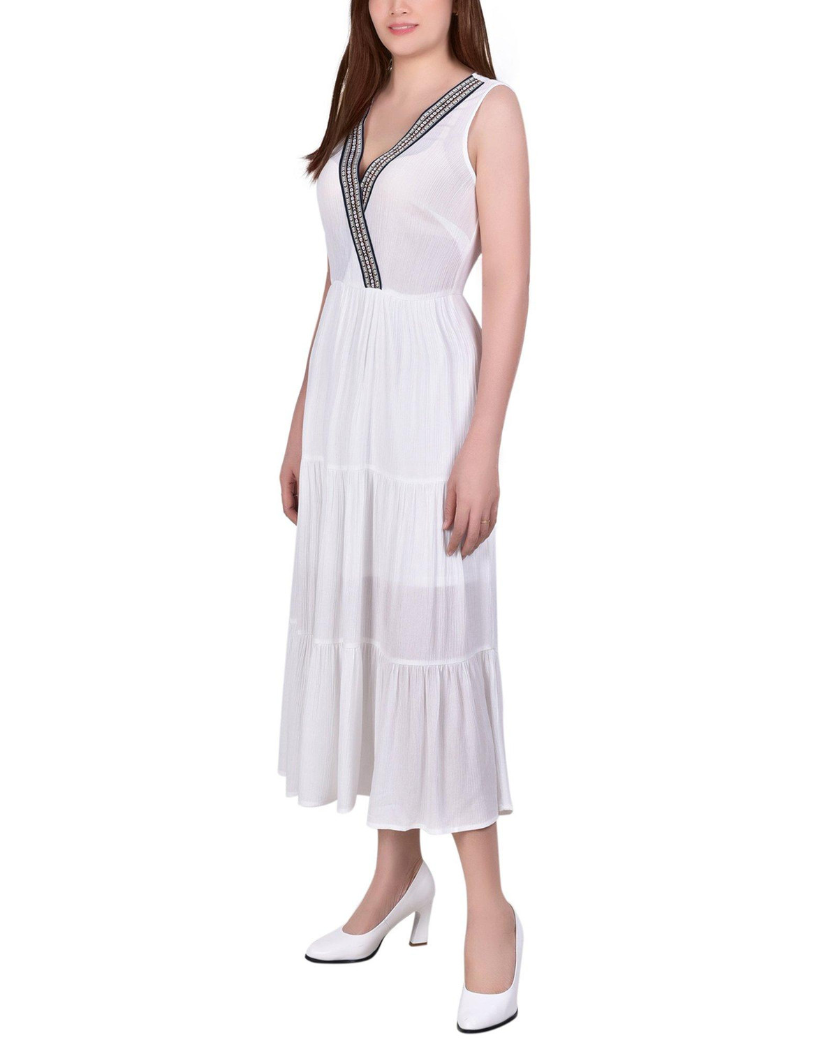 You will stand out in a crowd in this beautiful surplice neckline dress from NY Collection. Embroidered tape highlights your neckine.
