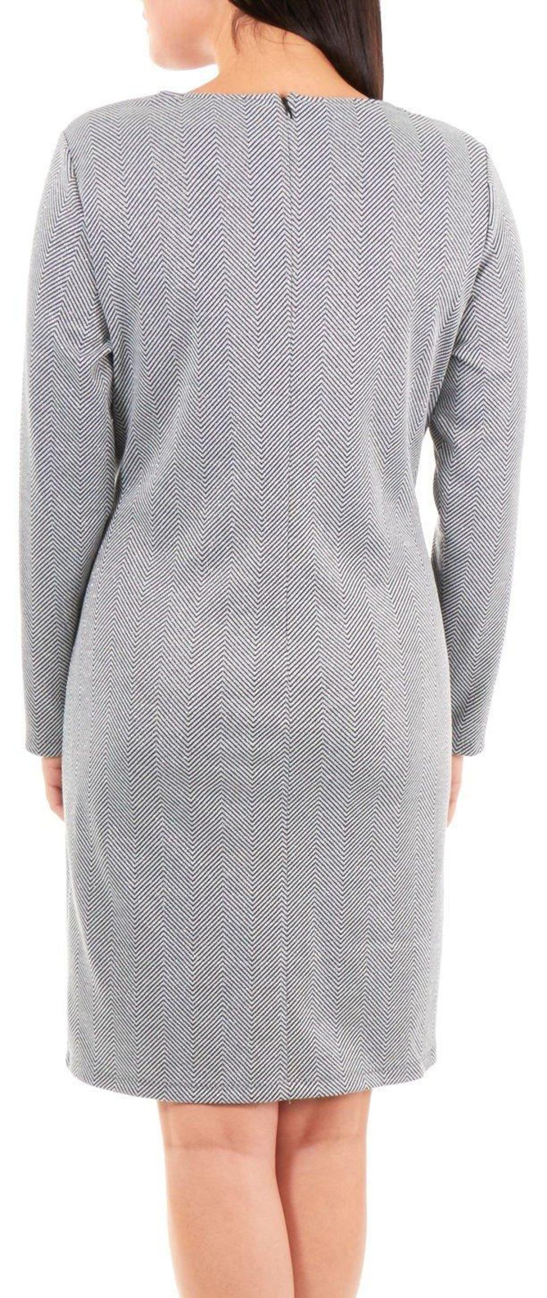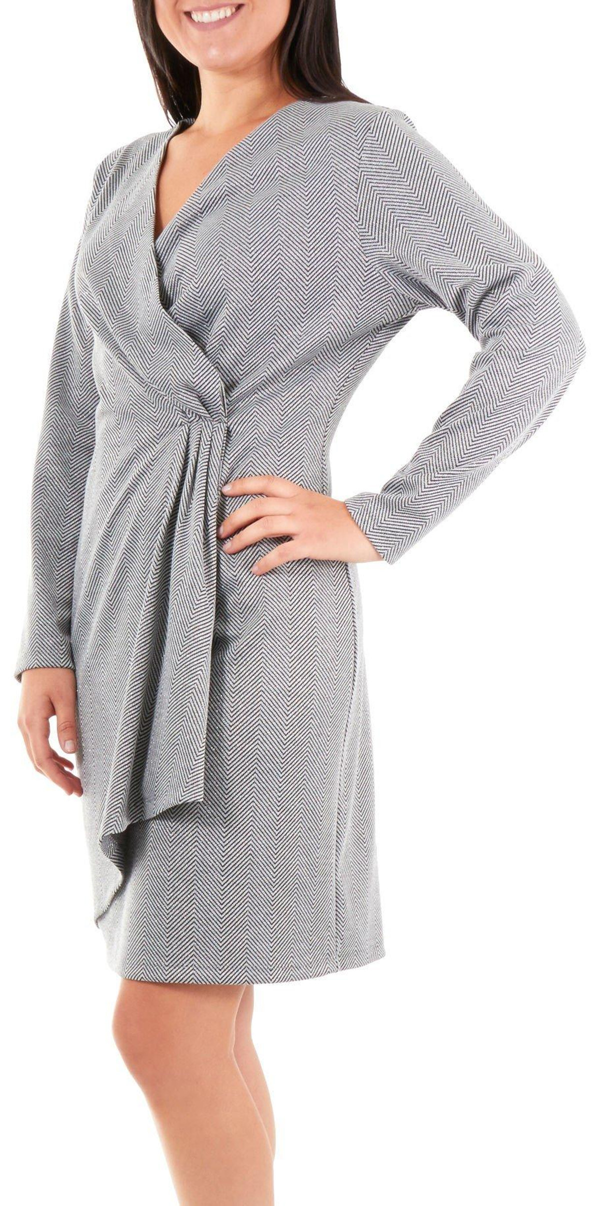 NY Collection brings a comfortable and stylish look to your wardrobe. Lurex thread pattern adds festive appeal to this sheath dress designed with an asymmetrical wrap front with pleats for a flattering, sophisticated finish. Length is approximately 37.5 inches from size medium.