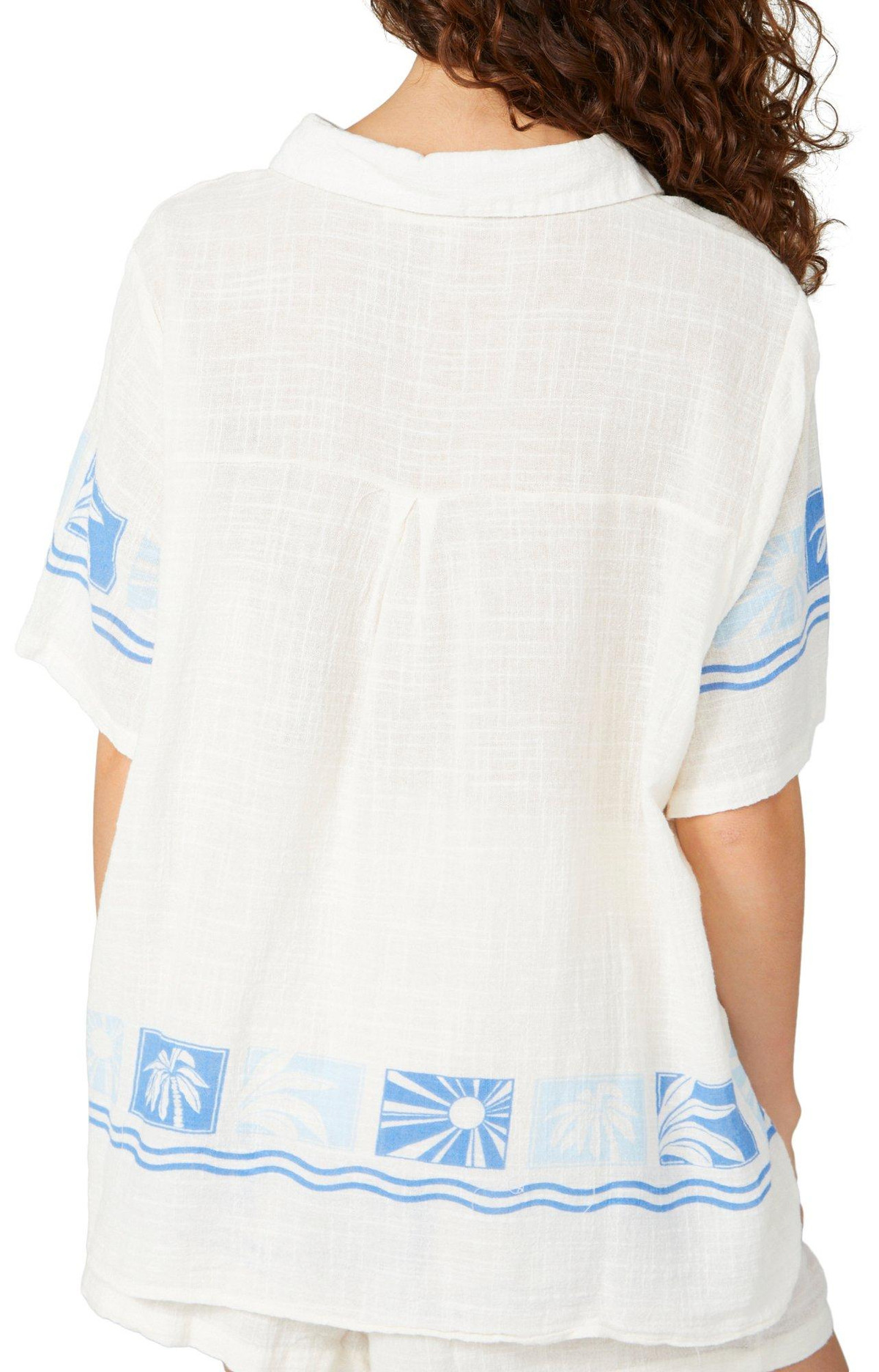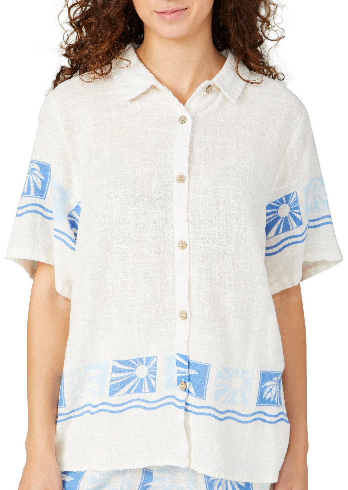 Embrace coastal vibes with our Juniors Coastal Gauze Short Sleeve Top. Made from 100% cotton, this top features a coastal inspired print, button down front, collared neckline and short sleeves.