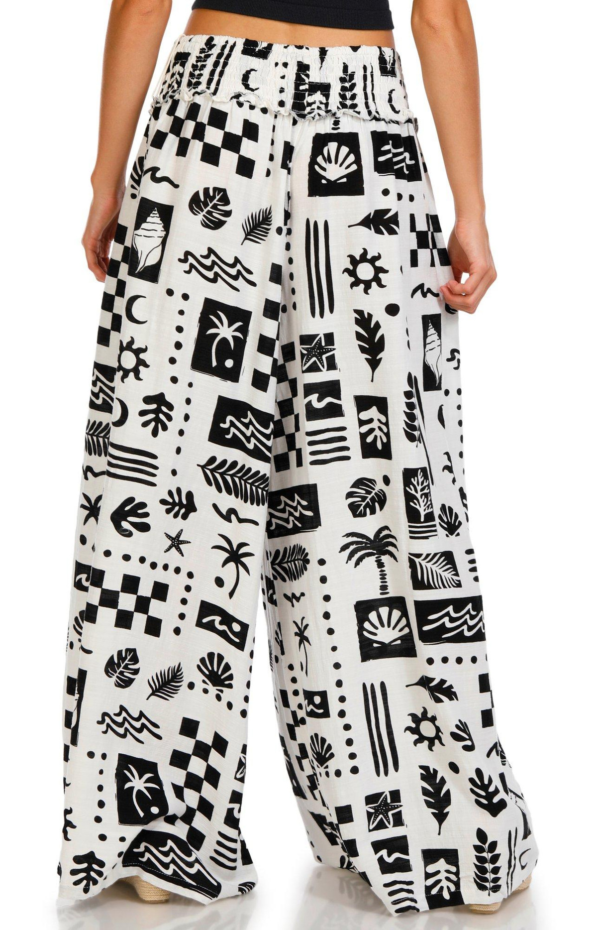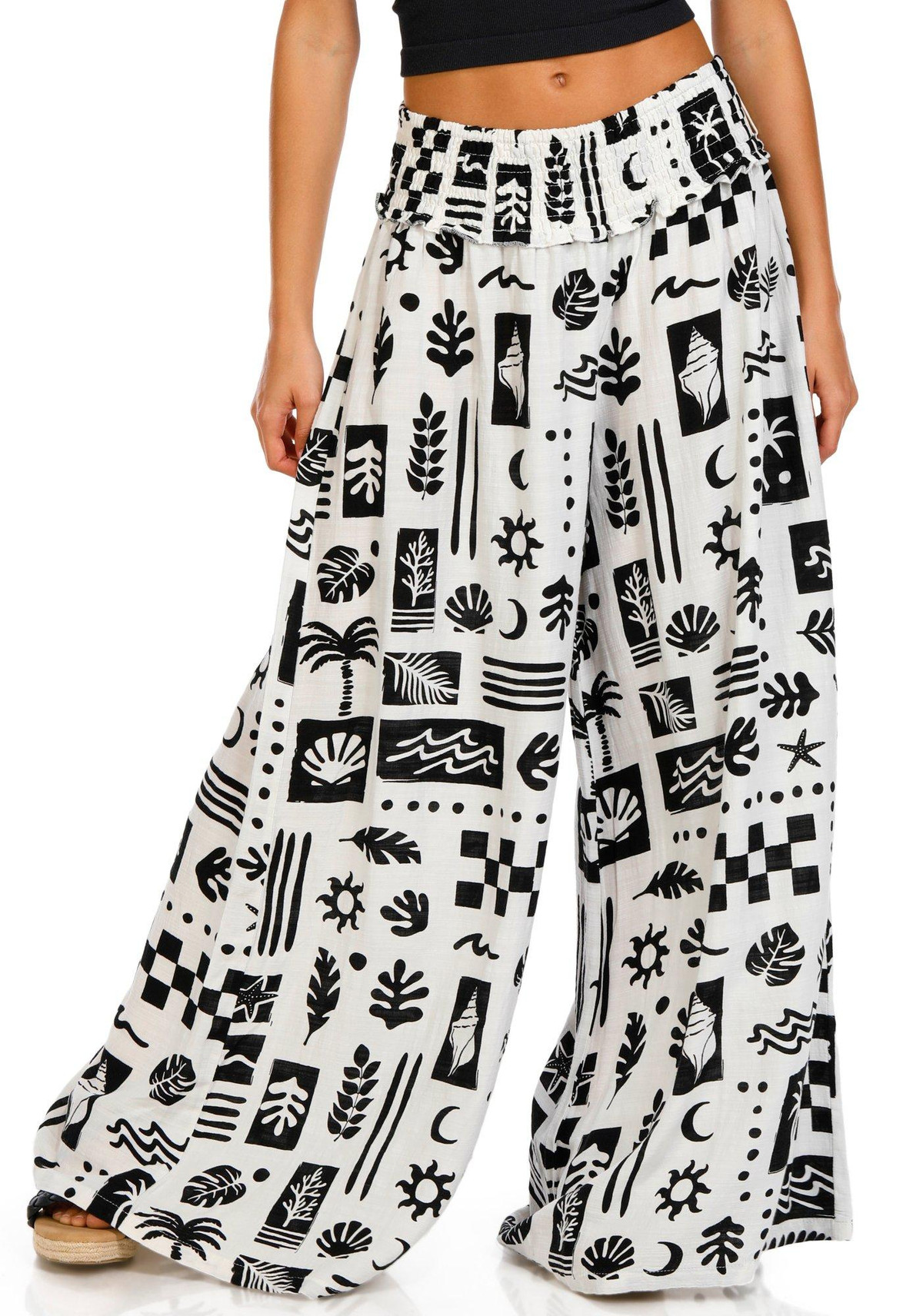 These wide leg pants feature a smocked elastic waist for a comfortable fit and a bold print pattern for standout style. Lightweight and flowy, theyre perfect for relaxed, warm weather looks.