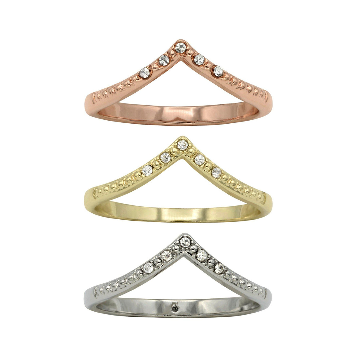 Chic and modern, this three tone ring set features a sparkling solitaire paired with a stylish chevron band adorned with pave accents. Perfectly packaged for gifting, it’s a versatile and elegant addition to any jewelry collection.