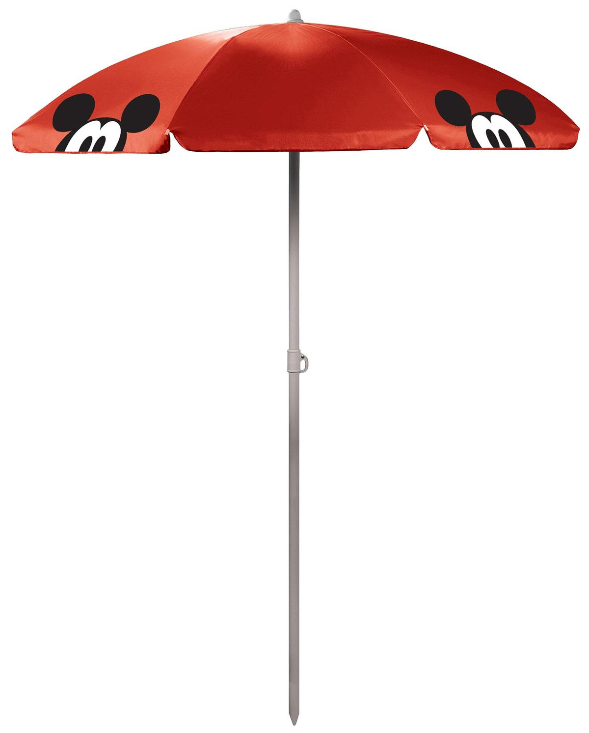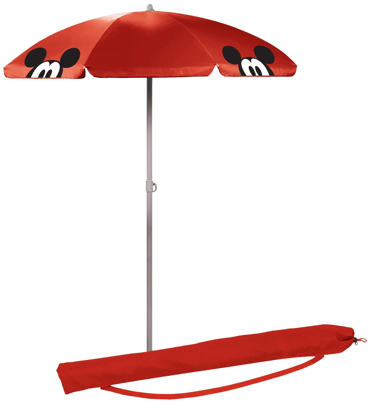 This umbrella is perfect for the beach, tailgating, or picnics. The pole measures 81.5” tall and 1.3” diameter with a tilting option as well as pointed end for easier penetration into the ground. Umbrella measures 5.5′ across and features Mickey Mouse design. Sturdy drawstring bag with strap included.
