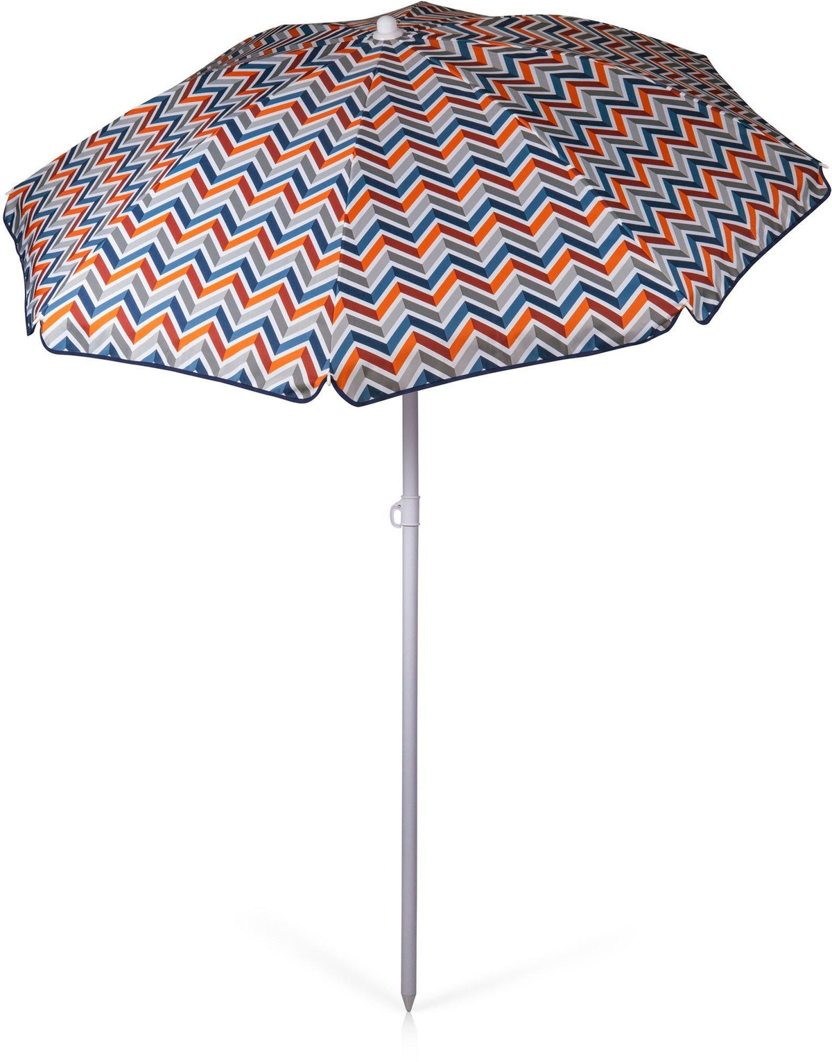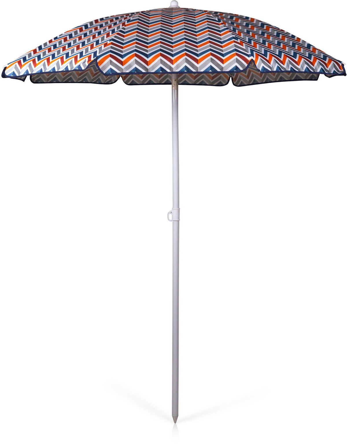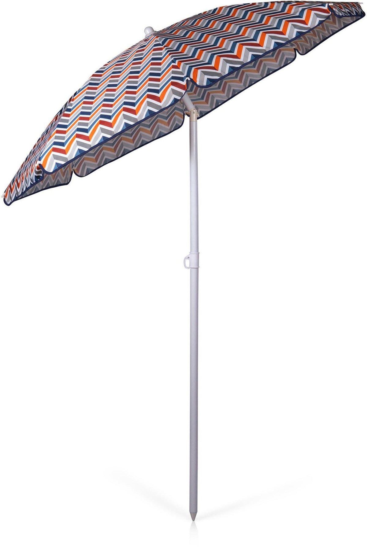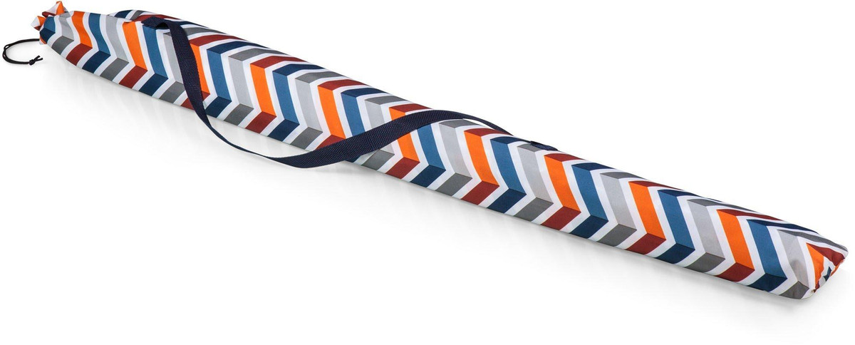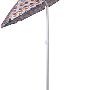 This umbrella is perfect for the beach, camping, or picnics. The pole measures 79.5” tall and 1.25” diameter with a tilting option as well as pointed end for easier penetration into the ground. Umbrella measures 57.5” across. Sturdy carry bag with handle included.