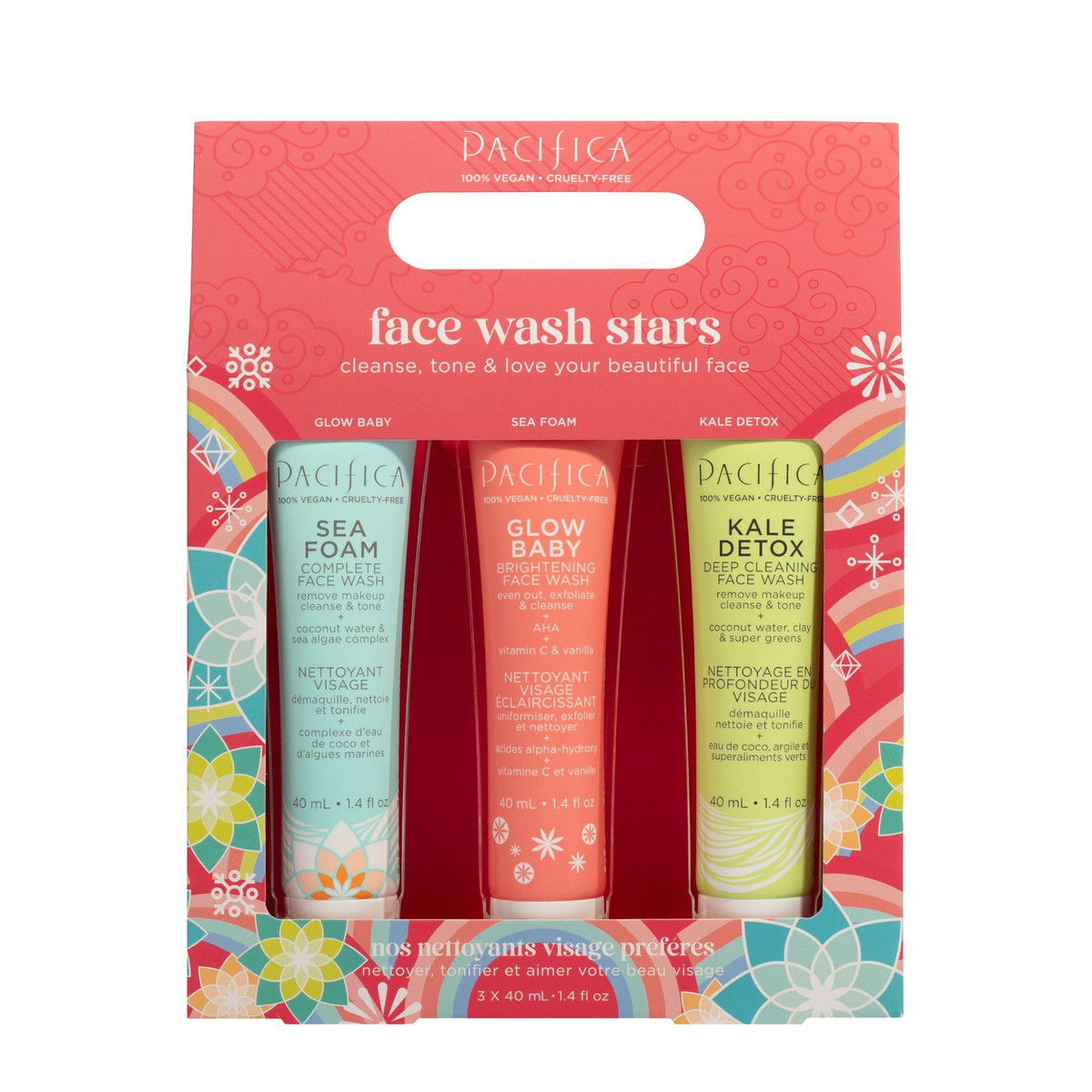 This set features 3 of the best-selling face-washes by Pacifica, now in practical travel-friendly sizes! It includes the Glow Baby Brightening Face Wash, Kale Detox Deep Cleaning Face Wash, and Sea Foam Complete Face Wash. All 3 are formulated to be free of harsh chemicals to leave you with healthier, happier skin. Contain 1.4 Oz each.