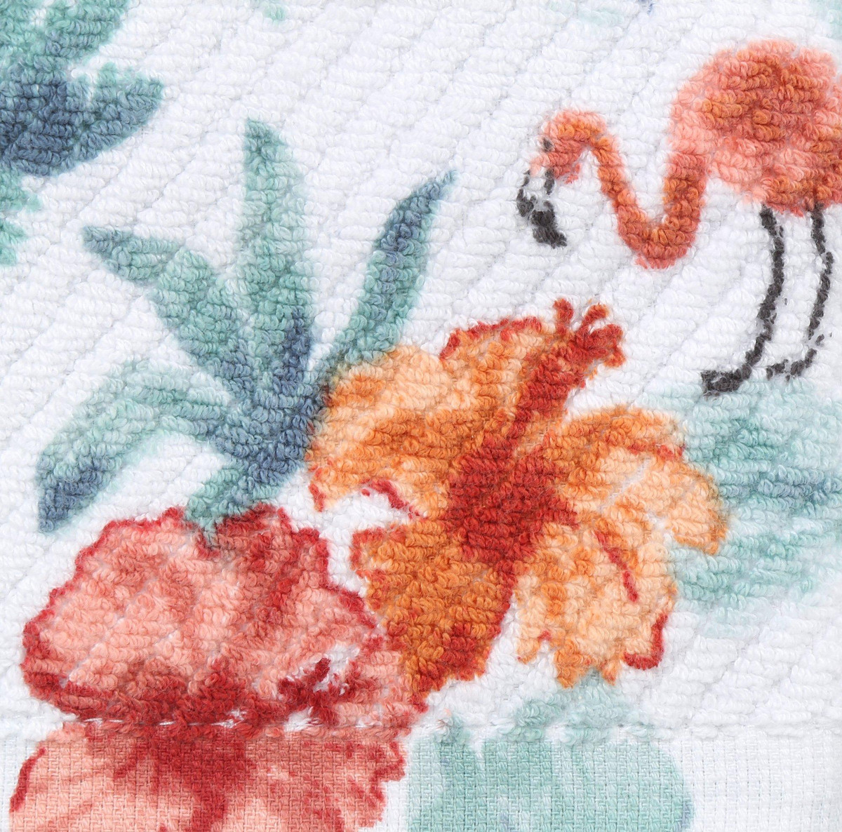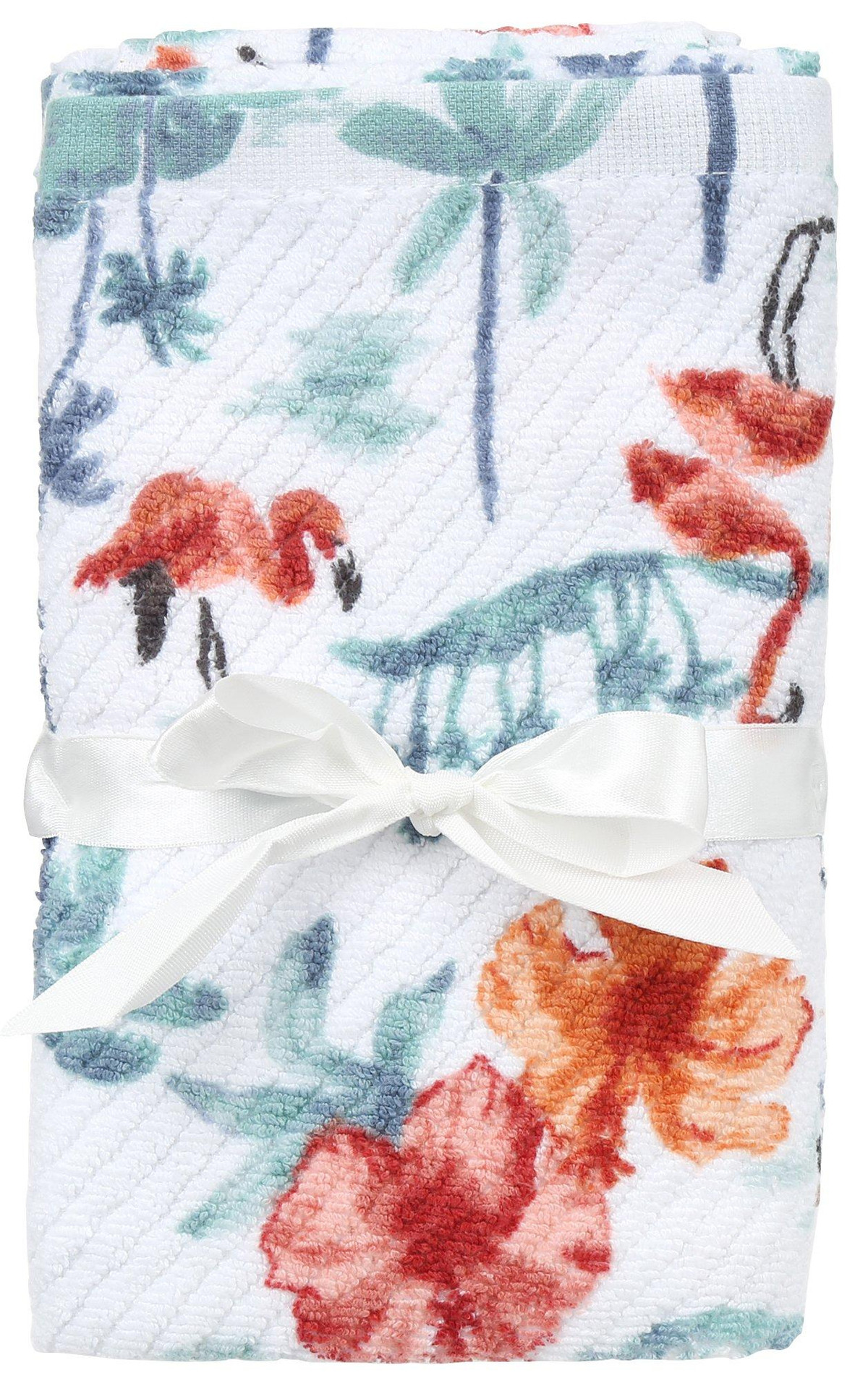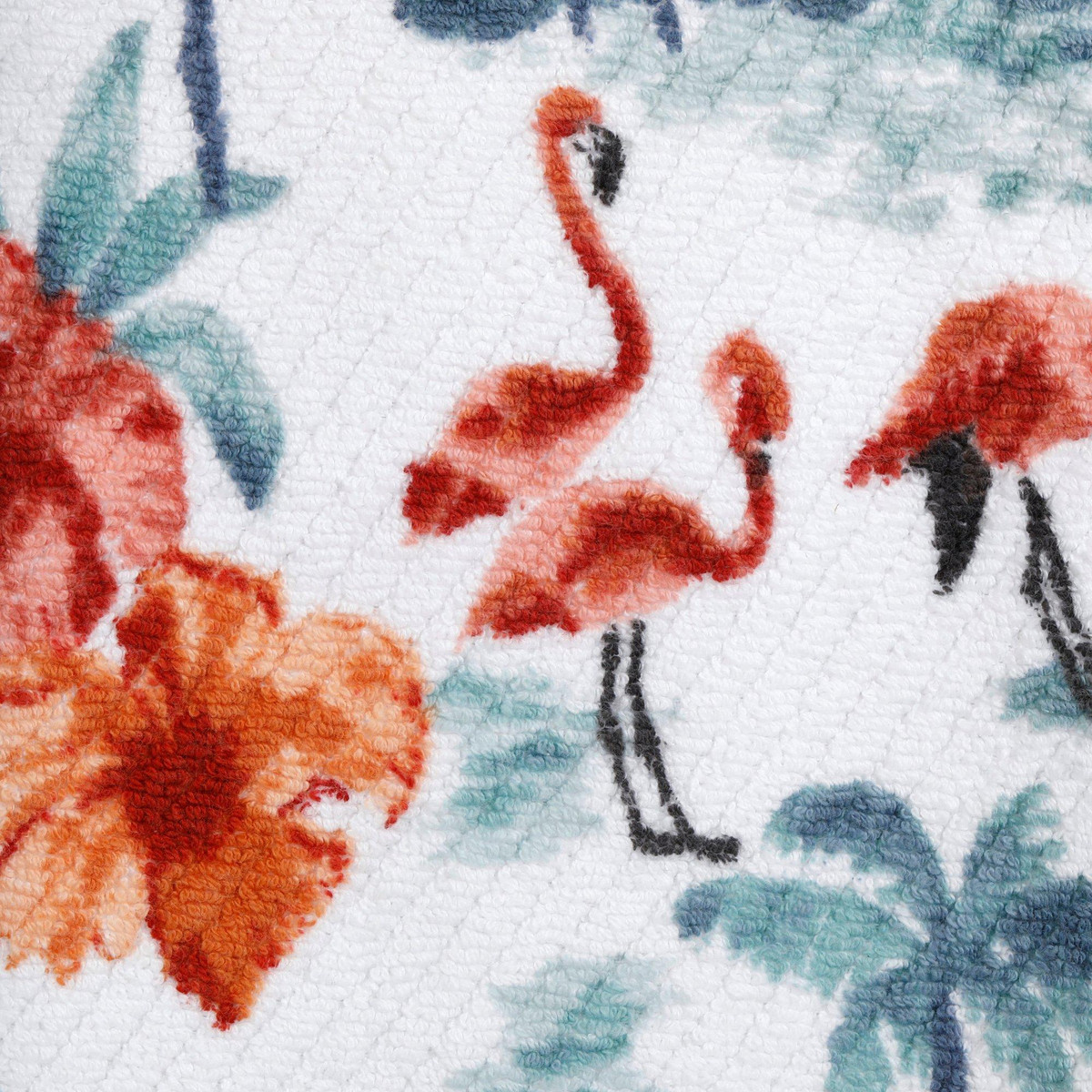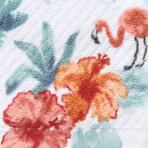 Add a coastal flair to your bathroom with the Flamingo Print towel collection. The towels feature a soft woven cotton fabric and a colorful print design featuring palms and flamingos. Bath towel measures 27 in x 52 in. 2-pack hand towels measure 26 in x 16 in. each. 2-pack fingertip towels measures 12 in x 18 in. each. This towel collection is not a set. Each towel sold separately (hand towel and fingertip towel comes as two-piece sets).