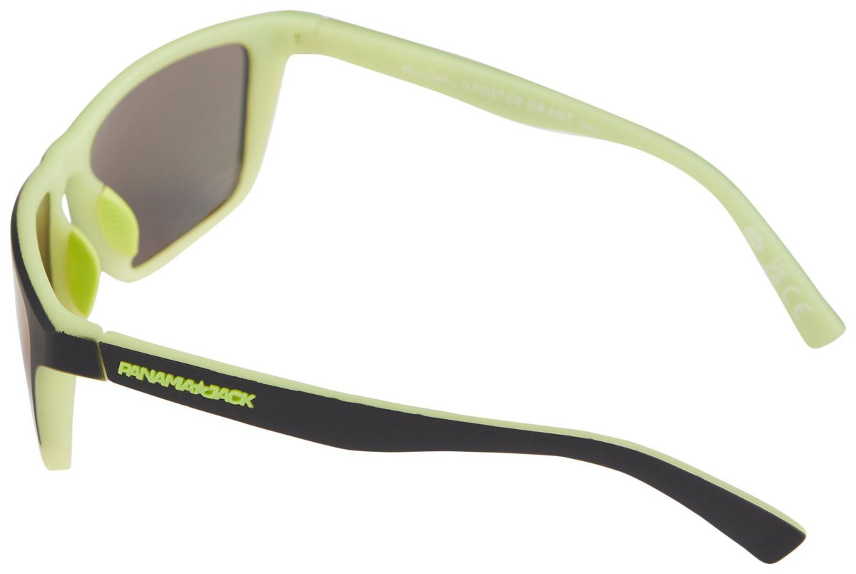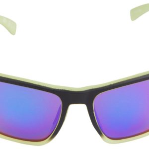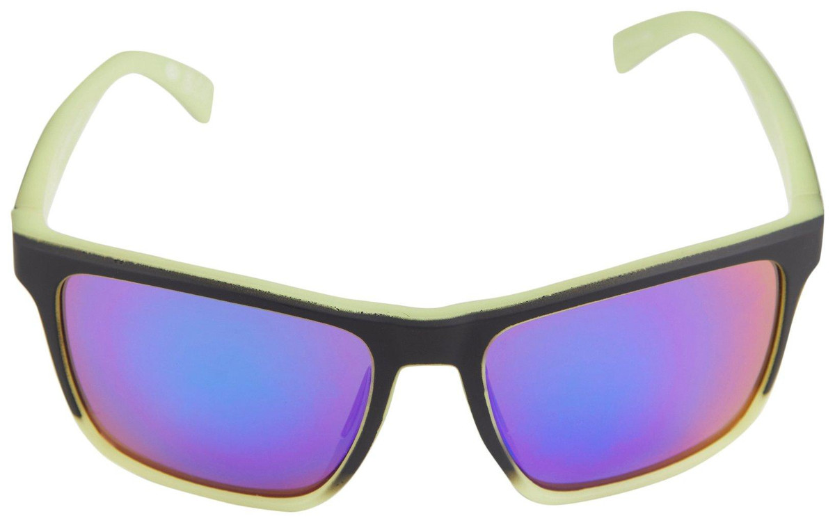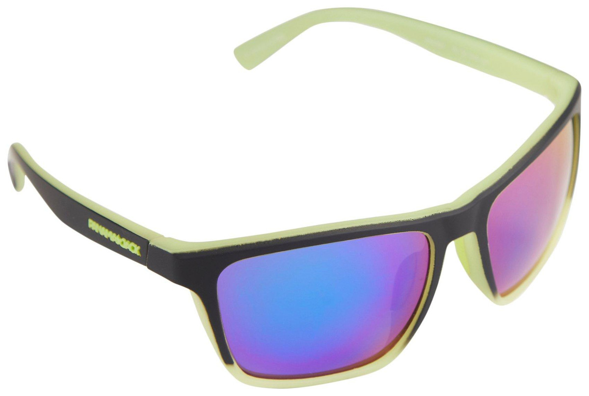 The sunglasses feature a black frame with a yellowish green accent color on the temples and around the lenses. The lenses themselves have a mirrored finish with a blue and purple gradient.