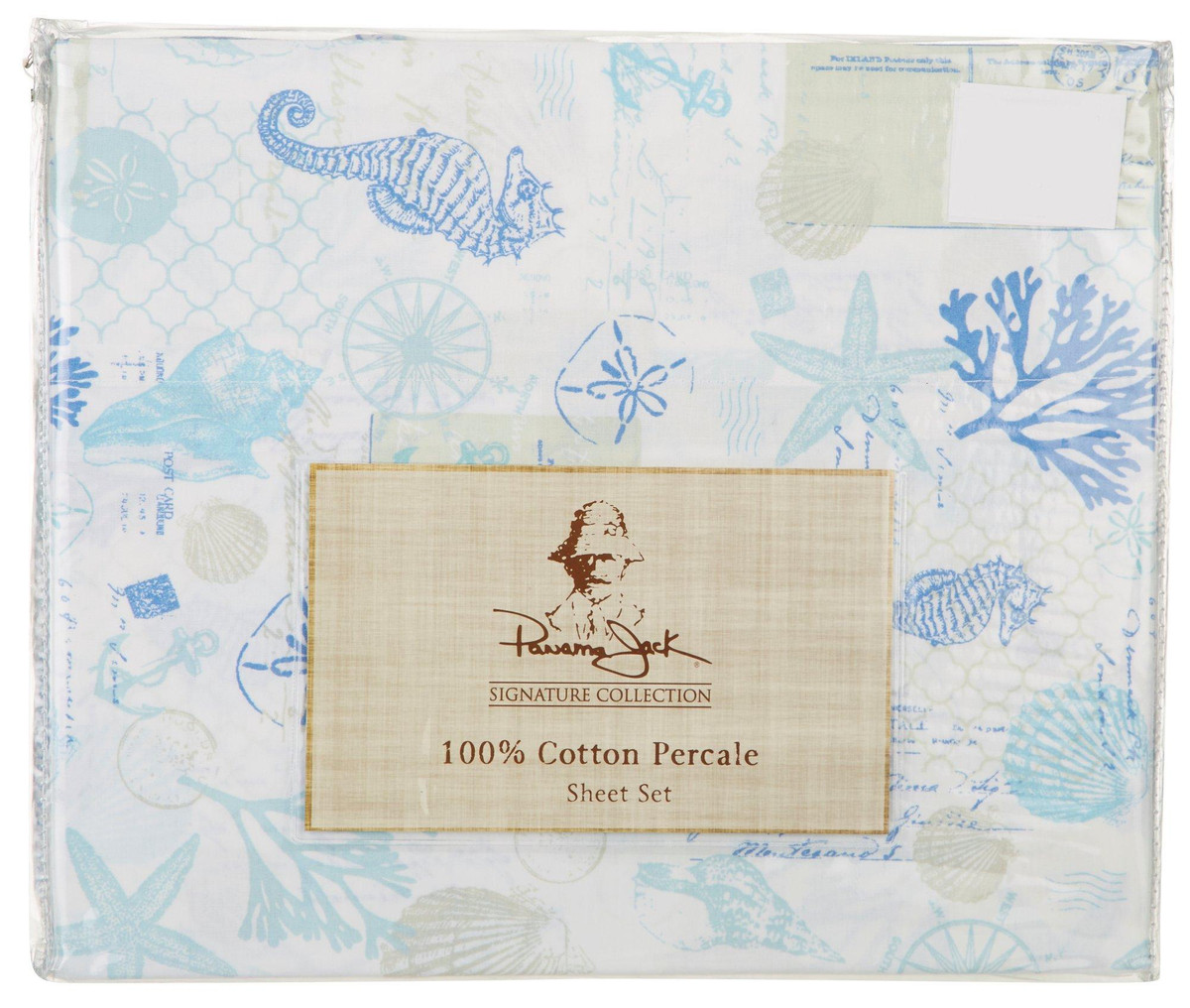 Pick up a piece of the Panama Jack lifestyle and relax into your favorite time and place. This sheet set features a coastal seahorse, coral, sea shell, and post card design, and a comfortable 100% cotton percale fabrication. Set includes one flat sheet, one fitted sheet, and two pillowcases (one for twin size).
