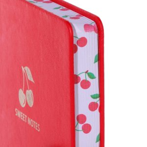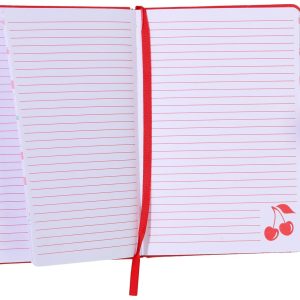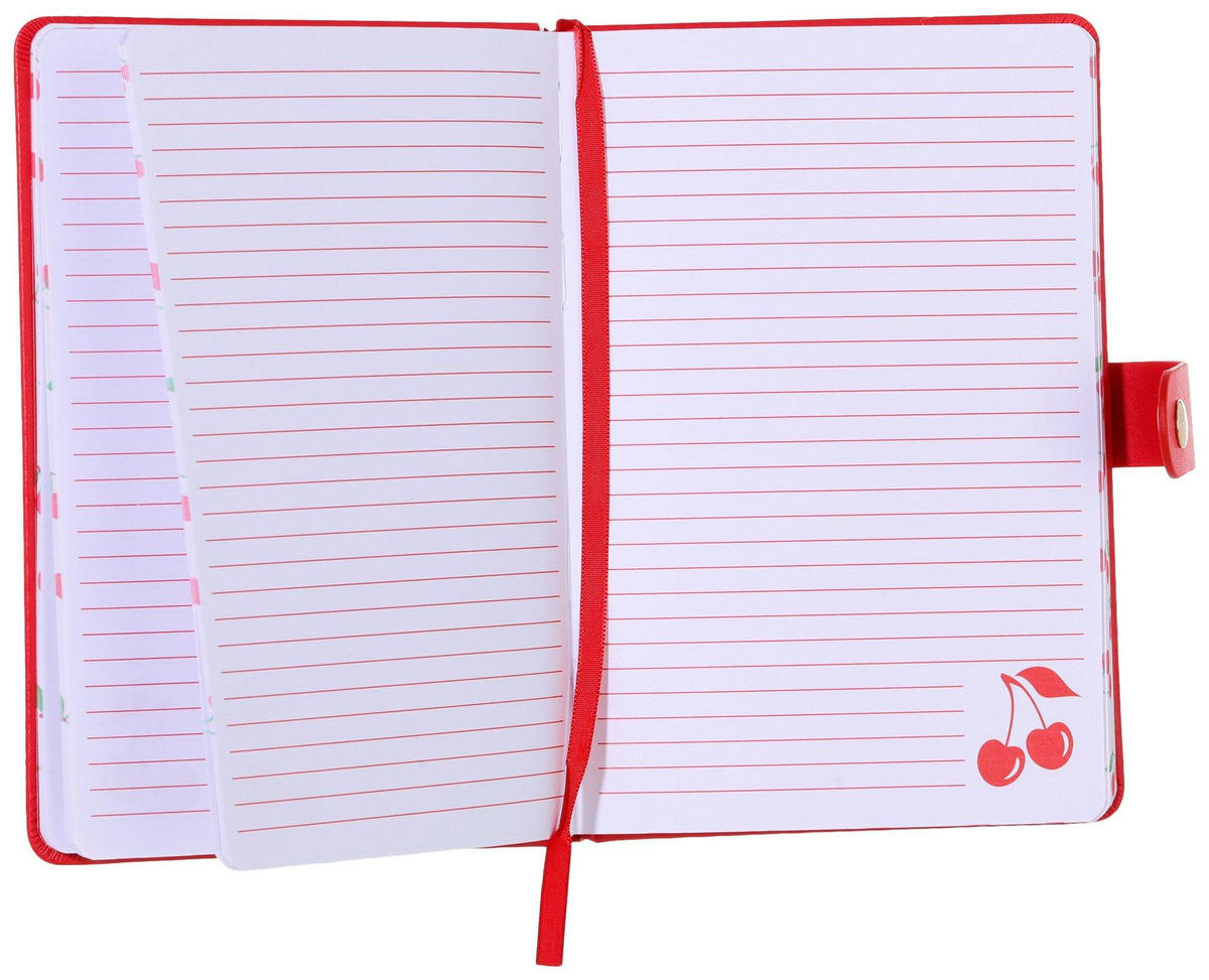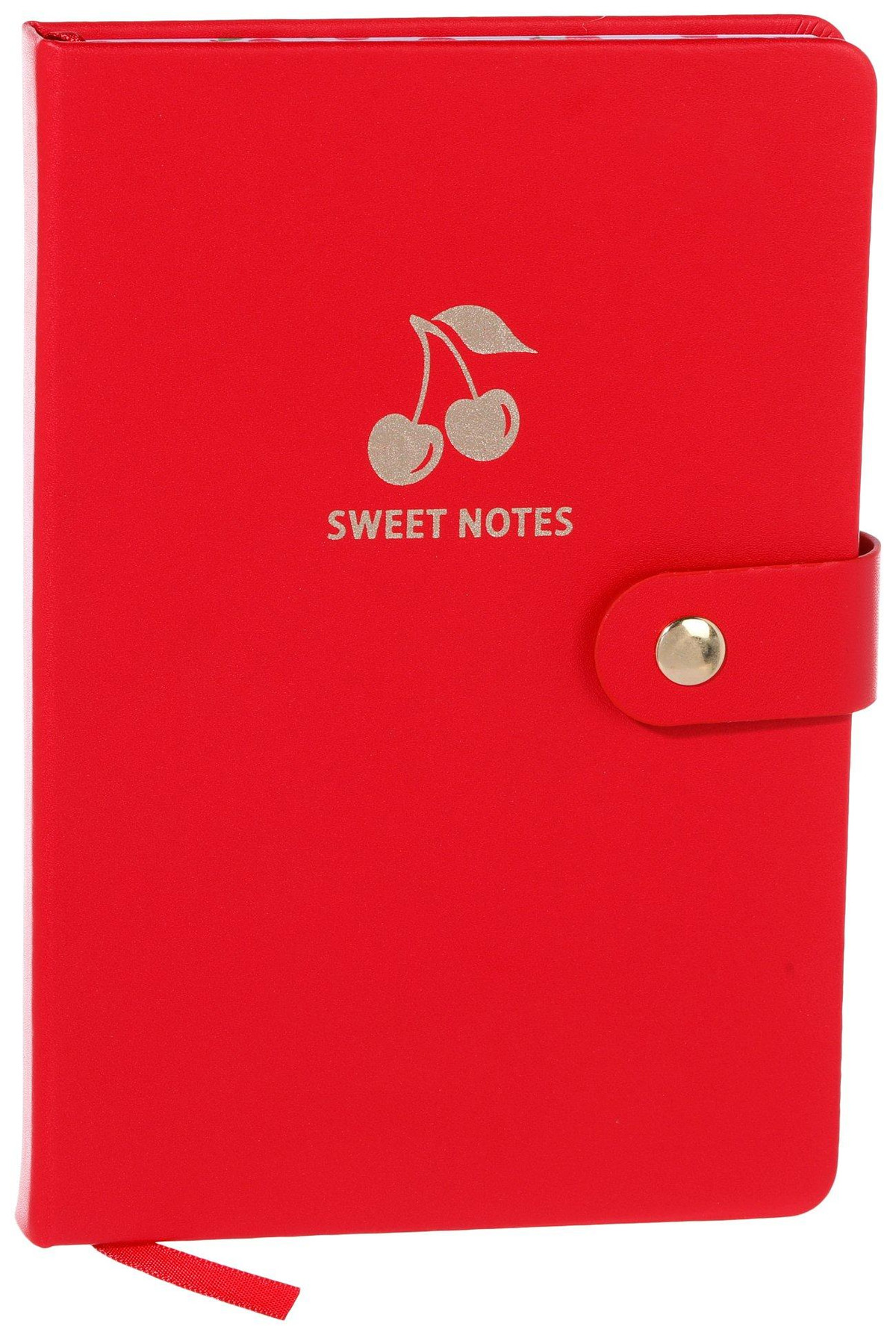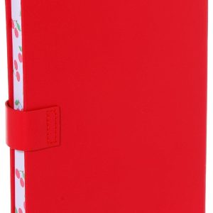 This bound journal features a charming cherry design with coordinating accents around the page edges. Finished with a secure clasp closure, it offers a playful and practical space for jotting down thoughts, lists, or everyday reflections. Measures approximately 8 in x 5.5 in.