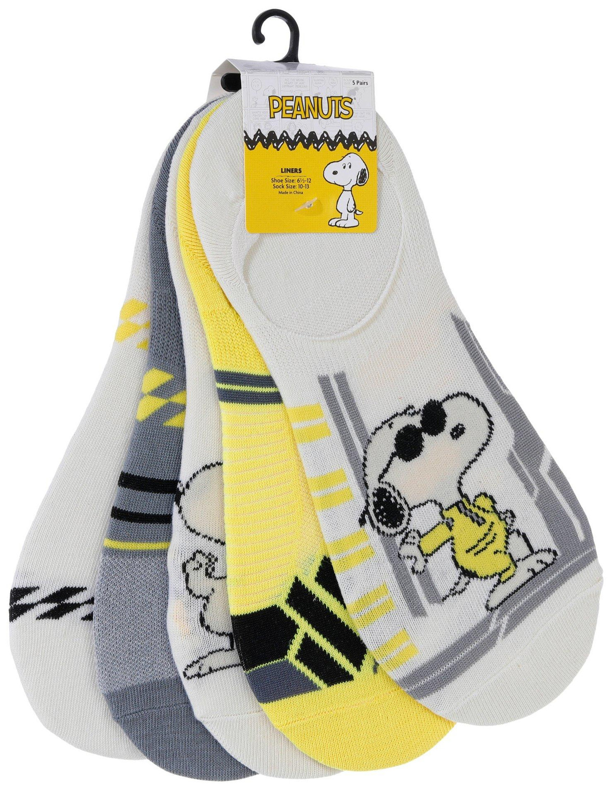 5-pairs of Mens Liners socks; each with a different design featuring Snoopy and other Peanuts characters! The socks are made of a lightweight and breathable material. They are designed to minimize friction and regulate temperature, making them comfortable for everyday wear. Fabrication is 98% polyester, 2% spandex. Mens shoe size 6.5-12. Sock size 10-13.