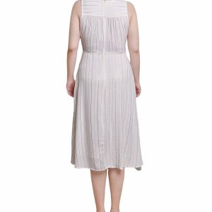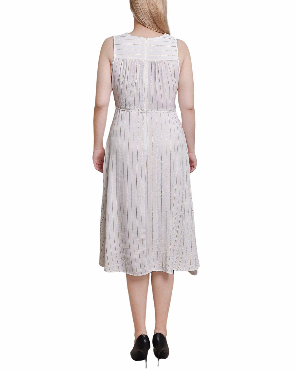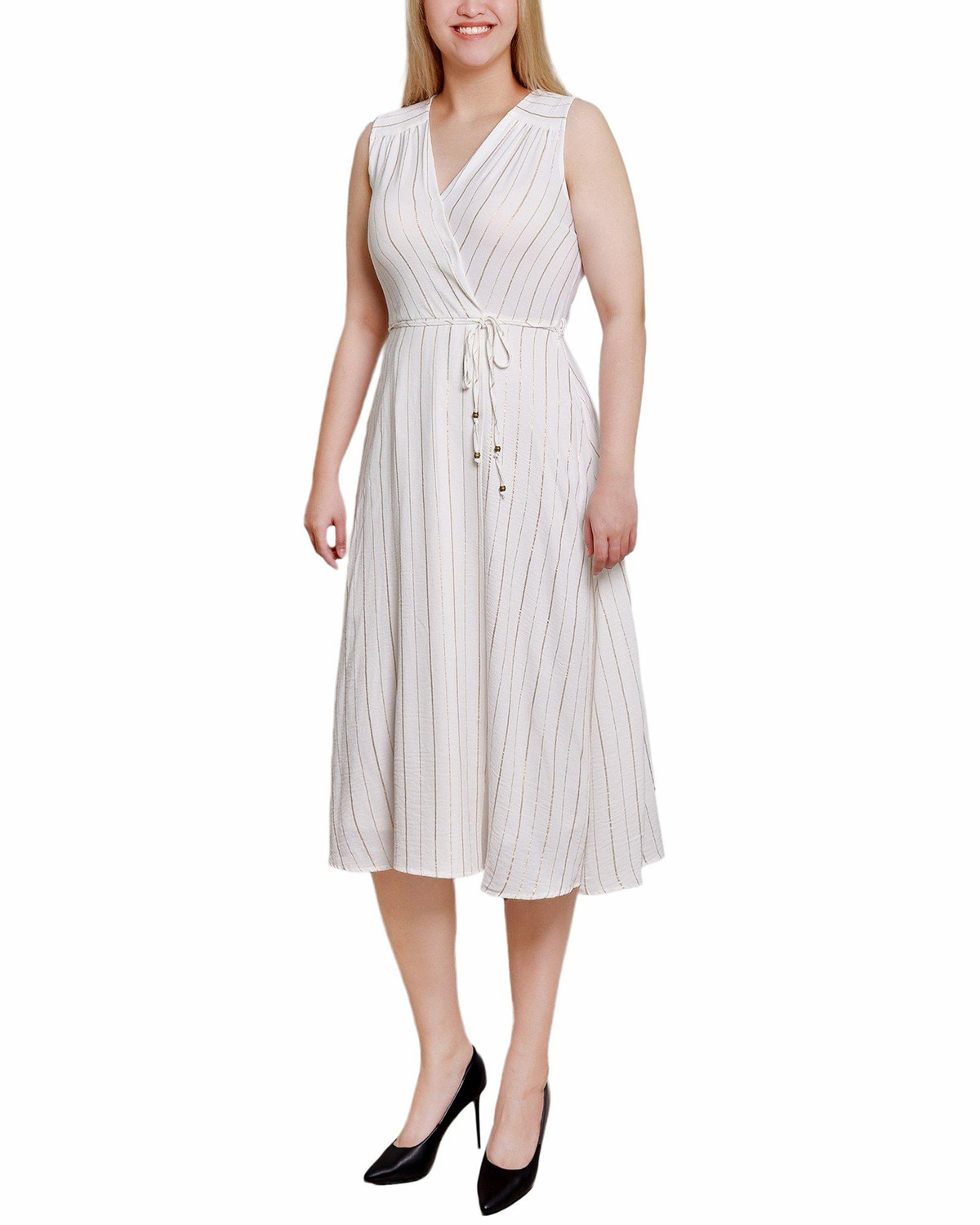 Elevate your wardrobe with this classic sleeveless dress from NY Collection, featuring elegant vertical metallic gold stripes. The sophisticated faux wrap styling and lightly textured fabric create a refined look, perfect for both work and dining out. Fully lined for comfort, this dress combines timeless design with modern flair, making it a versatile addition to any closet. Length measures approximately 45 in. Fabrication 100% polyester.