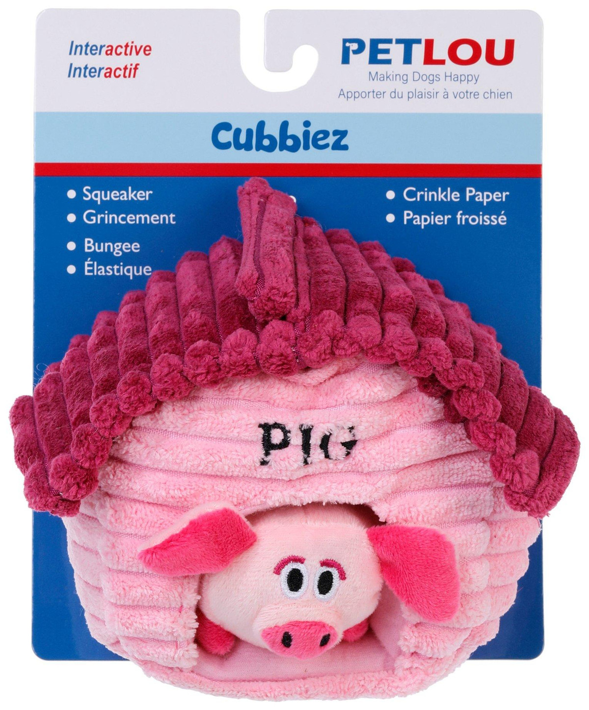 Bring interactive fun to playtime with the Cubbiez Pig Dog Toy, crafted from soft, colorful fabric with embroidered eyes for safe, worry-free play. This playful set includes a pig pen and a pig, attached with a bungee fabric, featuring a squeaker inside the pig and crinkle fabric in the pen to keep dogs engaged. Perfect for tugging, tossing or cuddling, it adds sound, texture and charm to your pups toy collection. Measures approximately 6 in x 6 in x 5 in.