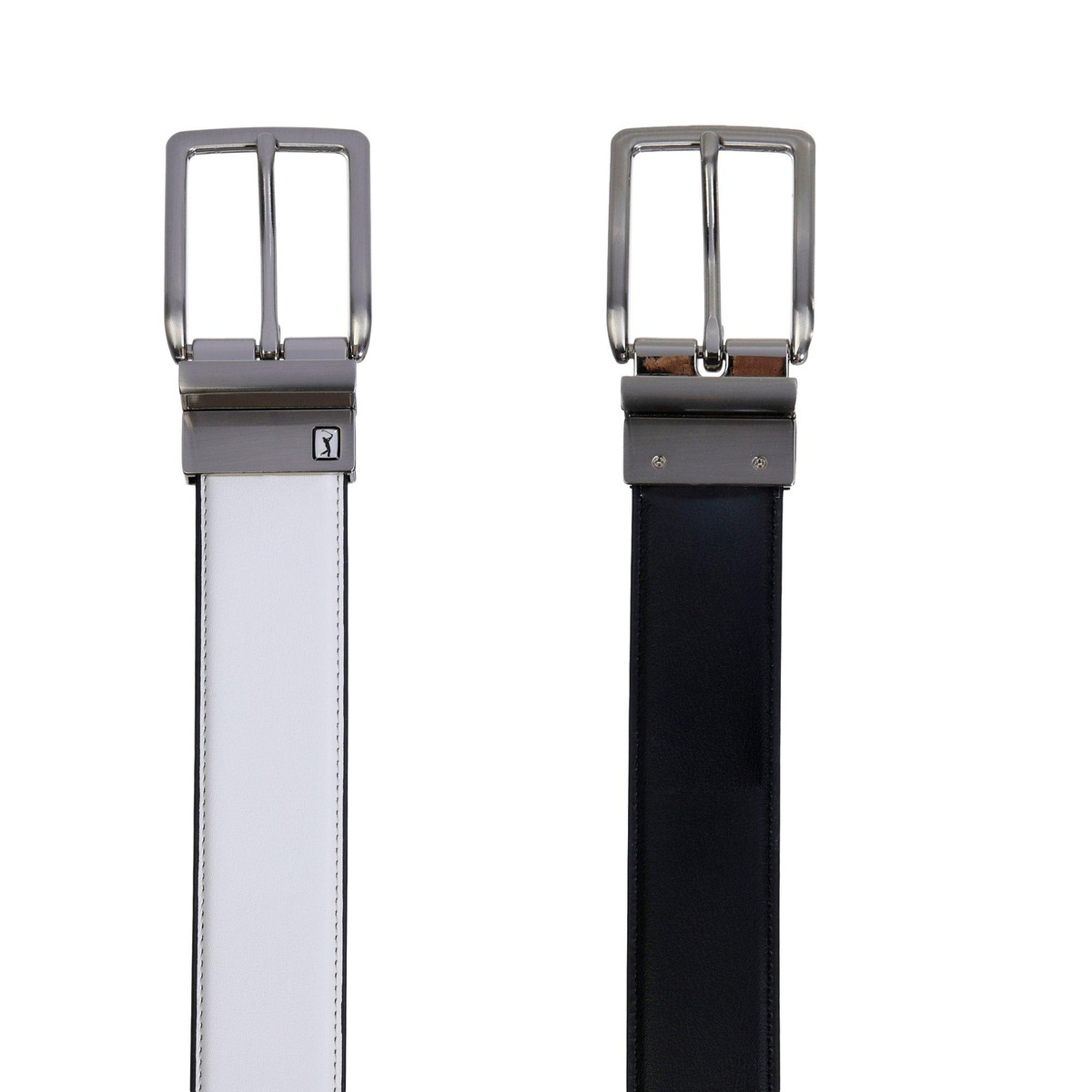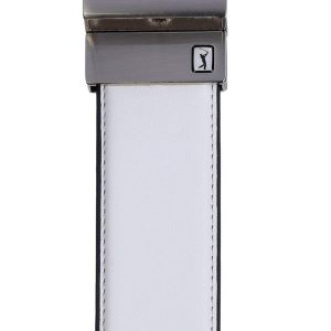 This PGA Tour belt offers comfort and versatility with a flexible fit and reversible design. Switch effortlessly from white to black to match any outfit. Finished with sleek silver tone hardware, it delivers a polished look on and off the course.
