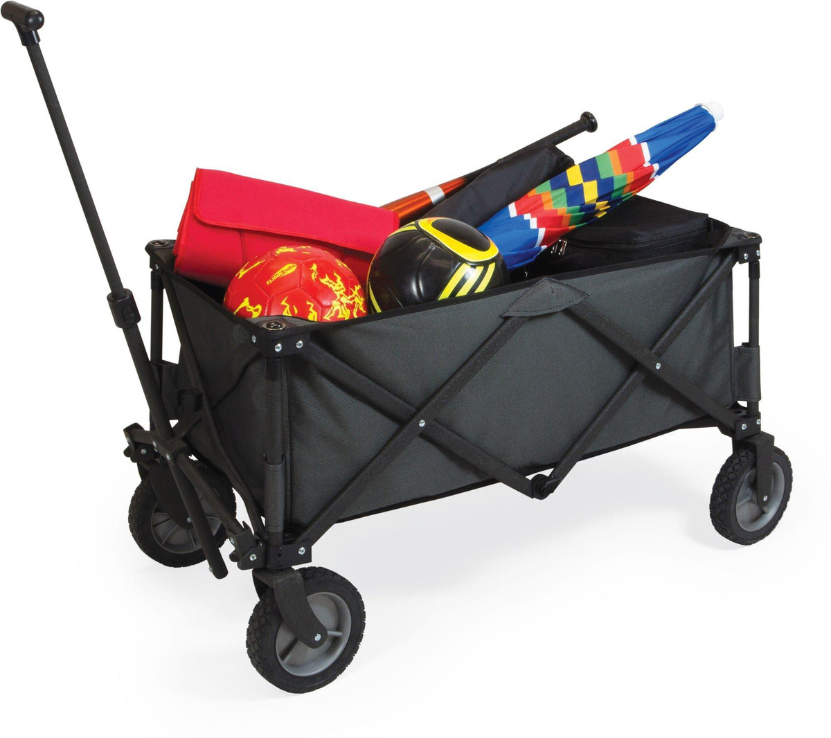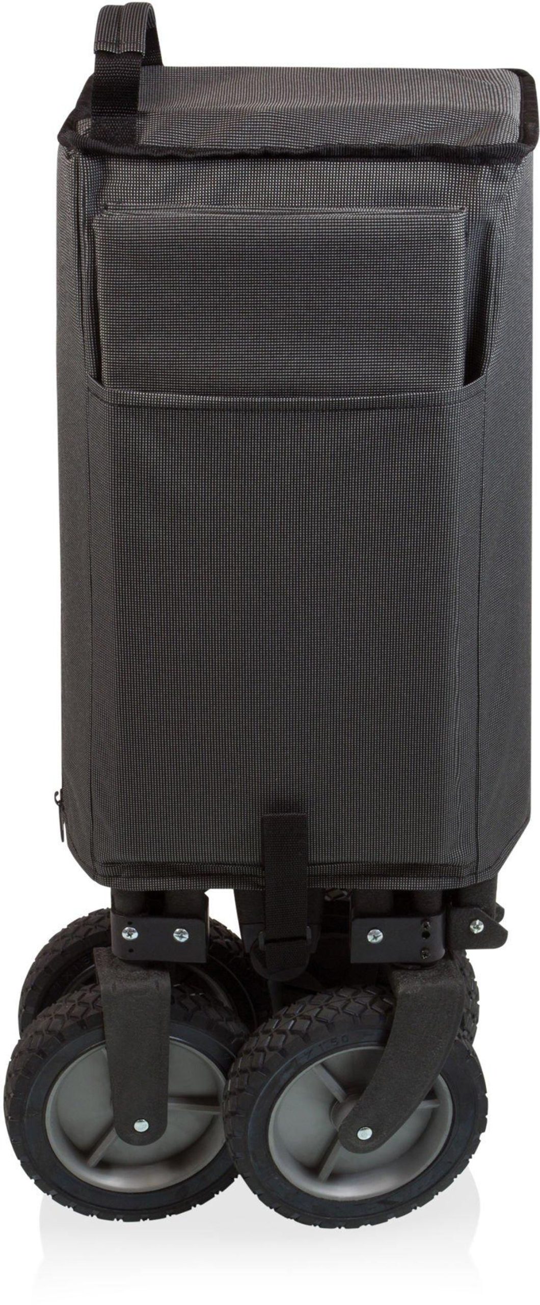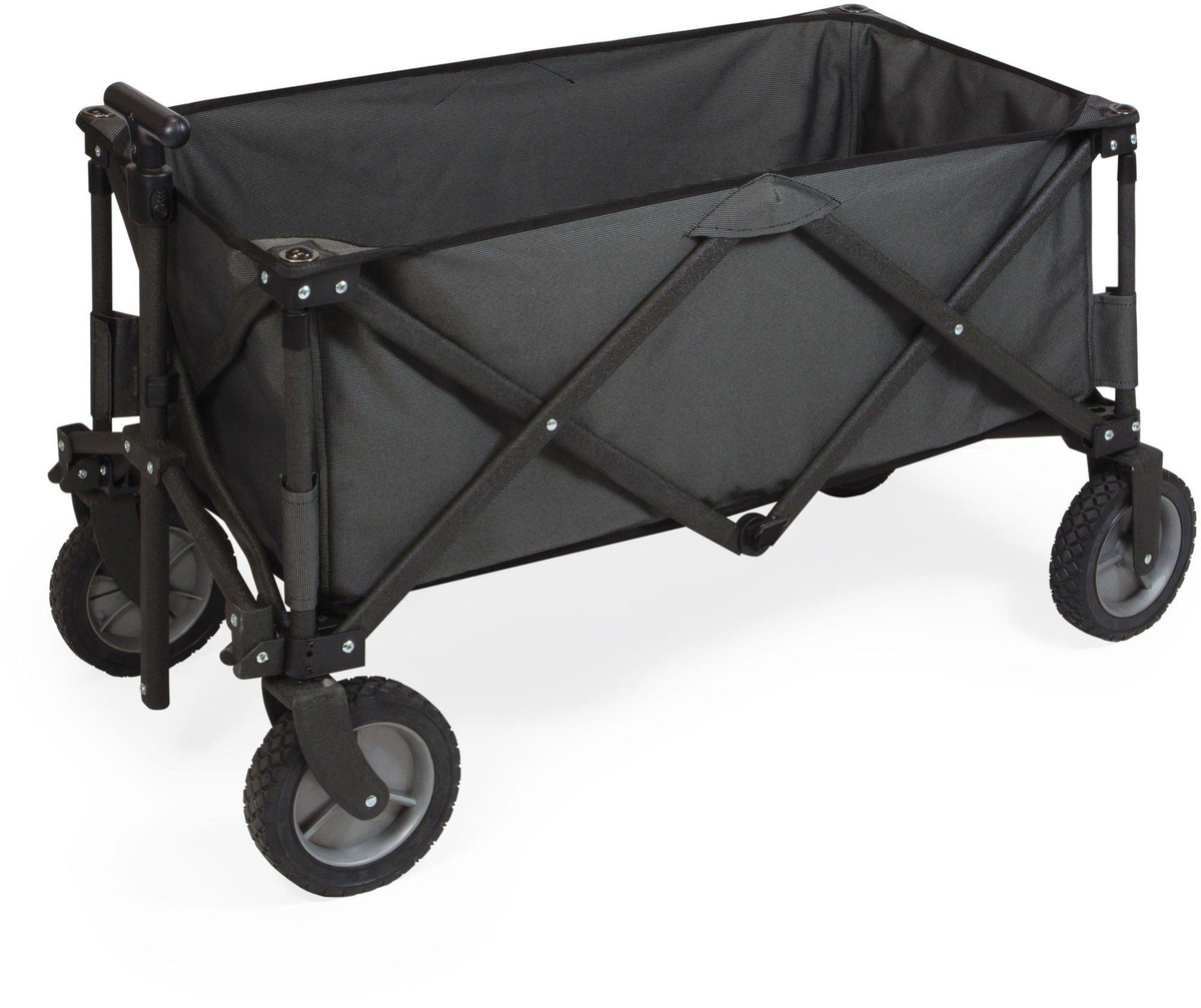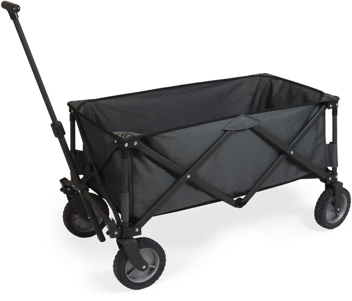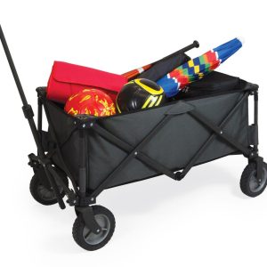 The Adventure Wagon is a utility wagon with heavy-duty wheels & telescopic handle that folds into a compact size and includes a fitted cover. Made of 600D polyester with a powder coated steel frame. Measures: 35.6” x 18.9” x 21.9” open, 10” x 11” x 30” closed. Perfect for tailgating at your favorate sporting event: NCAA, NFL, MLB. Great for the beach or outings wtih the kids.