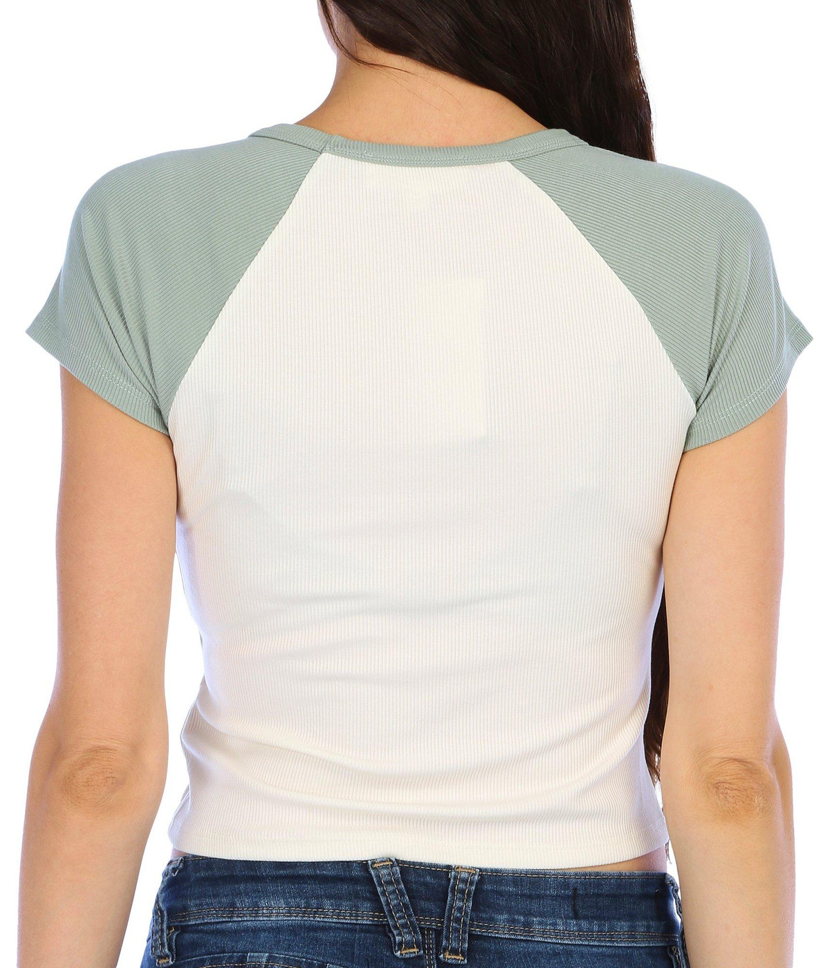 This short sleeve top features a raglan-style design on lightweight ribbed knit fabric, a round neckline, and classic fit. Top length measures approximately 18 in. Fabrication 92% modal, and 8% spandex.