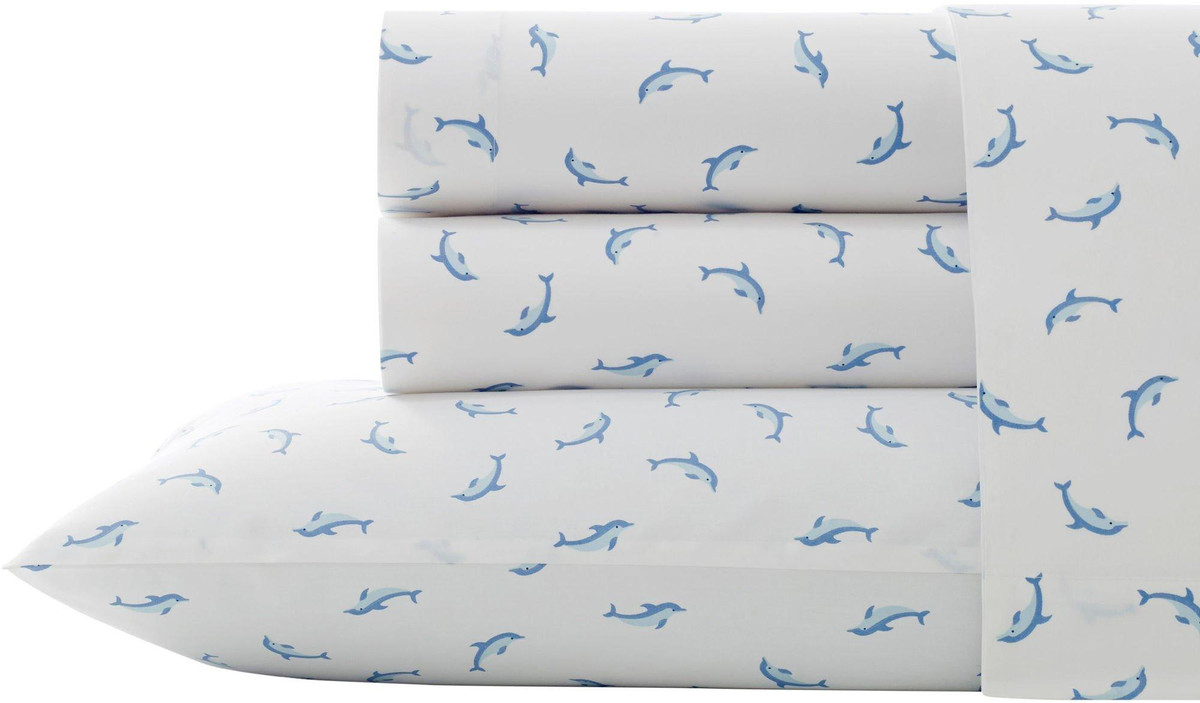 Leaping dolphins in classic blues on a white ground make a graceful foulard mini print that will blend easily with any of the Poppy & Fritz solid color or printed bedding sets. Fully elasticized Twin and Twin XL fitted sheet fits mattresses up to 13” deep. Full size fits up to 14” deep and Queen size fits up to 15” deep. Set includes flat sheet, fitted sheet, and 2 pillowcases (1 twin/twin xl).
